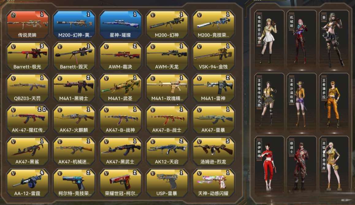 【云游堂】 【可二次实名】热门武器应有尽有,所有种类的狙都有!灵眸/幻神/星神/裁决/vsk94金蚀/毁灭!蝴蝶刀/usp/柯尔特/8套手雷/famasg2天戎/雷神/黑骑士/qbz/火麒麟!rnvka 号 【呛王4】【lv.100 元首】vip6 135v,10王者,2炫金,传说灵眸/幻神黄忠/星神璀璨/毁灭bean/毁灭战神张飞/毁灭星空/毁灭呛娘/毁灭青帝/极光能量核心/天龙传奇70kg/天龙传奇白鲨/_葵/电竞教官-云悠悠/机械姬/战地猎狐/m200-幻神/m200-竞技荣光/barrett-毁灭/barrett-极光(3)/王者之怒-觉醒版(2)/竞技荣光套装/雷暴套装/m4a1-黑骑士音效卡/m4a1-雷神音效卡/barrett-毁灭音效卡(截图展示段位不代表实际段位,如赛季更新等不可抗拒因素发生变化、时限道具不保证所剩时间,其余道具看截图或咨询客服)dnf还连体6个11,2个10。十多套追忆天空和龙袍