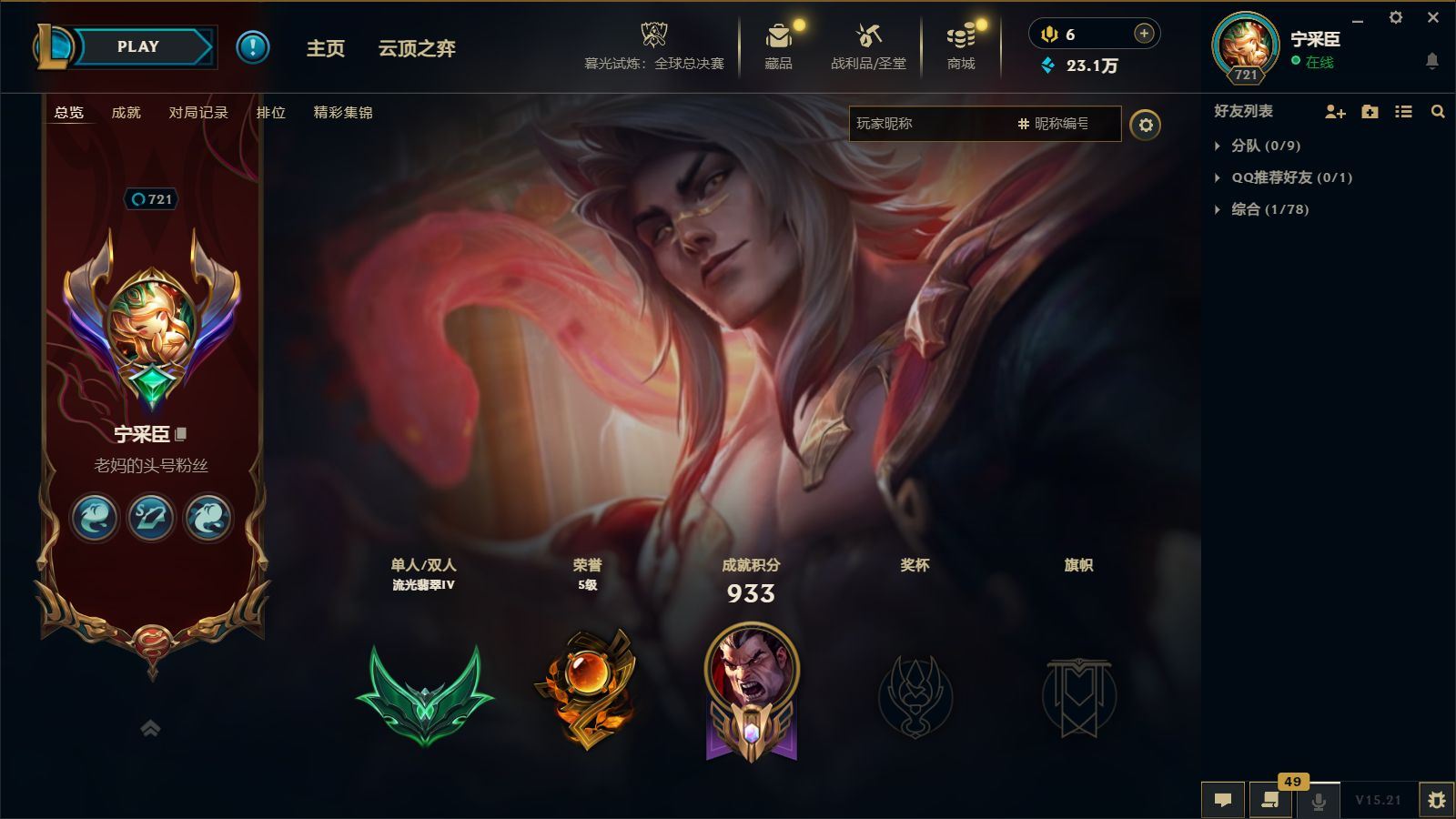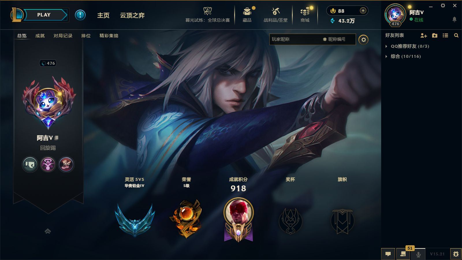【云游堂】 【可二次实名】【kf2255恕瑞玛 单双排段位:不屈白银 英雄数量:170 皮肤数量:244 炫彩数量:41 臻彩数量:5 神话数量:4 云顶神话数量:0 游戏点:210 神话精粹:4 蓝色精萃:50993 橙色精粹:4392 钥匙:1 宝箱:0 【重要头像】披萨鸡 【重要皮肤】星之守护者塔莉垭 胜利剑圣易 胜利女神娑娜 胜利巨口克格莫 星之守护者佐伊 天龙之子斯莫德 圣诞老人布隆 冰雪女神辛德拉 魄罗骑士瑟庄妮 泳池派对佐伊 泳池派对蕾欧娜 iG卡蜜尔 iG卡莎 SKTT1雷克顿 暗杀星蒙多 暗杀星努努和威朗普 冰雪节辛吉德 防暴士兵辛吉德 防暴天使尔 钢铁之翼艾尼维亚 密林猎手提莫 圣诞精灵崔丝塔娜 圣诞玩偶波比 无头骑士赫卡里姆 雪装奈德丽 野兽猎人瑟庄妮 阿木木主人不要我了 都铎王朝图奇 十五周年纪念希维尔 十周年纪念安妮 源代码乐芙兰 【传说皮肤】源计划联合艾希 青花瓷伊泽瑞尔 鬼魂新娘莫甘娜 提莫约德尔人的一大步 魔幻卡牌崔斯特 未来战士特琳 驯龙学者黑默丁格 焰尾妖狐阿狸 战地巨兽科加斯 宇航员诺提勒斯 女皇艾希 战场女武神尔 恶魔男爵瑞兹 第三类接触黑默丁格 符文战熊沃利贝尔 大天使长米迦勒尔 律政大亨蒙多 铁哥们儿奥拉夫 地狱之门卫士加里奥 红色男爵库奇 驯龙炮手崔丝塔娜 【重要炫彩】无畏骑士瑟庄妮赤子初心 灵魂莲华亚索霜见 可爱可爱粉红红布里茨 净雪之月莫甘娜冬虹 源代码乐芙兰梦幻闪击 光明哨兵派克虚无抗击者 魔女阿卡丽虚荣】