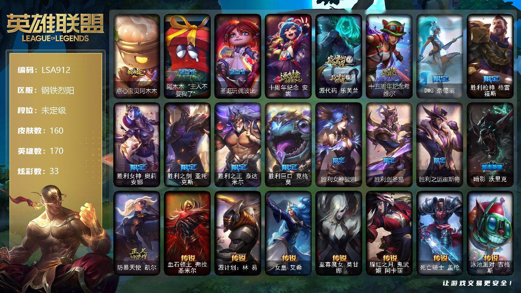 【云游堂】 【可二次实名】【lsa912】170英雄/160皮肤/3神话/15限定/3臻彩/33炫彩/11传说/59史诗/未定级账号等级:238/无畏骑士瑟庄妮赤子初心/玉剑传说无劫胭脂/魔女阿卡丽虚荣/点心宝贝阿木木/阿木木“主人不要我了”/圣诞玩偶波比/十周年纪念安妮/源代码乐芙兰/十五周年纪念希维尔/dwg奈德丽/胜利呛神格雷福斯/胜利女神奥莉安娜/胜利之剑亚托克斯/胜利之王泰达米尔/胜利巨口克格莫/胜利女神娑娜/胜利剑圣易/胜利之运崔斯特/暗影沃里克/防暴天使凯尔/双城之战2微光实验室辛吉德/血石领主弗拉基米尔/源计划林易/女皇艾希/至尊魔女莫甘娜/腥红之月鬼武姬阿卡丽/死亡骑士盖伦/泳池派对吉格斯/霸天异形卡兹克/灌篮高手德莱厄斯/西部魔影卢锡安/源计划毁灭派克/铁钩船长费德提克/圣光审判凯尔/天人合一易/战场公主希维尔/兔宝宝提莫/紫晶射手艾希/死神卡尔萨斯/卡尔萨斯祸害之光/小小骑士阿木木/熔火之心拉莫斯/战争血统蒙多/海克斯科技迦娜/星之守护者迦娜/穿着正装的恶魔维迦/北领前线斯维因/古墓丽影凯特琳/铁血狙击手凯特琳/黑曜石守护者墨菲特/海贼魅影卡特琳娜/前线指挥官卡特琳娜/蓝焰梦魔魔腾/符文战神雷克顿/龙骑统帅嘉文四世/三昧真火孙悟空/灵魂烈焰布兰德/至高之拳李青/血色之锤波比/飞车暴走族古拉加斯/钢铁意志潘森/至高君王玛尔扎哈/腥红之月泰隆/血色精锐锐雯/帝王斑蝶克格莫/侏罗纪化石克格莫/odst地狱伞兵拉克丝/铁血猎人雷恩加尔/奥术大师吉格斯/绞肉机刽子手德莱文/永恒之森赫卡里姆/死亡绽放卡兹克/铁血帝皇德莱厄斯/生化骑士德莱厄斯/无限烈焰黛安娜/亚特兰蒂斯辛德拉/野火之藤婕拉/最后一只恐龙纳尔/邪恶魔人扎克/西部牛仔亚索/源计划风亚索/腥红之月亚索/五星大厨塔姆/职业杀手卢锡安/源计划雷卢锡安/冲击之刃劫/霓虹杀拳蔚/霸天剑魔亚托克斯/幽冥领主阿兹尔/腥红之月锤石/冰雪游神巴德/五杀摇滚女声主唱凯尔/暗影易/斗牛士阿利斯塔/后场堡垒阿利斯塔/部落精神瑞兹/蕉泥座人索拉卡/约德尔海贼团崔丝塔娜/古神沃里克/荒野巨兽努努和威朗普/勇敢的心艾希/宗师级钓鱼训练师贾克斯/杀戮天使昔拉莫甘娜/机械污染辛吉德/冲浪高手辛吉德/黑色天灾辛吉德/黑金诱惑图奇/横行霸道图奇/欧米伽小队毒针狙击手/西部魔影送葬人图奇/恐怖之源萨科/硬汉蒙多/老兵普朗克/昔日霸主普朗克/宇航员库奇/奥德赛卡尔玛/绿水晶光辉塔里克/垃圾场特朗德尔/戴一个表布里茨/珊瑚礁墨菲特/奥德赛墨菲特/腥红之月卡特琳娜/烈焰古树茂凯/黑色玫瑰假面舞会伊莉丝/战斗学院孙悟空/末日余生布兰德/独眼海盗兰博/武力全开乌迪尔/地狱送葬约里克/足球宝贝阿卡丽/源计划暗影阿卡丽/战神阿瑞斯盖伦/魔灵玛尔扎哈/未来战士锐雯/游侠法师拉克丝/风纪委员阿狸/永恒之森阿狸/失落大陆菲兹/坚韧不屈沃利贝尔/夜魔水晶韦鲁斯/觅心射手韦鲁斯/韦鲁斯迅箭/地底迷城诺提勒斯/全金属狂潮维克托/造物主维克托/小蜜蜂吉格斯/邪恶女巫璐璐/灵魂收割者德莱文/热血班长德莱厄斯/双城之战杰斯/圣龙奥瑞利安索尔/鬼影森森婕拉/星之守护者萨勒芬妮/狂狮纳尔/源计划升华烬/海牛大大塔姆/福牛守护者佛耶戈/狗粮克烈/玉剑传说寒潭夭夭/深渊恐惧锤石/泳池派对雷克塞/咖啡甜心巴德/怨之砂派克