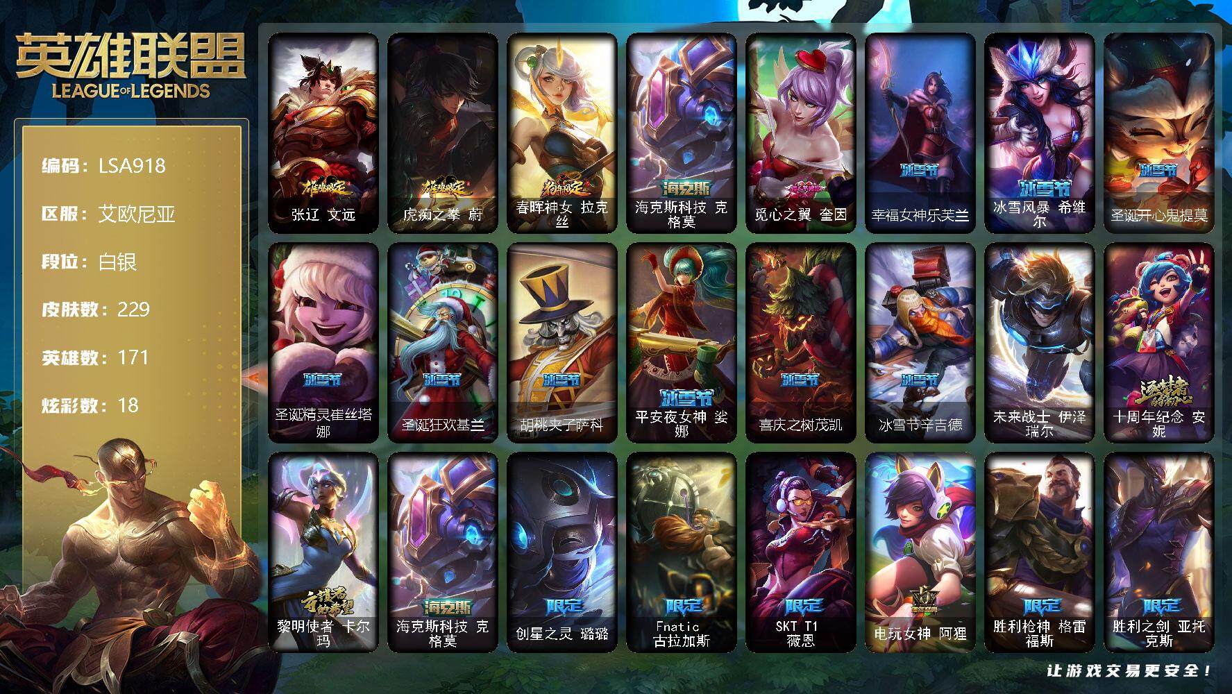 【云游堂】 【可二次实名】【lsa918】171英雄/229皮肤/1终极/3神话/33限定/18炫彩/18传说/76史诗/白银账号等级:436/张辽文远/虎痴之拳蔚/春晖神女拉克丝/海克斯科技克格莫/觅心之翼奎因/幸福女神乐芙兰/冰雪风暴希维尔/圣诞开心鬼提莫/圣诞精灵崔丝塔娜/圣诞狂欢基兰/胡桃夹子萨科/平安夜女神娑娜/喜庆之树茂凯/冰雪节辛吉德/未来战士伊泽瑞尔/十周年纪念安妮/黎明使者卡尔玛/创星之灵璐璐/fnatic古拉加斯/sktt1薇恩/电玩女神阿狸/胜利呛神格雷福斯/胜利之剑亚托克斯/胜利女神瑟庄妮/胜利凤凰艾尼维亚/胜利巨口克格莫/海贼瑞兹/外星装甲库奇/野兽猎人德莱文/勇者阿狸/勇者奈德丽/电玩战魂赫卡里姆/都铎王朝图奇/御星魔矢艾希/防暴士兵辛吉德/防暴天使凯尔/惊悚派对费德提克/魔幻卡牌崔斯特/女皇艾希/源计划联合艾希/绅士科加斯/战地巨兽科加斯/黯晶凤凰艾尼维亚/陆地王者4wd布里茨/银河魔装机神兰博/炼狱魔犬内瑟斯/战斗学院伊泽瑞尔/腥红之月鬼武姬阿卡丽/枯萎之壤泽拉斯/苍穹之光韦鲁斯/泳池派对吉格斯/霸天异形卡兹克/黑夜使者亚索/暗星尊烬/西部魔影卢锡安/腥红之月崔斯特/摄魂男爵弗拉基米尔/重生之沙费德提克/圣光审判凯尔/铁血剑豪易/战场公主希维尔/圣洁化身索拉卡/火箭达人崔丝塔娜/火牙狼人沃里克/法国皇室厄运小姐/紫晶射手艾希/国王泰达米尔/少林武僧贾克斯/侏罗纪化石科加斯/熔火之心拉莫斯/战争血统蒙多/夜刃艾瑞莉娅/海克斯科技迦娜/寒冰女皇迦娜/恐惧新星普朗克/血石诅咒塔里克/穿着正装的恶魔维迦/抵抗军天使凯特琳/古墓丽影凯特琳/铁血狙击手凯特琳/霸天巨兽墨菲特/海贼魅影卡特琳娜/符文战神雷克顿/腥红之月伊莉丝/至高之拳李青/屠龙勇士薇恩/苍穹之光薇恩/法老王朝内瑟斯/四神之力乌迪尔/血色之锤波比/大夏武士潘森/实习护士阿卡丽/铁血女忍阿卡丽/铁甲雄心盖伦/钢铁烈阳蕾欧娜/至高君王玛尔扎哈/刺客信条锐雯/兔女郎锐雯/帝王斑蝶克格莫/深海怪鱼克格莫/侏罗纪化石克格莫/腥红之月鬼武者慎/战国大名慎/钢之逆鳞希瓦娜/银河魔装机神希瓦娜/暗影妖狐阿狸/源计划火菲奥娜/驯龙女巫璐璐/死亡绽放卡兹克/铁血帝皇德莱厄斯/生化骑士德莱厄斯/天启骑士杰斯/源代码丽桑卓/腥红之月黛安娜/血羽凤凰奎因/亚特兰蒂斯辛德拉/最后一只恐龙纳尔/源计划风亚索/腥红之月亚索/苍穹之光维克兹/弗雷尔卓德塔莉垭/猛虎布隆/源计划雷卢锡安/爵士克烈/时之砂艾克/霸天剑魔亚托克斯/锦鲤娜美/河水之灵娜美/腥红之月锤石/冰雪游神巴德/暮星之羽霞/冰河时代奥拉夫/钢铁终结者赛恩/嗜血狂暴沃里克/小红帽安妮/风执事加里奥/深渊巨蟹厄加特/弗拉基米尔伯爵/弗拉基米尔侯爵/金牛座阿利斯塔/斗牛士阿利斯塔/原野伐木工赛恩/森林女神索拉卡/欧米伽小队魔鬼伞兵/丧尸努努和威朗普/梦魇泰达米尔/杀戮天使昔拉莫甘娜/嘻哈精神基兰/科学狂人辛吉德/黑暗女王伊芙琳/假面女皇伊芙琳/探戈灵魂伊芙琳/惊天魔盗伊芙琳/首领图奇/北风冻原图奇/横行霸道图奇/幽灵幻影卡尔萨斯/自由女神卡尔萨斯/五杀摇滚主唱卡尔萨斯/梦魇科加斯/王子不是我阿木木/铬金铠甲拉莫斯/忍龟拉莫斯/千纸凤凰艾尼维亚/小丑工作坊萨科/泳池派对蒙多/缪斯女神娑娜/莲花之令艾瑞莉娅/源计划正义艾瑞莉娅/暴风女神迦娜/玉剑传说风仙子/幽灵船长普朗克/柯基库奇/日冕女神卡尔玛/樱花乱舞卡尔玛/灰胡子魔法师维迦/里尔击球手特朗德尔/海贼参谋斯维因/电玩女神凯特琳/钢铁之门布里茨/烈焰古树茂凯/图腾古树茂凯/猛龙雷克顿/灵魂莲华薇恩/废土男爵兰博/荒漠之咬卡西奥佩娅/蛇发女妖卡西奥佩娅/沙暴巨蝎斯卡纳/远土之灵斯卡纳/丛林猎豹奈德丽/法国女仆奈德丽/银河魔装机神奈德丽/武力全开乌迪尔/品酒大师古拉加斯/美酒节特使古拉加斯/狂热球迷古拉加斯/英仙座珀尔修斯潘森/冒险精神伊泽瑞尔/龙骑士莫德凯撒/刺身之拳阿卡丽/空手道凯南/超级英雄凯南/烧烤女神蕾欧娜/暗影王子玛尔扎哈/魔灵玛尔扎哈/毛毛虫克格莫/极寒慎/奈落之炎慎/战地法师泽拉斯/北地风暴沃利贝尔/雷喵喵尔/夜魔水晶韦鲁斯/地底迷城诺提勒斯/死亡骑士瑟庄妮/传统造型瑟庄妮/瑟庄妮逐晓者/玉剑传说无双/少校吉格斯/邪恶女巫璐璐/热血班长德莱厄斯/星之守护者辛德拉/鬼影森森婕拉/kda卡莎/银河魔装机神纳尔/灵魂莲华亚索/这货不是维克兹/源代码娜美/深渊恐惧锤石/抵抗军炎魔俄洛伊