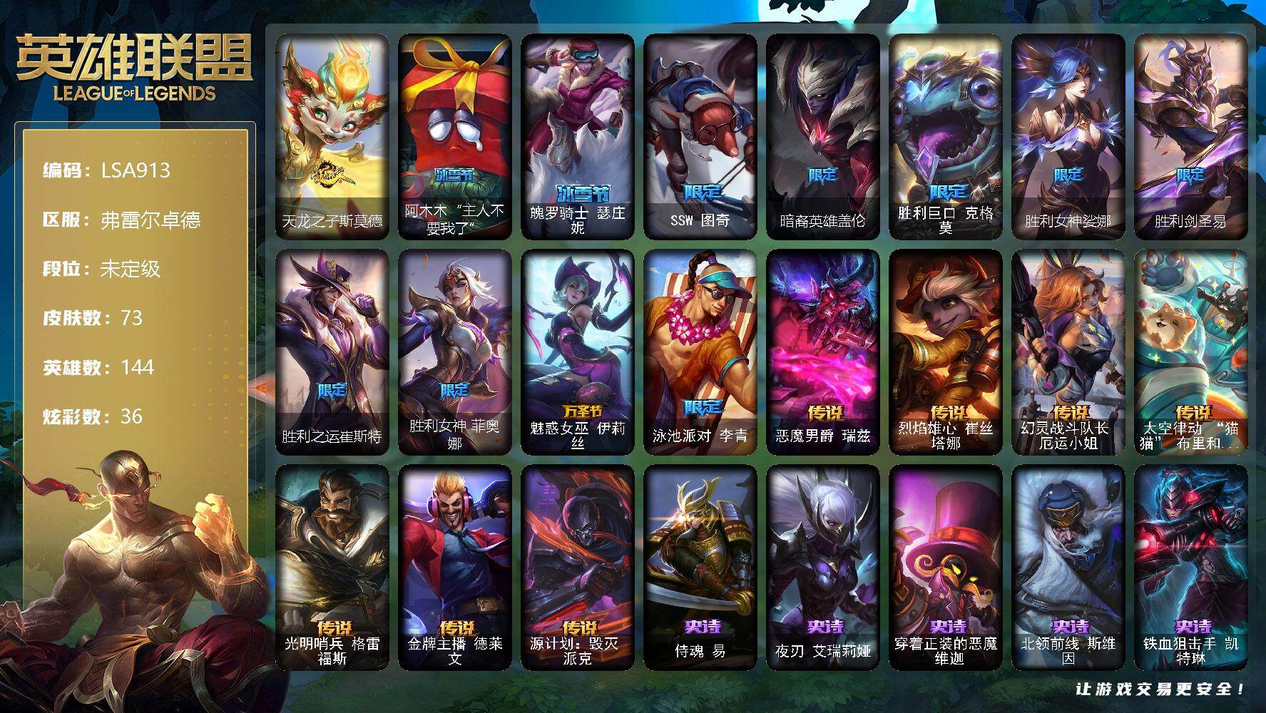 【云游堂】 【可二次实名】【lsa913】144英雄/73皮肤/12限定/4臻彩/36炫彩/7传说/17史诗/未定级账号等级:274/无畏骑士瑟庄妮赤子初心/冠军典狱长锤石凯旋圣装/源计划毁灭派克幻灭/源计划火菲奥娜惩戒/天龙之子斯莫德/阿木木“主人不要我了”/魄罗骑士瑟庄妮/ssw图奇/暗裔英雄盖伦/胜利巨口克格莫/胜利女神娑娜/胜利剑圣易/胜利之运崔斯特/胜利女神菲奥娜/魅惑女巫伊莉丝/泳池派对李青/恶魔男爵瑞兹/烈焰雄心崔丝塔娜/幻灵战斗队长厄运小姐/太空律动猫猫布里和里茨/光明哨兵格雷福斯/金牌主播德莱文/源计划毁灭派克/侍魂易/夜刃艾瑞莉娅/穿着正装的恶魔维迦/北领前线斯维因/铁血狙击手凯特琳/沙漠风暴卡特琳娜/源计划雄心卡特琳娜/死亡绽放伊莉丝/暗星奥莉安娜/深海妖姬卡西奥佩娅/至高君王玛尔扎哈/战地机甲克格莫/夜鸦菲奥娜/生化骑士德莱厄斯/亚特兰蒂斯辛德拉/源计划雷卢锡安/爵士克烈/亮丽女神希维尔/银河魔装机神安妮/赵云子龙/西部魔影厄加特/弗拉基米尔侯爵/黑潮弗拉基米尔/森林女神索拉卡/欧米伽小队魔鬼伞兵/北风冻原图奇/翼龙艾尼维亚/凤凰星神艾尼维亚/珊瑚礁墨菲特/哥特女仆奥莉安娜/黑夜使者内瑟斯/战斗学院盖伦/虚空执事玛尔扎哈/幻灵战斗兔锐雯/战斗教授格雷福斯/失落大陆菲兹/绒毛菲兹/觅心射手韦鲁斯/灵魂收割者德莱文/黑潮黛安娜/净雪之月凯隐/kdaallout卡莎/真实伤害亚索/黑帮管家布隆/山海绘卷烬/国王佛耶戈/德玛西亚警官卢锡安/灵能特工劫/春晖神女奇亚娜/春晖大帝锤石/古神艾翁/绝息圣堂洛/女帝芮尔/腥红之月派克