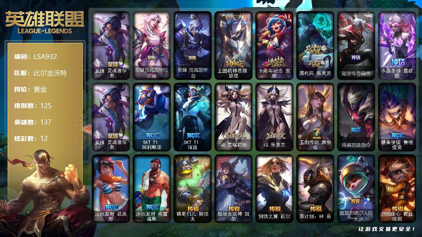 【云游堂】 【lsa932】137英雄/125皮肤/7神话/10限定/2臻彩/12炫彩/22传说/27史诗/黄金账号等级:192/至臻灵魂莲华易/至臻灵魂莲华拉克丝/至臻灵魂莲华劫/战斗学院卡特琳娜盛典礼服/王国机神苍狼瑟提/十周年纪念安妮/源代码乐芙兰/殿堂传奇薇恩/水晶圣骑蕾欧娜/sktt1阿利斯塔/sktt1瑞兹/ig艾瑞莉娅/ig乐芙兰/玉剑传说舞剑仙/暗裔英雄盖伦/糖果使徒费德提克/泳池派对菲奥娜/泳池派对格雷福斯/铁哥们儿奥拉夫/战场女武神凯尔/钢铁之翼凯尔/源计划林易/提莫约德尔人的一大步/烈焰雄心崔丝塔娜/驯龙炮手崔丝塔娜/源计划联合艾希/冰川巨兽墨菲特/源计划净化薇恩/青花瓷伊泽瑞尔/黎明使者锐雯/焰尾妖狐阿狸/宇航员诺提勒斯/霸天异形卡兹克/黑夜使者亚索/西部天使赛娜/西部魔影卢锡安/天煞劫/真实伤害艾克/暗星锤石/星之守护者霞/特战先锋赵信/圣洁化身索拉卡/火箭达人崔丝塔娜/掠星魔刃卡萨丁/源计划雄心卡特琳娜/腥红之月伊莉丝/至高之拳李青/深海妖姬卡西奥佩娅/四神之力乌迪尔/实习护士阿卡丽/至高君王玛尔扎哈/深海怪鱼克格莫/虚空海灵菲兹/暗星韦鲁斯/皇家守卫菲奥娜/奥术大师吉格斯/暗星卡兹克/天启骑士杰斯/勇敢的心奎因/西部牛仔亚索/源计划风亚索/职业杀手卢锡安/源计划雷卢锡安/炼狱魔女蔚/霸天剑魔亚托克斯/幽冥领主阿兹尔/虚空使者俄洛伊/屠龙勇士奥拉夫/五杀摇滚iii遗失的章节奥拉夫/探戈灵魂崔斯特/逍遥赌侠崔斯特/黑潮弗拉基米尔/小恶魔崔丝塔娜/神龙尊者苍龙艾希/勇敢的心泰达米尔/梦魇泰达米尔/玉剑传说苍鸾/遗迹守护者基兰/黑色天灾辛吉德/kda伊芙琳/泳池派对图奇/尼斯巨兽科加斯/暗星萨科/地下都市梦魇萨科/虚空前世卡萨丁/莲花之令艾瑞莉娅/女帝迦娜/黎明使者迦娜/老兵普朗克/神龙尊者宁静之龙卡尔玛/战斗学院卡特琳娜/腥红之月卡特琳娜/屠龙勇士嘉文四世/黑色玫瑰假面舞会伊莉丝/战斗学院孙悟空/冒险精神伊泽瑞尔/足球先生伊泽瑞尔/kda阿卡丽/源计划暗影阿卡丽/泰隆黑木/玉剑传说武剑仙/电格莫/失落大陆诺提勒斯/星界圣骑诺提勒斯/灵能特工维克托/睡衣守护者璐璐/最高清算德莱文/奥德赛卡兹克/西部魔影德莱厄斯/战斗学院杰斯/屠龙勇士黛安娜/摄魂猎手凯隐/电玩女神卡莎/战场boss亚索/真实伤害赛娜/正义假面赛娜/真实伤害奇亚娜/女帝奇亚娜/源代码娜美/深渊恐惧锤石/灵魂莲华艾翁/黑夜使者厄斐琉斯/战斗学院永恩/心之钢永恩/神龙尊者炎龙瑟提