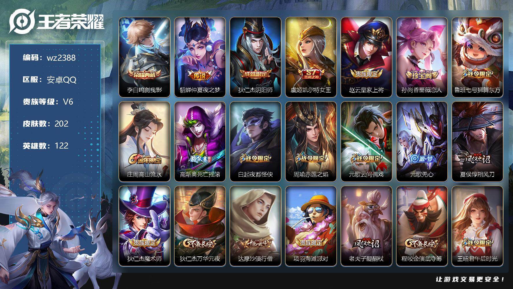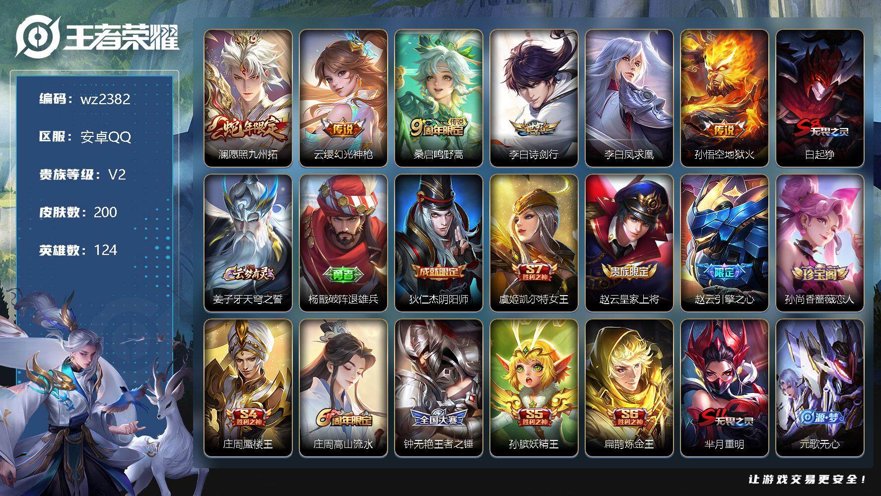 【云游堂】 【可二次实名】【wz2382】安卓Q-V2-至尊星耀V段位-124英雄-200皮肤-0典藏-0珍品无双-0无双-0珍品传说-6传说-44史诗 【传说皮肤】:澜愿照九州拓,云缨幻光神枪,桑启鸣野蒿,李白诗剑行,李白凤求凰,孙悟空地狱火 【限定皮肤】:白起狰,姜子牙天穹之誓,杨戬破阵退雄兵,狄仁杰阴阳师,虞姬凯尔特女王,赵云皇家上将,赵云引擎之心,孙尚香蔷薇恋人,庄周蜃楼王,庄周高山流水,钟无艳王者之锤,孙膑妖精王,扁鹊炼金王,芈月重明,元歌无心,夏侯惇朔风刀,曹操烛龙,典韦穷奇,狄仁杰魔术师,狄仁杰万华元夜,达摩沙漠行僧,项羽海滩派对,老夫子醍醐杖,关羽冰锋战神,程咬金演武夺筹,兰陵王金庭之子,亚瑟狮心王,牛魔御旌,李元芳云中旅人,钟馗驱傩正仪,雅典娜黎明之约,太乙真人饕餮,鬼谷子原初探秘者,鬼谷子五谷丰年,苏烈千军破阵,百里玄策原初追逐者,弈星混沌棋,梦奇顽趣,沈梦溪大漠名商,明世隐疑决卦,裴擒虎李小龙,裴擒虎擒涛扼浪,狂铁御狮,米莱狄御霄,盾山御銮,上官婉儿梁祝,鲁班大师探海日志,桑启海盐诗旅,艾琳女武神,阿古朵江河有灵,张良古海寻踪,鬼谷子天穹祈灯,刘邦剑破天穹,程咬金群星魔术团,周瑜熔金海岸 【年限皮肤】:李白凤求凰,马超神威 【赛季限定】:庄周蜃楼王,孙膑妖精王,扁鹊炼金王,白起狰,芈月重明,夏侯惇朔风刀,曹操烛龙,典韦穷奇,狄仁杰万华元夜,达摩沙漠行僧,老夫子醍醐杖,程咬金演武夺筹,兰陵王金庭之子,张良古海寻踪,亚瑟狮心王,牛魔御旌,李元芳云中旅人,虞姬凯尔特女王,钟馗驱傩正仪,雅典娜黎明之约,太乙真人饕餮,鬼谷子原初探秘者,苏烈千军破阵,百里玄策原初追逐者,弈星混沌棋,梦奇顽趣,沈梦溪大漠名商,明世隐疑决卦,裴擒虎擒涛扼浪,狂铁御狮,米莱狄御霄,盾山御銮,鲁班大师探海日志,桑启海盐诗旅,鬼谷子天穹祈灯,刘邦剑破天穹,姜子牙天穹之誓 【史诗皮肤】:阿轲暗夜猫娘,钟无艳王者之锤,赵云皇家上将,貂蝉圣诞恋歌,甄姬冰雪圆舞曲,狄仁杰魔术师,廉颇地狱岩魂,宫本武藏鬼剑武藏,孙尚香蔷薇恋人,孙尚香水果甜心,妲己魅力维加斯,墨子金属风暴,吕布圣诞狂欢,刘禅绅士熊喵,李白千年之狐,关羽冰锋战神,赵云引擎之心,花木兰水晶猎龙者,夏侯惇乘风破浪,小乔缤纷独角兽,兰陵王暗隐猎兽者,诸葛亮黄金分割率,百里守约特工魅影,李元芳逐浪之夏,程咬金功夫厨神,白起星夜王子,孙策猫狗日记,大乔猫狗日记,伽罗箭羽风息,狄仁杰鹰眼统帅,上官婉儿梁祝,马超神威,百里玄策原初追逐者,裴擒虎李小龙,庄周高山流水,雅典娜黎明之约,澜赏金猎手,鬼谷子五谷丰年,元歌无心,梦奇顽趣,阿古朵江河有灵,牛魔星界战将,赵怀真器灵浮梦炉,狂铁龙之律动 【其他皮肤】:项羽海滩派对,韩信教廷特使,韩信街头霸王,露娜哥特玫瑰,阿轲爱心护理,达摩大发明家,赵云忍炎影,艾琳女武神,程咬金爱与正义,白起白色死神,武则天东方不败,扁鹊化身博士,安琪拉玩偶对对碰,妲己少女阿狸,典韦黄金武士,亚瑟死亡骑士,花木兰兔女郎,张飞五福同心,甄姬花好人间,刘备万事如意,宫本武藏万象初新,亚瑟狮心王,狄仁杰阴阳师,庄周蜃楼王,刘备纽约教父,孙膑妖精王,刘备汉昭烈帝,李元芳黑猫爱糖果,扁鹊炼金王,关羽龙腾万里,虞姬凯尔特女王,白起狰,钟无艳海滩丽影,太乙真人饕餮,宫本武藏霸王丸,曹操烛龙,王昭君幻想奇妙夜,芈月重明,狂铁命运角斗场,老夫子功夫老勺,孙尚香沉稳之力,典韦穷奇,诸葛亮掌控之力,李白敏锐之力,鬼谷子幻乐之宴,狂铁御狮,苏烈坚韧之力,大乔守护之力,米莱狄御霄,明世隐虹云星官,牛魔御旌,小乔丁香结,盾山御銮,孙膑归虚梦演,沈梦溪鲨炮海盗猫,姜子牙炽热元素使,夏侯惇朔风刀,弈星混沌棋,哪吒次元突破,明世隐疑决卦,盾山圆桌骑士,老夫子醍醐杖,狂铁特工战影,鬼谷子原初探秘者,狄仁杰万华元夜,刘禅秘密基地,程咬金演武夺筹,钟馗驱傩正仪,鲁班大师乓乓大师,苏烈千军破阵,达摩沙漠行僧,程咬金无双福将,兰陵王金庭之子,刘禅唤灵魔甲,沈梦溪大漠名商,蒙恬蔚蓝守将,李元芳云中旅人,桑启海盐诗旅,猪八戒潮玩探月行,裴擒虎擒涛扼浪,太乙真人劲辣红锅,莱西奥西部游侠,鲁班大师探海日志,姬小满零食大作战,李元芳妄想特派,张良古海寻踪,亚连破局者,后羿完美运算,鬼谷子天穹祈灯,廉颇功夫炙烤,刘邦剑破天穹,程咬金群星魔术团,大司命暗都幽影,杨戬破阵退雄兵,姜子牙天穹之誓,周瑜熔金海岸,盘古敬我三分,东皇太一噬灭天穹,苍苍林狼骑,太乙真人谧流熔炉,典韦铁骨偃魂,西施雪境奇遇,姜子牙星梦巡礼,明世隐景韶洛都,戈娅玫蓝誓约,钟馗虚灵犬护,甄姬逆浪荇歌,鬼谷子克喵,露娜绯红之刃,貂蝉异域舞娘,老夫子潮流仙人,王昭君精灵公主,曹操超能战警,张良一千零一夜,小乔万圣前夜,孙悟空西部大镖客,后羿精灵王,李白范海辛,李元芳特种部队,关羽天启骑士,马可波罗