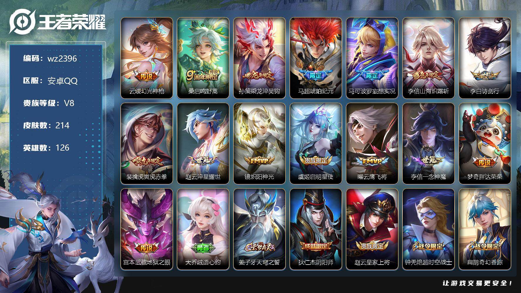 【云游堂】 【可二次实名】【wz2396】安卓Q-V8-最强王者段位-126英雄-214皮肤-0典藏-0珍品无双-0无双-0珍品传说-15传说-69史诗 【英雄全皮】:李信全皮,赵怀真全皮 【传说皮肤】:云缨幻光神枪,桑启鸣野蒿,孙策乘龙淬吴钩,马超琥珀纪元,马可波罗妄想实况,李信山海炽霜斩,李白诗剑行,裴擒虎寅虎赤拳,赵云淬星耀世,镜炽阳神光,虞姬启明星使,曜云鹰飞将,李信一念神魔,梦奇胖达荣荣,宫本武藏地狱之眼 【限定皮肤】:大乔绒语心约,姜子牙天穹之誓,狄仁杰阴阳师,赵云皇家上将,钟无艳超时空战士,扁鹊奇幻香踪,元歌无心,甄姬落雪兰心,马可波罗暗影游猎,马可波罗山海玄木吟,马可波罗妄想实况,狄仁杰魔术师,项羽海滩派对,孙悟空孙行者,刘备百相守梦,李元芳云中旅人,虞姬启明星使,杨戬潮玩骑兵,蔡文姬繁星吟游,鬼谷子五谷丰年,黄忠烈魂,梦奇顽趣,裴擒虎寅虎赤拳,裴擒虎擒涛扼浪,云中君纤云弄巧,云中君时之祈愿,李信山海炽霜斩,上官婉儿梁祝,上官婉儿神器万象笔,嫦娥如梦令,嫦娥拒霜思,嫦娥暖冬兔眠,西施玲珑珍味,鲁班大师探海日志,桑启海盐诗旅,暃星界游侠,戈娅驭风魔法,艾琳流音漫舞,赵怀真鹤归松栖,司空震地狱燃心,阿古朵江河有灵,张良古海寻踪,蒙犽百解令,蒙恬荣光圣徽,高渐离燃音魔法,妲己灵卜魔法,鬼谷子天穹祈灯,伽罗琥珀纪元,马超琥珀纪元,姬小满妄想食味,孙策乘龙淬吴钩,沈梦溪龙舞盛年,鲁班七号蔬乡物语,李元芳蔬乡物语,刘邦剑破天穹,程咬金群星魔术团,项羽苍威无极,周瑜熔金海岸 【年限皮肤】:裴擒虎寅虎赤拳,黄忠烈魂,马可波罗山海玄木吟,李信山海炽霜斩,孙策乘龙淬吴钩 【赛季限定】:张良古海寻踪,李元芳云中旅人,梦奇顽趣,裴擒虎擒涛扼浪,鲁班大师探海日志,桑启海盐诗旅,鬼谷子天穹祈灯,蒙恬荣光圣徽,刘邦剑破天穹,姜子牙天穹之誓 【战令限定】:钟无艳超时空战士,扁鹊奇幻香踪,甄姬落雪兰心,马可波罗暗影游猎,艾琳流音漫舞,杨戬潮玩骑兵,嫦娥暖冬兔眠,西施玲珑珍味,司空震地狱燃心,暃星界游侠,戈娅驭风魔法,高渐离燃音魔法,妲己灵卜魔法,鲁班七号蔬乡物语,李元芳蔬乡物语,项羽苍威无极 【史诗皮肤】:露娜紫霞仙子,赵云皇家上将,甄姬冰雪圆舞曲,狄仁杰魔术师,宫本武藏鬼剑武藏,孙尚香水果甜心,嬴政摇滚巨星,妲己魅力维加斯,妲己女仆咖啡,墨子金属风暴,吕布圣诞狂欢,曹操幽灵船长,吕布末日机甲,张飞乱世虎臣,夏侯惇乘风破浪,小乔缤纷独角兽,兰陵王暗隐猎兽者,亚瑟心灵战警,安琪拉心灵骇客,百里守约特工魅影,铠曙光守护者,刘禅天才门将,李元芳逐浪之夏,程咬金功夫厨神,白起星夜王子,阿轲节奏热浪,孙策猫狗日记,伽罗箭羽风息,狄仁杰鹰眼统帅,公孙离无限星赏官,上官婉儿梁祝,蔡文姬繁星吟游,嫦娥如梦令,橘右京修罗,黄忠烈魂,马可波罗暗影游猎,云中君纤云弄巧,百里玄策热力回旋,孙悟空孙行者,司马懿暗渊魔法,嫦娥拒霜思,云中君时之祈愿,夏洛特永昼,澜赏金猎手,钟无艳超时空战士,鬼谷子五谷丰年,上官婉儿神器万象笔,元歌无心,梦奇顽趣,暃星界游侠,马可波罗山海玄木吟,扁鹊奇幻香踪,刘备百相守梦,刘禅电玩爆裂旋风,戈娅驭风魔法,赵怀真鹤归松栖,司空震地狱燃心,阿古朵江河有灵,蒙犽百解令,妲己灵卜魔法,高渐离燃音魔法,蒙恬荣光圣徽,伽罗琥珀纪元,姬小满妄想食味,鲁班七号蔬乡物语,赵怀真器灵浮梦炉,狂铁龙之律动,后羿石田雨龙,周瑜百相守梦,黄忠百相守梦 【其他皮肤】:项羽海滩派对,韩信街头霸王,露娜哥特玫瑰,赵云忍炎影,芈月红桃皇后,白起白色死神,牛魔西部大镖客,武则天东方不败,宫本武藏未来纪元,孙膑天使之翼,妲己少女阿狸,典韦黄金武士,亚瑟死亡骑士,花木兰兔女郎,张飞五福同心,甄姬花好人间,刘备万事如意,宫本武藏万象初新,狄仁杰阴阳师,关羽龙腾万里,墨子进击墨子号,钟无艳海滩丽影,狂铁命运角斗场,老夫子功夫老勺,孙尚香沉稳之力,诸葛亮掌控之力,李白敏锐之力,鬼谷子幻乐之宴,苏烈坚韧之力,大乔守护之力,明世隐虹云星官,小乔丁香结,吕布野性能量,孙膑归虚梦演,沈梦溪鲨炮海盗猫,哪吒次元突破,狂铁特工战影,刘禅秘密基地,鲁班大师乓乓大师,典韦铁甲之心,米莱狄契约魔法,蒙恬蔚蓝守将,甄姬落雪兰心,李元芳云中旅人,桑启海盐诗旅,嫦娥暖冬兔眠,海月幻泉雾影,猪八戒潮玩探月行,牛魔牛运亨通,赵怀真太极少年,裴擒虎擒涛扼浪,杨戬潮玩骑兵,太乙真人劲辣红锅,莱西奥西部游侠,鲁班大师探海日志,西施玲珑珍味,姬小满零食大作战,李元芳妄想特派,哪吒热血海滩,艾琳流音漫舞,张良古海寻踪,钟无艳聚星闪耀,海月王牌新星,曹操决胜大满贯,后羿完美运算,鬼谷子天穹祈灯,妲己灵卜魔法,海诺时空谍影,嫦娥漠中幻影,廉颇功夫炙烤,沈梦溪龙舞盛年,李元芳蔬乡物语,刘邦剑破天穹,程咬金群星魔术团,项羽苍威无极,大司命暗都幽影,姜子