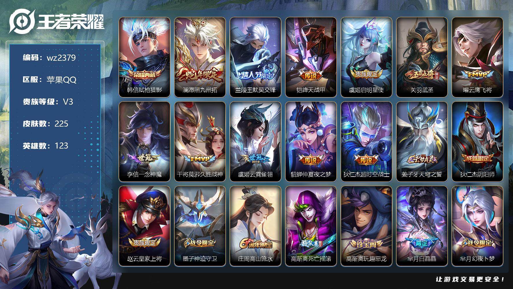 【云游堂】 【可二次实名】【wz2379】苹果Q-V3-尊贵铂金I段位-123英雄-225皮肤-1典藏-0珍品无双-0无双-0珍品传说-11传说-66史诗 【英雄全皮】:蒙恬全皮 【荣耀典藏】:韩信弑枪猎影 【传说皮肤】:澜愿照九州拓,兰陵王默契交锋,铠绛天战甲,虞姬启明星使,关羽武圣,曜云鹰飞将,李信一念神魔,干将莫邪久胜战神,虞姬云霓雀翎,貂蝉仲夏夜之梦,狄仁杰超时空战士 【限定皮肤】:姜子牙天穹之誓,狄仁杰阴阳师,赵云皇家上将,墨子神迹守卫,庄周高山流水,高渐离死亡摇滚,高渐离玩趣恶龙,芈月白晶晶,芈月幻夜卜梦,吕布御风骁将,元歌云间偶戏,元歌无心,甄姬游园惊梦,马可波罗暗影游猎,狄仁杰魔术师,狄仁杰万华元夜,达摩星际陆战队,达摩沙漠行僧,项羽海滩派对,项羽霸王别姬,老夫子醍醐杖,老夫子航海奇遇记,关羽武圣,程咬金演武夺筹,韩信逐梦之影,韩信飞衡,韩信傲雪梅枪,兰陵王默契交锋,兰陵王金庭之子,亚瑟潮玩骑士王,孙悟空孙行者,后羿辉光之辰,后羿圣弓游侠,张飞虎魄,李元芳银河之约,李元芳云中旅人,虞姬启明星使,钟馗驱傩正仪,干将莫邪冰霜恋舞曲,干将莫邪胡桃夹子,干将莫邪真爱魔法,雅典娜单词大作战,雅典娜黎明之约,鬼谷子原初探秘者,黄忠火炮绅士,苏烈千军破阵,百里玄策原初追逐者,百里守约朱雀志,弈星混沌棋,沈梦溪星空之诺,沈梦溪大漠名商,明世隐疑决卦,裴擒虎李小龙,裴擒虎擒涛扼浪,米莱狄胡桃异想国,云中君纤云弄巧,猪八戒西部大镖客,嫦娥拒霜思,蒙犽狂想玩偶喵,鲁班大师探海日志,桑启海盐诗旅,张良古海寻踪,蒙恬荣光圣徽,高渐离燃音魔法,妲己灵卜魔法,鬼谷子天穹祈灯,刘邦剑破天穹,周瑜熔金海岸 【年限皮肤】:百里守约朱雀志,后羿辉光之辰,吕布御风骁将,韩信飞衡,马超神威,关羽武圣,张飞虎魄 【赛季限定】:狄仁杰万华元夜,达摩沙漠行僧,老夫子醍醐杖,程咬金演武夺筹,兰陵王金庭之子,张良古海寻踪,李元芳云中旅人,钟馗驱傩正仪,雅典娜黎明之约,鬼谷子原初探秘者,苏烈千军破阵,百里玄策原初追逐者,弈星混沌棋,沈梦溪大漠名商,明世隐疑决卦,裴擒虎擒涛扼浪,鲁班大师探海日志,桑启海盐诗旅,鬼谷子天穹祈灯,蒙恬荣光圣徽,刘邦剑破天穹,姜子牙天穹之誓 【战令限定】:墨子神迹守卫,芈月幻夜卜梦,元歌云间偶戏,马可波罗暗影游猎,达摩星际陆战队,老夫子航海奇遇记,亚瑟潮玩骑士王,后羿圣弓游侠,李元芳银河之约,干将莫邪真爱魔法,雅典娜单词大作战,黄忠火炮绅士,沈梦溪星空之诺,米莱狄胡桃异想国,猪八戒西部大镖客,蒙犽狂想玩偶喵,高渐离燃音魔法,妲己灵卜魔法 【史诗皮肤】:露娜紫霞仙子,赵云皇家上将,赵云未来纪元,貂蝉圣诞恋歌,甄姬冰雪圆舞曲,王昭君偶像歌手,狄仁杰魔术师,宫本武藏鬼剑武藏,孙尚香水果甜心,妲己女仆咖啡,墨子金属风暴,曹操幽灵船长,李白千年之狐,吕布末日机甲,张飞乱世虎臣,韩信白龙吟,项羽霸王别姬,花木兰水晶猎龙者,刘邦德古拉伯爵,韩信逐梦之影,夏侯惇乘风破浪,小乔缤纷独角兽,诸葛亮黄金分割率,甄姬游园惊梦,安琪拉心灵骇客,后羿辉光之辰,百里守约特工魅影,铠曙光守护者,蔡文姬舞动绿茵,李元芳逐浪之夏,程咬金功夫厨神,白起星夜王子,阿轲节奏热浪,大乔猫狗日记,百里守约朱雀志,干将莫邪冰霜恋舞曲,狄仁杰鹰眼统帅,李元芳银河之约,娜可露露晚萤,韩信飞衡,橘右京修罗,马超神威,孙尚香时之恋人,马可波罗暗影游猎,张飞虎魄,蒙犽狂想玩偶喵,百里玄策原初追逐者,裴擒虎李小龙,云中君纤云弄巧,元歌云间偶戏,芈月白晶晶,吕布御风骁将,米莱狄胡桃异想国,老夫子航海奇遇记,干将莫邪真爱魔法,孙悟空孙行者,庄周高山流水,嫦娥拒霜思,黄忠火炮绅士,雅典娜黎明之约,韩信傲雪梅枪,元歌无心,刘禅电玩爆裂旋风,妲己灵卜魔法,高渐离燃音魔法,蒙恬荣光圣徽,后羿石田雨龙 【其他皮肤】:项羽海滩派对,韩信教廷特使,韩信街头霸王,达摩大发明家,赵云忍炎影,芈月红桃皇后,扁鹊化身博士,扁鹊救世之瞳,宫本武藏未来纪元,姜子牙时尚教父,典韦黄金武士,达摩拳王,花木兰兔女郎,张飞五福同心,甄姬花好人间,刘备万事如意,宫本武藏万象初新,狄仁杰阴阳师,刘备纽约教父,高渐离死亡摇滚,刘备汉昭烈帝,关羽龙腾万里,钟无艳海滩丽影,宫本武藏霸王丸,王昭君幻想奇妙夜,狂铁命运角斗场,老夫子功夫老勺,孙尚香沉稳之力,诸葛亮掌控之力,李白敏锐之力,鬼谷子幻乐之宴,苏烈坚韧之力,明世隐虹云星官,庄周奇妙博物学,小乔丁香结,吕布野性能量,高渐离玩趣恶龙,沈梦溪鲨炮海盗猫,沈梦溪星空之诺,弈星混沌棋,哪吒次元突破,鲁班七号黑桃队长,明世隐疑决卦,盾山圆桌骑士,老夫子醍醐杖,猪八戒西部大镖客,狂铁特工战影,廉颇无尽征程,鬼谷子原初探秘者,雅典娜单词大作战,狄仁杰万华元夜,亚瑟潮玩骑士王,刘禅秘密基地,杨戬次元傲视,露娜瓷语鉴心,达摩星际陆