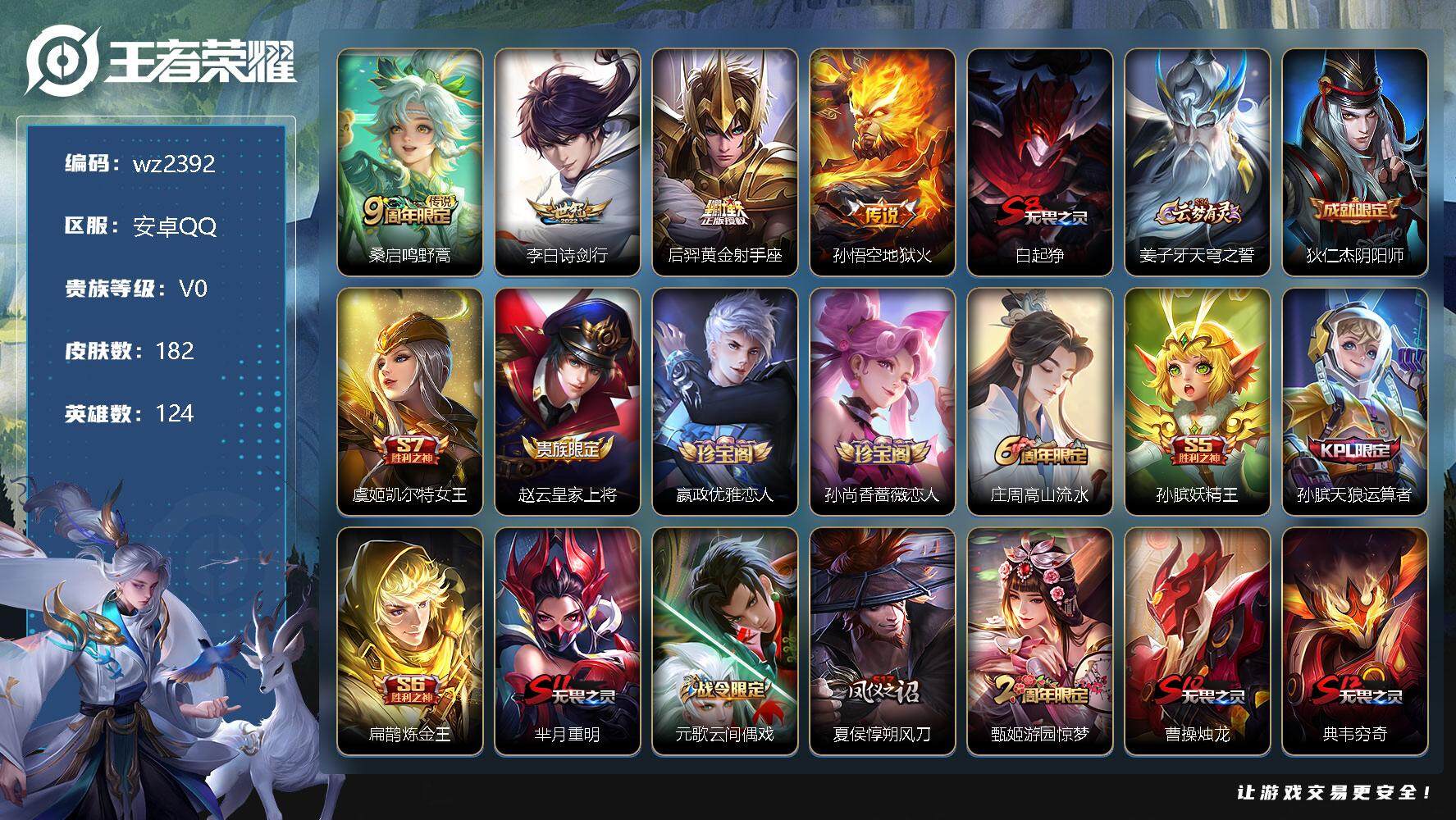 【云游堂】 【可二次实名】【wz2392】安卓Q-V0-永恒钻石V段位-124英雄-182皮肤-0典藏-0珍品无双-0无双-0珍品传说-4传说-39史诗 【传说皮肤】:桑启鸣野蒿,李白诗剑行,后羿黄金射手座,孙悟空地狱火 【限定皮肤】:白起狰,姜子牙天穹之誓,狄仁杰阴阳师,虞姬凯尔特女王,赵云皇家上将,嬴政优雅恋人,孙尚香蔷薇恋人,庄周高山流水,孙膑妖精王,孙膑天狼运算者,扁鹊炼金王,芈月重明,元歌云间偶戏,夏侯惇朔风刀,甄姬游园惊梦,曹操烛龙,典韦穷奇,狄仁杰魔术师,狄仁杰万华元夜,达摩沙漠行僧,项羽海滩派对,老夫子醍醐杖,程咬金演武夺筹,兰陵王金庭之子,亚瑟潮玩骑士王,孙悟空至尊宝,孙悟空大圣娶亲,牛魔御旌,李元芳云中旅人,钟馗驱傩正仪,杨玉环遇见飞天,蔡文姬繁星吟游,太乙真人饕餮,鬼谷子原初探秘者,鬼谷子五谷丰年,苏烈千军破阵,弈星混沌棋,沈梦溪大漠名商,明世隐疑决卦,裴擒虎李小龙,裴擒虎擒涛扼浪,狂铁御狮,米莱狄御霄,猪八戒猪悟能,上官婉儿梁祝,嫦娥拒霜思,鲁班大师探海日志,桑启海盐诗旅,阿古朵江河有灵,张良古海寻踪,鬼谷子天穹祈灯 【赛季限定】:孙膑妖精王,扁鹊炼金王,白起狰,芈月重明,夏侯惇朔风刀,曹操烛龙,典韦穷奇,狄仁杰万华元夜,达摩沙漠行僧,老夫子醍醐杖,程咬金演武夺筹,兰陵王金庭之子,张良古海寻踪,牛魔御旌,李元芳云中旅人,虞姬凯尔特女王,钟馗驱傩正仪,太乙真人饕餮,鬼谷子原初探秘者,苏烈千军破阵,弈星混沌棋,沈梦溪大漠名商,明世隐疑决卦,裴擒虎擒涛扼浪,狂铁御狮,米莱狄御霄,鲁班大师探海日志,桑启海盐诗旅,鬼谷子天穹祈灯,姜子牙天穹之誓 【战令限定】:元歌云间偶戏,亚瑟潮玩骑士王 【史诗皮肤】:赵云皇家上将,甄姬冰雪圆舞曲,狄仁杰魔术师,廉颇地狱岩魂,孙尚香蔷薇恋人,孙尚香水果甜心,嬴政优雅恋人,妲己女仆咖啡,墨子金属风暴,李白千年之狐,张飞乱世虎臣,韩信白龙吟,孙悟空至尊宝,夏侯惇乘风破浪,小乔缤纷独角兽,兰陵王暗隐猎兽者,诸葛亮黄金分割率,甄姬游园惊梦,雅典娜冰冠公主,铠曙光守护者,杨玉环遇见飞天,孙悟空大圣娶亲,伽罗箭羽风息,狄仁杰鹰眼统帅,公孙离无限星赏官,上官婉儿梁祝,蔡文姬繁星吟游,小乔青蛇,瑶遇见神鹿,裴擒虎李小龙,孙膑天狼运算者,元歌云间偶戏,猪八戒猪悟能,庄周高山流水,嫦娥拒霜思,貂蝉唤灵魅影,鬼谷子五谷丰年,阿古朵江河有灵,百里守约百相守梦 【其他皮肤】:项羽海滩派对,韩信教廷特使,露娜哥特玫瑰,阿轲致命风华,阿轲爱心护理,达摩大发明家,赵云忍炎影,扁鹊化身博士,安琪拉玩偶对对碰,姜子牙时尚教父,妲己少女阿狸,典韦黄金武士,亚瑟死亡骑士,花木兰兔女郎,张飞五福同心,刘备万事如意,宫本武藏万象初新,后羿阿尔法小队,狄仁杰阴阳师,刘备纽约教父,孙膑妖精王,刘备汉昭烈帝,扁鹊炼金王,关羽龙腾万里,虞姬凯尔特女王,白起狰,钟无艳海滩丽影,太乙真人饕餮,曹操烛龙,王昭君幻想奇妙夜,芈月重明,老夫子功夫老勺,孙尚香沉稳之力,典韦穷奇,李白敏锐之力,鬼谷子幻乐之宴,狂铁御狮,苏烈坚韧之力,大乔守护之力,米莱狄御霄,明世隐虹云星官,牛魔御旌,吕布野性能量,孙膑归虚梦演,沈梦溪鲨炮海盗猫,姜子牙炽热元素使,夏侯惇朔风刀,弈星混沌棋,哪吒次元突破,明世隐疑决卦,盾山圆桌骑士,老夫子醍醐杖,狂铁特工战影,鬼谷子原初探秘者,狄仁杰万华元夜,亚瑟潮玩骑士王,刘禅秘密基地,杨戬次元傲视,露娜瓷语鉴心,程咬金演武夺筹,张良缤纷绘卷,钟馗驱傩正仪,鲁班大师乓乓大师,苏烈千军破阵,马可波罗潮玩牛仔,达摩沙漠行僧,程咬金无双福将,兰陵王金庭之子,刘禅唤灵魔甲,米莱狄契约魔法,沈梦溪大漠名商,蒙恬蔚蓝守将,李元芳云中旅人,戈娅危途狂花,刘备潮玩造梦师,桑启海盐诗旅,海月幻泉雾影,猪八戒潮玩探月行,裴擒虎擒涛扼浪,太乙真人劲辣红锅,鲁班大师探海日志,李元芳妄想特派,张良古海寻踪,钟无艳聚星闪耀,兰陵王幻夜行动,鬼谷子天穹祈灯,廉颇功夫炙烤,姜子牙天穹之誓,东皇太一噬灭天穹,老夫子百相守梦,干将莫邪雾都夜雨,吕布逐霄战戟,苍苍林狼骑,太乙真人谧流熔炉,典韦铁骨偃魂,西施雪境奇遇,鲁班七号木偶奇遇记,钟无艳生化警戒,貂蝉异域舞娘,老夫子潮流仙人,王昭君精灵公主,小乔万圣前夜,孙悟空西部大镖客,刘禅英喵野望,兰陵王隐刃,李白范海辛,钟馗地府判官,李元芳特种部队,刘邦圣殿之光,虞姬加勒比小姐,关羽天启骑士,蔡文姬蔷薇王座,雅典娜战争女神,马可波罗激情绿茵,杨戬埃及法老,太乙真人圆桌骑士,哪吒三太子,黄忠芝加哥教父,大乔伊势巫女,干将莫邪第七人偶,鬼谷子阿摩司公爵,百里守约绝影神枪,梦奇美梦成真,女娲尼罗河女神,裴擒虎街头旋风,元歌午夜歌剧院,孙策海之征途,司马懿魇语军师,伽罗花见巫女,盘古创世神祝,瑶森,曜归虚梦演,马超幸存者,鲁班大师归虚梦演,镜冰刃幻
