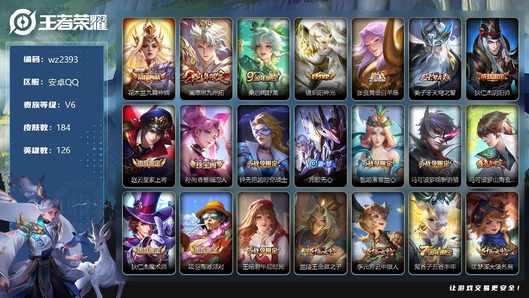 【云游堂】 【可二次实名】【wz2393】安卓Q-V6-永恒钻石II段位-126英雄-184皮肤-1典藏-0珍品无双-0无双-0珍品传说-4传说-52史诗 【荣耀典藏】:花木兰九霄神辉 【传说皮肤】:澜愿照九州拓,桑启鸣野蒿,镜炽阳神光,张良黄金白羊座 【限定皮肤】:姜子牙天穹之誓,狄仁杰阴阳师,赵云皇家上将,孙尚香蔷薇恋人,钟无艳超时空战士,元歌无心,甄姬落雪兰心,马可波罗暗影游猎,马可波罗山海玄木吟,狄仁杰魔术师,项羽海滩派对,王昭君午后时光,兰陵王金庭之子,李元芳云中旅人,鬼谷子五谷丰年,沈梦溪大漠名商,裴擒虎李小龙,裴擒虎擒涛扼浪,狂铁电玩高手,云中君纤云弄巧,嫦娥拒霜思,嫦娥暖冬兔眠,鲁班大师探海日志,桑启海盐诗旅,暃星界游侠,艾琳流音漫舞,司空震地狱燃心,阿古朵江河有灵,张良古海寻踪,蒙犽百解令,鬼谷子天穹祈灯,伽罗琥珀纪元,刘邦剑破天穹,程咬金群星魔术团,周瑜熔金海岸 【年限皮肤】:马可波罗山海玄木吟 【赛季限定】:兰陵王金庭之子,张良古海寻踪,李元芳云中旅人,沈梦溪大漠名商,裴擒虎擒涛扼浪,鲁班大师探海日志,桑启海盐诗旅,鬼谷子天穹祈灯,刘邦剑破天穹,姜子牙天穹之誓 【战令限定】:钟无艳超时空战士,甄姬落雪兰心,马可波罗暗影游猎,王昭君午后时光,艾琳流音漫舞,狂铁电玩高手,嫦娥暖冬兔眠,司空震地狱燃心,暃星界游侠 【史诗皮肤】:赵云皇家上将,赵云未来纪元,貂蝉圣诞恋歌,甄姬冰雪圆舞曲,狄仁杰魔术师,廉颇地狱岩魂,宫本武藏鬼剑武藏,孙尚香蔷薇恋人,孙尚香水果甜心,妲己魅力维加斯,墨子龙骑士,墨子金属风暴,吕布圣诞狂欢,曹操幽灵船长,李白千年之狐,吕布末日机甲,张飞乱世虎臣,花木兰水晶猎龙者,刘邦德古拉伯爵,夏侯惇乘风破浪,兰陵王暗隐猎兽者,诸葛亮黄金分割率,雅典娜冰冠公主,百里守约特工魅影,李元芳逐浪之夏,白起星夜王子,狄仁杰鹰眼统帅,娜可露露晚萤,不知火舞魅语,橘右京修罗,孙尚香时之恋人,马可波罗暗影游猎,裴擒虎李小龙,云中君纤云弄巧,嫦娥拒霜思,澜赏金猎手,狂铁电玩高手,钟无艳超时空战士,鬼谷子五谷丰年,元歌无心,暃星界游侠,马可波罗山海玄木吟,刘禅电玩爆裂旋风,司空震地狱燃心,阿古朵江河有灵,蒙犽百解令,伽罗琥珀纪元,孙膑茶境仙,弈星万物之道,阿轲化蝶舞,狂铁龙之律动,黄忠百相守梦 【其他皮肤】:项羽海滩派对,韩信教廷特使,韩信街头霸王,达摩大发明家,赵云白执事,赵云忍炎影,扁鹊化身博士,安琪拉玩偶对对碰,典韦黄金武士,亚瑟死亡骑士,花木兰兔女郎,张飞五福同心,甄姬花好人间,刘备万事如意,宫本武藏万象初新,后羿阿尔法小队,狄仁杰阴阳师,刘备纽约教父,刘备汉昭烈帝,钟无艳海滩丽影,王昭君幻想奇妙夜,狂铁命运角斗场,老夫子功夫老勺,孙尚香沉稳之力,诸葛亮掌控之力,李白敏锐之力,苏烈坚韧之力,大乔守护之力,明世隐虹云星官,小乔丁香结,孙膑归虚梦演,沈梦溪鲨炮海盗猫,哪吒次元突破,盾山圆桌骑士,狂铁特工战影,刘禅秘密基地,鲁班大师乓乓大师,程咬金无双福将,兰陵王金庭之子,王昭君午后时光,沈梦溪大漠名商,蒙恬蔚蓝守将,甄姬落雪兰心,李元芳云中旅人,戈娅危途狂花,桑启海盐诗旅,嫦娥暖冬兔眠,海月幻泉雾影,猪八戒潮玩探月行,牛魔牛运亨通,白起乐园追猎者,赵怀真太极少年,裴擒虎擒涛扼浪,太乙真人劲辣红锅,莱西奥西部游侠,鲁班大师探海日志,李元芳妄想特派,哪吒热血海滩,艾琳流音漫舞,张良古海寻踪,钟无艳聚星闪耀,海月王牌新星,亚连破局者,兰陵王幻夜行动,曹操决胜大满贯,后羿完美运算,程咬金暖冬絮语,鬼谷子天穹祈灯,嫦娥漠中幻影,廉颇功夫炙烤,钟无艳春野之旅,扁鹊无尽旅途,刘邦剑破天穹,程咬金群星魔术团,大司命暗都幽影,姜子牙天穹之誓,周瑜熔金海岸,东皇太一噬灭天穹,太乙真人谧流熔炉,马超访茗客,西施雪境奇遇,姜子牙星梦巡礼,戈娅玫蓝誓约,钟馗虚灵犬护,苏烈春野闲踪,张良灵野札记,阿古朵布丁狗之约,露娜命运加冕,姬小满小满鸭,甄姬逆浪荇歌,庄周锦麟游梦,莱西奥踏浪烽翎,鲁班七号木偶奇遇记,露娜绯红之刃,老夫子潮流仙人,曹操超能战警,周瑜海军大将,后羿精灵王,刘禅英喵野望,兰陵王隐刃,刘邦圣殿之光,虞姬加勒比小姐,雅典娜战争女神,马可波罗激情绿茵,苍维京掠夺者,黄忠芝加哥教父,干将莫邪第七人偶,铠龙域领主,百里守约绝影神枪,百里玄策威尼斯狂欢,明世隐占星师,弈星踏雪寻梅,孙策海之征途,司马懿魇语军师,李信灼热之刃,猪八戒年年有余,盘古创世神祝,云中君荷鲁斯之眼,曜归虚梦演,马超幸存者,镜冰刃幻境,蒙恬秩序猎龙将,澜孤猎,司空震启蛰,云缨赤焰之缨,暃碧珀绯影,桑启画中游 【内测皮肤】:孙尚香蔷薇恋人,狂铁特工战影 【营地ID】:1721492683