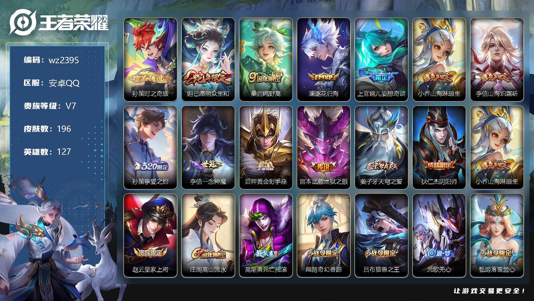 【云游堂】 【可二次实名】【wz2395】安卓Q-V7-永恒钻石II段位-127英雄-196皮肤-0典藏-0珍品无双-0无双-1珍品传说-10传说-58史诗 【英雄全皮】:李信全皮,赵怀真全皮,戈娅全皮,影全皮 【珍品传说】:孙策时之奇旅 【传说皮肤】:妲己愿照众生和,桑启鸣野蒿,澜逐花归海,上官婉儿妄想奇谈,小乔山海琳琅生,李信山海炽霜斩,孙策挚爱之约,李信一念神魔,后羿黄金射手座,宫本武藏地狱之眼 【限定皮肤】:姜子牙天穹之誓,狄仁杰阴阳师,小乔山海琳琅生,赵云皇家上将,庄周高山流水,高渐离死亡摇滚,扁鹊奇幻香踪,吕布猎兽之王,元歌无心,甄姬落雪兰心,马可波罗山海玄木吟,狄仁杰魔术师,狄仁杰万华元夜,项羽海滩派对,李元芳云中旅人,杨戬潮玩骑兵,干将莫邪胡桃夹子,鬼谷子原初探秘者,百里玄策原初追逐者,裴擒虎擒涛扼浪,狂铁电玩高手,瑶山海碧波行,云中君纤云弄巧,李信山海炽霜斩,孙策挚爱之约,上官婉儿梁祝,上官婉儿神器万象笔,上官婉儿妄想奇谈,嫦娥拒霜思,嫦娥暖冬兔眠,西施玲珑珍味,鲁班大师探海日志,桑启海盐诗旅,暃星界游侠,戈娅驭风魔法,艾琳流音漫舞,赵怀真鹤归松栖,司空震地狱燃心,阿古朵江河有灵,张良古海寻踪,蒙犽百解令,蒙恬荣光圣徽,高渐离燃音魔法,妲己灵卜魔法,鬼谷子天穹祈灯,沈梦溪龙舞盛年,刘邦剑破天穹,程咬金群星魔术团,镜青焰无极,项羽苍威无极,周瑜熔金海岸 【年限皮肤】:瑶山海碧波行,马可波罗山海玄木吟,李信山海炽霜斩,小乔山海琳琅生 【赛季限定】:狄仁杰万华元夜,张良古海寻踪,李元芳云中旅人,鬼谷子原初探秘者,百里玄策原初追逐者,裴擒虎擒涛扼浪,鲁班大师探海日志,桑启海盐诗旅,鬼谷子天穹祈灯,蒙恬荣光圣徽,刘邦剑破天穹,姜子牙天穹之誓 【战令限定】:扁鹊奇幻香踪,吕布猎兽之王,甄姬落雪兰心,艾琳流音漫舞,杨戬潮玩骑兵,狂铁电玩高手,嫦娥暖冬兔眠,西施玲珑珍味,司空震地狱燃心,暃星界游侠,戈娅驭风魔法,高渐离燃音魔法,妲己灵卜魔法,镜青焰无极,项羽苍威无极 【史诗皮肤】:鲁班七号电玩小子,赵云皇家上将,赵云未来纪元,甄姬冰雪圆舞曲,狄仁杰魔术师,宫本武藏鬼剑武藏,孙尚香水果甜心,嬴政摇滚巨星,妲己魅力维加斯,妲己女仆咖啡,墨子金属风暴,张飞乱世虎臣,花木兰水晶猎龙者,夏侯惇乘风破浪,小乔缤纷独角兽,兰陵王暗隐猎兽者,亚瑟心灵战警,雅典娜冰冠公主,安琪拉心灵骇客,百里守约特工魅影,刘禅天才门将,李元芳逐浪之夏,阿轲节奏热浪,孙策猫狗日记,狄仁杰鹰眼统帅,上官婉儿梁祝,大乔白蛇,孙尚香时之恋人,百里玄策原初追逐者,云中君纤云弄巧,沈梦溪月团寄思,庄周高山流水,司马懿暗渊魔法,嫦娥拒霜思,貂蝉唤灵魅影,狂铁电玩高手,上官婉儿神器万象笔,元歌无心,暃星界游侠,马可波罗山海玄木吟,瑶山海碧波行,扁鹊奇幻香踪,刘禅电玩爆裂旋风,戈娅驭风魔法,赵怀真鹤归松栖,司空震地狱燃心,阿古朵江河有灵,蒙犽百解令,周瑜雪夜绮愿,妲己灵卜魔法,高渐离燃音魔法,蒙恬荣光圣徽,镜青焰无极,亚连破空之剑,牛魔星界战将,孙膑茶境仙,赵怀真器灵浮梦炉,狂铁龙之律动,后羿石田雨龙 【其他皮肤】:项羽海滩派对,韩信教廷特使,韩信街头霸王,赵云忍炎影,芈月红桃皇后,扁鹊救世之瞳,孙膑天使之翼,妲己少女阿狸,典韦黄金武士,亚瑟死亡骑士,达摩拳王,花木兰兔女郎,甄姬花好人间,刘备万事如意,宫本武藏万象初新,狄仁杰阴阳师,刘备纽约教父,高渐离死亡摇滚,李元芳黑猫爱糖果,关羽龙腾万里,钟无艳海滩丽影,王昭君幻想奇妙夜,老夫子功夫老勺,牛魔制霸全明星,孙尚香沉稳之力,诸葛亮掌控之力,苏烈坚韧之力,大乔守护之力,吕布猎兽之王,明世隐虹云星官,孙膑归虚梦演,沈梦溪鲨炮海盗猫,姜子牙炽热元素使,狂铁特工战影,鬼谷子原初探秘者,狄仁杰万华元夜,露娜瓷语鉴心,张良缤纷绘卷,鲁班大师乓乓大师,干将莫邪胡桃夹子,程咬金无双福将,刘禅唤灵魔甲,甄姬落雪兰心,李元芳云中旅人,戈娅危途狂花,刘备潮玩造梦师,桑启海盐诗旅,嫦娥暖冬兔眠,海月幻泉雾影,猪八戒潮玩探月行,牛魔牛运亨通,赵怀真太极少年,裴擒虎擒涛扼浪,杨戬潮玩骑兵,太乙真人劲辣红锅,莱西奥西部游侠,鲁班大师探海日志,西施玲珑珍味,姬小满零食大作战,李元芳妄想特派,哪吒热血海滩,艾琳流音漫舞,张良古海寻踪,钟无艳聚星闪耀,海月王牌新星,亚连破局者,兰陵王幻夜行动,后羿完美运算,程咬金暖冬絮语,鬼谷子天穹祈灯,妲己灵卜魔法,海诺时空谍影,嫦娥漠中幻影,朵莉亚金色潮汐,廉颇功夫炙烤,亚瑟鸿运当头,沈梦溪龙舞盛年,钟无艳春野之旅,刘邦剑破天穹,程咬金群星魔术团,项羽苍威无极,大司命暗都幽影,姜子牙天穹之誓,周瑜熔金海岸,孙悟空神迹守卫,盘古敬我三分,东皇太一噬灭天穹,苍苍林狼骑,太乙真人谧流熔炉,典韦铁骨偃魂,马超访茗客,影魅影绮裳,西施雪境奇遇,姜子牙星梦