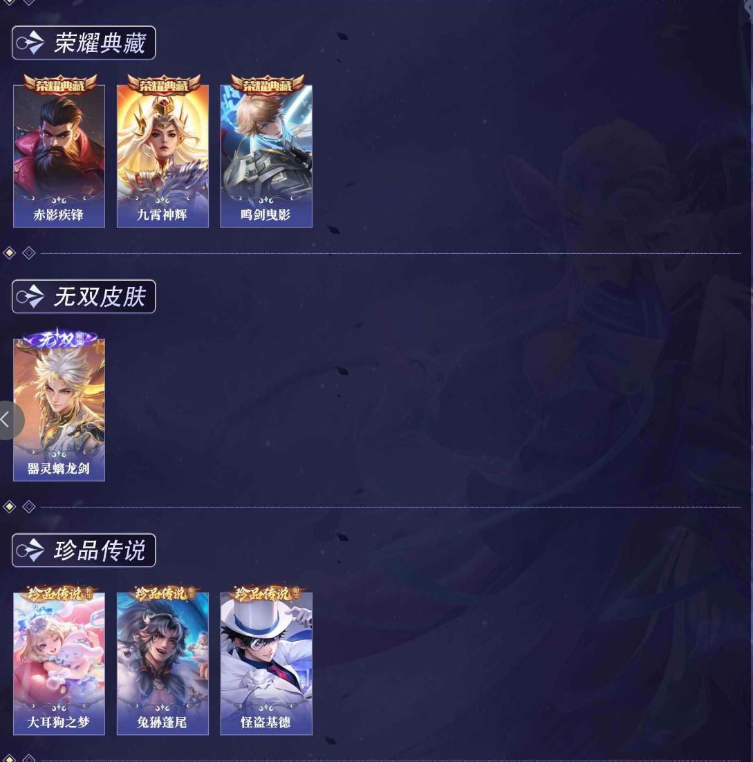 【云游堂】 【可二次实名】【英雄数量】126 【皮肤数量】363 【区服】安卓QQ368区 【实名情况】可二次实名 【有无防沉迷】无防沉迷 【场次】6567 【胜率】54.39% 【段位】至尊星耀IV 【贵族等级】9 【稀有英雄】10 _敖隐 _嬴政 _金蝉 _不知火舞 _娜可露露 _橘右京 _艾琳 _韩信 _赵云 _夏洛特 【皮肤价值】319876 【内测皮肤】2 姬小满_妄想食味 干将莫邪_胡桃夹子 【荣耀皮肤】3 关羽_赤影疾锋 花木兰_九霄神辉 李白_鸣剑曳影 【珍品无双】0 【无双皮肤】1 曜_器灵螭龙剑 【珍品传说】3 瑶_大耳狗之梦 张飞_兔狲蓬尾 马可波罗_怪盗基德 【星元皮肤】0 【传说皮肤】27 裴擒虎_祥瑞亨通 妲己_愿照众生和 女娲_愿照千秋盛 司空震_愿照山河定 云缨_幻光神枪 澜_愿照九州拓 嬴政_玄雷天君 桑启_鸣野蒿 孙策_乘龙淬吴钩 孙尚香_乘龙问璇玑 赵云_乘龙铭钟鼎 曜_山海苍雷引 虞姬_启明星使 宫本武藏_惊梅引 王昭君_乞巧织情 小乔_音你心动 铠_绛天战甲 马超_琥珀纪元 鲁班七号_时之奇旅 孙悟空_齐天大圣 女娲_补天 西施_游龙清影 镜_炽阳神光 露娜_霜月吟 后羿_黄金射手座 狄仁杰_神器狴犴令 关羽_武圣 【史诗皮肤】121 西施_织梦人 公孙离_涂山容容 黄忠_百相守梦 后羿_石田雨龙 扁鹊_灵蛊蚀心 狂铁_龙之律动 刘禅_鸭鸭历险记 赵怀真_器灵浮梦炉 白起_苍鳞隐世 孙膑_茶境仙 牛魔_星界战将 百里守约_百相守梦 李白_谪仙醉月 亚连_破空之剑 弈星_炽弈燎原 姬小满_战舞者 少司缘_涂山红红 大司命_东方 蔡文姬_夏日便利店 暃_埋骨钱 芈月_浮光幕影 黄忠_怒海争锋 镜_青焰无极 上官婉儿_群星魔术团 狄仁杰_魔术师 赵云_皇家上将 安琪拉_乘龙聚宝船 大乔_乘龙忆丹青 杨玉环_寅虎心曲 吕布_御风骁将 典韦_岱宗 韩信_飞衡 后羿_辉光之辰 伽罗_箭羽风息 铠_曙光守护者 花木兰_水晶猎龙者 百里玄策_超元猎域 伽罗_琥珀纪元 西施_至美乘鲤谣 芈月_白晶晶 赵云_引擎之心 阿古朵_江河有灵 鬼谷子_五谷丰年 上官婉儿_梁祝 鲁班七号_蔬乡物语 高渐离_燃音魔法 司空震_地狱燃心 戈娅_驭风魔法 扁鹊_奇幻香踪 暃_星界游侠 钟无艳_超时空战士 狂铁_电玩高手 明世隐_吟游魔法 米莱狄_胡桃异想国 马可波罗_暗影游猎 阿轲_迷踪丽影 李元芳_银河之约 貂蝉_逐梦之音 公孙离_玉兔公主 孙悟空_孙行者 周瑜_雪夜绮愿 刘禅_电玩爆裂旋风 镜_玫瑰异探 澜_赏金猎手 夏洛特_永昼 司马懿_暗渊魔法 钟馗_乐园奇幻夜 沈梦溪_月团寄思 西施_诗语江南 橘右京_修罗 不知火舞_魅语 小乔_青蛇 娜可露露_晚萤 公孙离_无限星赏官 大乔_猫狗日记 孙策_猫狗日记 阿轲_节奏热浪 白起_星夜王子 程咬金_功夫厨神 李元芳_逐浪之夏 刘禅_天才门将 蔡文姬_舞动绿茵 百里守约_特工魅影 安琪拉_心灵骇客 雅典娜_冰冠公主 亚瑟_心灵战警 诸葛亮_黄金分割率 兰陵王_暗隐猎兽者 小乔_缤纷独角兽 夏侯惇_乘风破浪 刘邦_德古拉伯爵 韩信_白龙吟 吕布_末日机甲 李白_千年之狐 曹操_幽灵船长 阿轲_暗夜猫娘 妲己_魅力维加斯 貂蝉_圣诞恋歌 宫本武藏_鬼剑武藏 颇_地狱岩魂 刘禅_绅士熊喵 露娜_紫霞仙子 吕布_圣诞狂欢 墨子_金属风暴 墨子_龙骑士 孙尚香_水果甜心 王昭君_偶像歌手 项羽_苍穹之光 嬴政_摇滚巨星 嬴政_暗夜贵公子 赵云_未来纪元 甄姬_冰雪圆舞曲 蒙犽_百解令 元歌_无心 嫦娥_拒霜思 云中君_纤云弄巧 蒙恬_荣光圣徽 梦奇_顽趣 张飞_虎臣 狄仁杰_鹰眼统帅 【其他皮肤】208 蚩奼_经典 哪吒_罗小黑战记 鬼谷子_克喵 莱西奥_踏浪烽翎 云中君_云械蓝图 庄周_锦麟游梦 甄姬_逆浪荇歌 白起_死霸装 姬小满_小满鸭 露娜_命运加冕 钟馗_虚灵犬护 阿古朵_布丁狗之约 张良_灵野札记 苏烈_春野闲踪 沈梦溪_鸭鸭历险记 戈娅_玫蓝誓约 明世隐_景韶洛都 达摩_爆裂喵拳 东皇太一_金福满堂 姜子牙_星梦巡礼 西施_雪境奇遇 太乙真人_谧流熔炉 典韦_铁骨偃魂 马超_访茗客 影_魅影绮裳 苍_苍林狼骑 干将莫邪_雾都夜雨 吕布_逐霄战戟 老夫子_百相守梦 东皇太一_噬灭天穹 盘古_敬我三分 孙悟空_神迹守卫 周瑜_熔金海岸 虞姬_夏日便利店 姜子牙_天穹之誓 杨戬_破阵退雄兵 刘备_异域游侠 大司命_暗都幽影 项羽_苍威无极 程咬金_群星魔术团 苍_维京掠夺者 盘古_经纬探寻者 刘邦_剑破天穹 扁鹊_无尽旅途 李元芳_蔬乡物语 程咬金_无双福将 铠_龙域领主 项羽_海滩派对 钟无艳_春野之旅 妲己_灵卜魔法 艾琳_流音漫舞 西施_玲珑珍味 杨戬_潮玩骑兵 嫦娥_暖冬兔眠