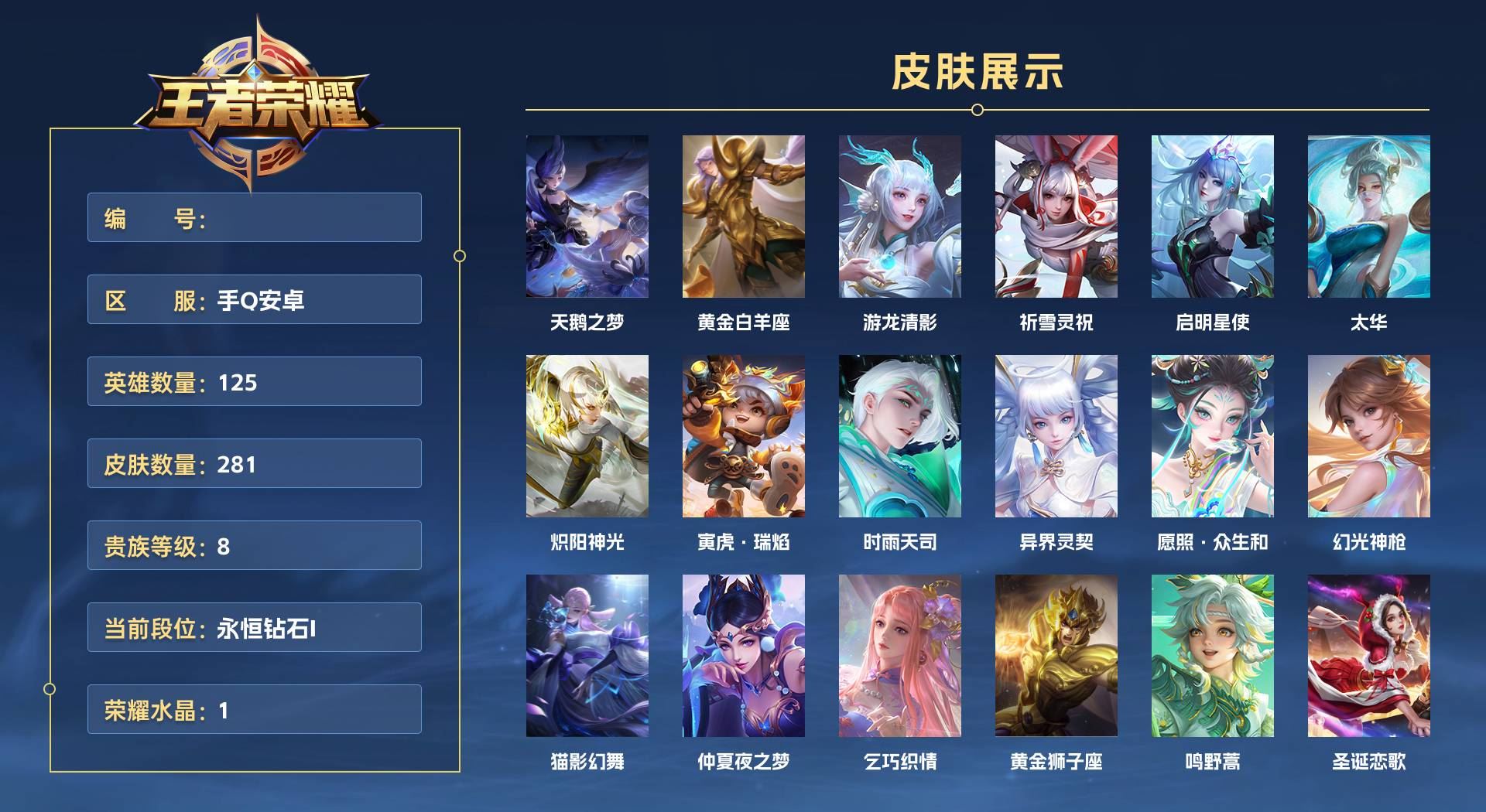 【云游堂】 【可二次实名】r42967 可二次 安卓QQ 营地ID《79470384》v10 贵族积分227264 《127英雄422皮肤》《夺宝幸运值106》《敖隐➕嬴政➕武则天》《7典藏》《1无双》《43传说》《142史诗》《韩信弑枪猎影➕李白鸣剑曳影➕夏侯惇无限飓风号➕孙悟空全息碎影➕鲁班七号星空梦想➕孙尚香杀手不太冷➕芈月大秦宣太后》《甄姬雪境奇遇》《孙策时之奇旅》《嬴政玄雷天君➕艾琳觅芳踪➕鲁班七号时之奇旅➕夏洛特浮生妄➕蔡文姬花朝如约➕赵云淬星耀世➕王昭君乞巧织情➕西施游龙清影➕曜李逍遥➕周瑜音你心动➕小乔音你心动➕李元芳飞鸢探春➕兰陵王默契交锋➕公孙离祈雪灵祝➕诸葛亮时雨天司➕绛天战甲➕镜炽阳神光➕虞姬启明星使➕孙悟空零号赤焰➕关羽武圣➕曜云鹰飞将➕李信一念神魔➕刘备时之恋人➕伽罗太华➕貂蝉猫影幻舞➕张良黄金白羊座➕干将莫邪久胜战神➕虞姬云霓雀翎➕达摩黄金狮子座➕百里玄策白虎志➕花木兰冠军飞将➕梦奇胖达荣荣➕后羿黄金射手座➕杨戬永耀之星➕诸葛亮武陵仙君➕貂蝉仲夏夜之梦➕李白凤求凰➕孙尚香末日机甲➕宫本武藏地狱之眼➕孙悟空地狱火➕吕布天魔缭乱➕武则天海洋之心➕狄仁杰超时空战士》《鬼谷子五谷丰年➕庄周高山流水➕猪八戒猪悟能➕百里玄策热力回旋➕吕布御风骁将➕牛魔奔雷神使➕裴擒虎李小龙➕张飞虎魄➕马超神威➕黄忠烈魂➕赵云龙胆➕瑶遇见神鹿➕庄周玄嵩➕甄姬幽恒➕典韦岱宗➕韩信飞衡➕上官婉儿梁祝➕伽罗箭羽风息➕花木兰瑞麟志➕苏烈玄武志➕百里守约朱雀志➕青龙志➕杨玉环遇见飞天➕裴擒虎梅西➕曙光守护者➕雅典娜神奇女侠➕后羿辉光之辰➕甄姬游园惊梦➕花木兰水晶猎龙者➕赵云引擎之心➕孙悟空至尊宝➕王昭君凤凰于飞➕关羽冰封战神➕老夫子圣诞老人》各种道具详情看截图、低价出售找回包 赔、截图展示段位不带表实际段位,如赛季更新等不可抗拒因素发生变化、时限道具不保证所剩时间、标题未写送点券默认不送【卖号买号首选亿梦】