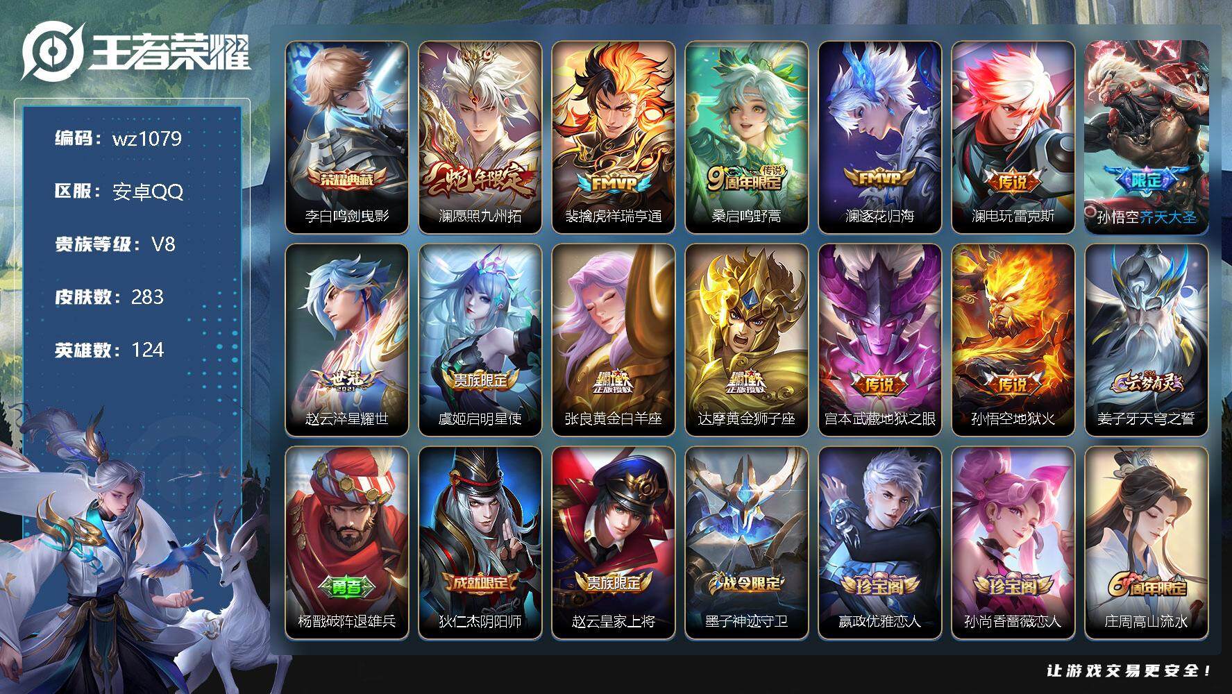 【云游堂】 【可二次实名】【wz1079】【商品标题】:安卓Q-V8-永恒钻石V段位-124英雄-283皮肤-1典藏-0珍品无双-0无双-0珍品传说-12传说-84史诗 【荣耀典藏】:李白鸣剑曳影 【传说皮肤】:澜愿照九州拓,裴擒虎祥瑞亨通,桑启鸣野蒿,澜逐花归海,澜电玩雷克斯,孙悟空齐天大圣,赵云淬星耀世,虞姬启明星使,张良黄金白羊座,达摩黄金狮子座,宫本武藏地狱之眼,孙悟空地狱火 【限定皮肤】:姜子牙天穹之誓,杨戬破阵退雄兵,狄仁杰阴阳师,赵云皇家上将,墨子神迹守卫,嬴政优雅恋人,孙尚香蔷薇恋人,庄周高山流水,钟无艳超时空战士,芈月幻夜卜梦,元歌无心,甄姬落雪兰心,典韦岱宗,马可波罗暗影游猎,马可波罗山海玄木吟,狄仁杰魔术师,达摩星际陆战队,达摩沙漠行僧,项羽海滩派对,老夫子航海奇遇记,程咬金演武夺筹,韩信逐梦之影,韩信傲雪梅枪,王昭君午后时光,兰陵王金庭之子,孙悟空至尊宝,孙悟空孙行者,孙悟空齐天大圣,后羿圣弓游侠,李元芳银河之约,李元芳匿光侦查者,李元芳云中旅人,虞姬启明星使,钟馗驱傩正仪,干将莫邪真爱魔法,雅典娜黎明之约,鬼谷子五谷丰年,黄忠火炮绅士,铠青龙志,苏烈千军破阵,百里玄策原初追逐者,梦奇顽趣,沈梦溪大漠名商,裴擒虎天狼狩猎者,裴擒虎擒涛扼浪,狂铁电玩高手,米莱狄胡桃异想国,云中君纤云弄巧,上官婉儿梁祝,嫦娥暖冬兔眠,鲁班大师探海日志,桑启海盐诗旅,暃星界游侠,阿古朵江河有灵,张良古海寻踪,蒙犽百解令,蒙恬荣光圣徽,鬼谷子天穹祈灯,姬小满妄想食味,沈梦溪龙舞盛年,刘邦剑破天穹,程咬金群星魔术团,刘备异域游侠,周瑜熔金海岸 【年限皮肤】:铠青龙志,典韦岱宗,马可波罗山海玄木吟 【赛季限定】:达摩沙漠行僧,程咬金演武夺筹,兰陵王金庭之子,张良古海寻踪,李元芳云中旅人,钟馗驱傩正仪,雅典娜黎明之约,苏烈千军破阵,百里玄策原初追逐者,梦奇顽趣,沈梦溪大漠名商,裴擒虎擒涛扼浪,鲁班大师探海日志,桑启海盐诗旅,鬼谷子天穹祈灯,蒙恬荣光圣徽,刘邦剑破天穹,姜子牙天穹之誓 【战令限定】:墨子神迹守卫,钟无艳超时空战士,芈月幻夜卜梦,甄姬落雪兰心,马可波罗暗影游猎,达摩星际陆战队,老夫子航海奇遇记,王昭君午后时光,后羿圣弓游侠,李元芳银河之约,干将莫邪真爱魔法,黄忠火炮绅士,狂铁电玩高手,米莱狄胡桃异想国,嫦娥暖冬兔眠,暃星界游侠 【史诗皮肤】:鲁班七号电玩小子,赵云皇家上将,赵云未来纪元,甄姬冰雪圆舞曲,王昭君偶像歌手,狄仁杰魔术师,宫本武藏鬼剑武藏,孙尚香蔷薇恋人,孙尚香水果甜心,嬴政优雅恋人,妲己魅力维加斯,妲己女仆咖啡,墨子金属风暴,吕布圣诞狂欢,曹操幽灵船长,李白千年之狐,吕布末日机甲,孙悟空至尊宝,花木兰水晶猎龙者,韩信逐梦之影,夏侯惇乘风破浪,小乔缤纷独角兽,兰陵王暗隐猎兽者,诸葛亮黄金分割率,亚瑟心灵战警,雅典娜冰冠公主,安琪拉心灵骇客,百里守约特工魅影,铠曙光守护者,蔡文姬舞动绿茵,刘禅天才门将,李元芳逐浪之夏,程咬金功夫厨神,白起星夜王子,阿轲节奏热浪,孙策猫狗日记,大乔猫狗日记,铠青龙志,伽罗箭羽风息,裴擒虎天狼狩猎者,狄仁杰鹰眼统帅,上官婉儿梁祝,李元芳银河之约,典韦岱宗,大乔白蛇,马可波罗暗影游猎,百里玄策原初追逐者,云中君纤云弄巧,米莱狄胡桃异想国,西施诗语江南,百里玄策热力回旋,老夫子航海奇遇记,干将莫邪真爱魔法,沈梦溪月团寄思,钟馗乐园奇幻夜,孙悟空孙行者,庄周高山流水,黄忠火炮绅士,雅典娜黎明之约,韩信傲雪梅枪,澜赏金猎手,高渐离天秀音浪,狂铁电玩高手,钟无艳超时空战士,鬼谷子五谷丰年,元歌无心,梦奇顽趣,暃星界游侠,马可波罗山海玄木吟,刘禅电玩爆裂旋风,李元芳匿光侦查者,阿古朵江河有灵,蒙犽百解令,蒙恬荣光圣徽,姬小满妄想食味,百里守约百相守梦,牛魔星界战将,孙膑茶境仙,亚连糖绘人间,阿轲化蝶舞,刘禅鸭鸭历险记,狂铁龙之律动,黄忠百相守梦,西施织梦人 【其他皮肤】:项羽海滩派对,韩信教廷特使,韩信街头霸王,露娜哥特玫瑰,阿轲爱心护理,达摩大发明家,赵云白执事,赵云忍炎影,芈月红桃皇后,程咬金星际陆战队,白起白色死神,牛魔西部大镖客,扁鹊化身博士,安琪拉玩偶对对碰,姜子牙时尚教父,妲己少女阿狸,典韦黄金武士,亚瑟死亡骑士,达摩拳王,花木兰兔女郎,张飞五福同心,甄姬花好人间,后羿阿尔法小队,狄仁杰阴阳师,刘备纽约教父,刘备汉昭烈帝,关羽龙腾万里,钟无艳海滩丽影,宫本武藏霸王丸,王昭君幻想奇妙夜,狂铁命运角斗场,老夫子功夫老勺,孙尚香沉稳之力,李白敏锐之力,鬼谷子幻乐之宴,明世隐虹云星官,小乔丁香结,吕布野性能量,孙膑归虚梦演,沈梦溪鲨炮海盗猫,姜子牙炽热元素使,哪吒次元突破,鲁班七号黑桃队长,盾山圆桌骑士,狂铁特工战影,刘禅秘密基地,露娜瓷语鉴心,达摩星际陆战队,程咬金演武夺筹,张良缤纷绘卷,钟馗驱傩正仪,墨子神迹