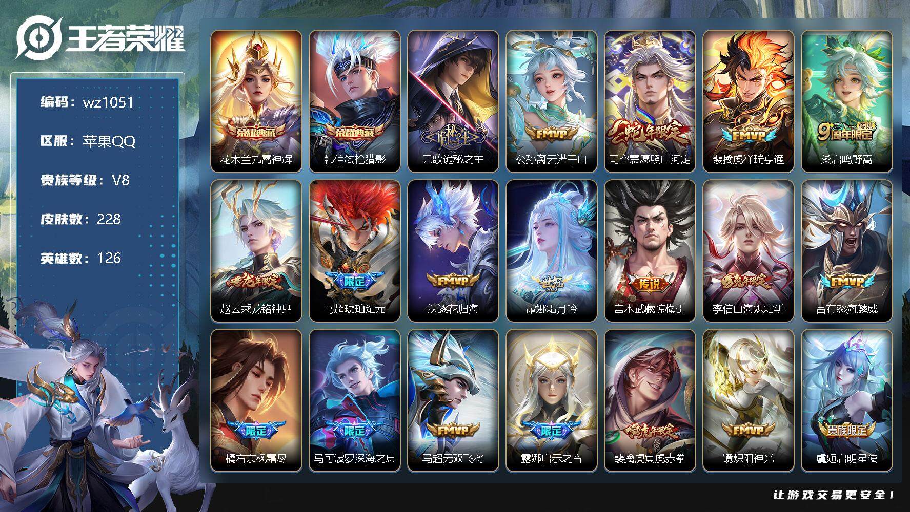 【云游堂】 【可二次实名】【wz1051】【商品标题】:苹果Q-V8-至尊星耀IV段位-126英雄-228皮肤-2典藏-0珍品无双-0无双-0珍品传说-24传说-71史诗 【荣耀典藏】:花木兰九霄神辉,韩信弑枪猎影 【传说皮肤】:元歌诡秘之主,公孙离云诺千山,司空震愿照山河定,裴擒虎祥瑞亨通,桑启鸣野蒿,赵云乘龙铭钟鼎,马超琥珀纪元,澜逐花归海,露娜霜月吟,宫本武藏惊梅引,李信山海炽霜斩,吕布怒海麟威,橘右京枫霜尽,马可波罗深海之息,马超无双飞将,露娜启示之音,裴擒虎寅虎赤拳,镜炽阳神光,虞姬启明星使,曜云鹰飞将,李信一念神魔,达摩黄金狮子座,花木兰冠军飞将,宫本武藏地狱之眼 【限定皮肤】:蔡文姬夏日便利店,虞姬夏日便利店,姜子牙天穹之誓,李白谪仙醉月,狄仁杰阴阳师,赵云皇家上将,孙尚香蔷薇恋人,庄周高山流水,白起夜都怪侠,芈月幻夜卜梦,周瑜赤莲之焰,元歌云间偶戏,元歌无心,马可波罗深海之息,狄仁杰魔术师,达摩沙漠行僧,项羽海滩派对,关羽百相守梦,程咬金演武夺筹,露娜启示之音,韩信飞衡,韩信傲雪梅枪,王昭君午后时光,兰陵王金庭之子,橘右京枫霜尽,后羿圣弓游侠,李元芳云中旅人,虞姬启明星使,钟馗驱傩正仪,干将莫邪真爱魔法,雅典娜黎明之约,鬼谷子五谷丰年,黄忠火炮绅士,苏烈千军破阵,百里玄策原初追逐者,梦奇顽趣,公孙离蜜橘之夏,沈梦溪大漠名商,明世隐吟游魔法,裴擒虎寅虎赤拳,裴擒虎擒涛扼浪,狂铁电玩高手,云中君纤云弄巧,李信山海炽霜斩,嫦娥暖冬兔眠,鲁班大师探海日志,镜匿光追影者,桑启海盐诗旅,戈娅驭风魔法,艾琳流音漫舞,司空震地狱燃心,蒙恬荣光圣徽,高渐离燃音魔法,妲己灵卜魔法,鬼谷子天穹祈灯,马超琥珀纪元,姬小满妄想食味,赵云乘龙铭钟鼎,沈梦溪龙舞盛年,刘邦剑破天穹,程咬金群星魔术团,镜青焰无极,项羽苍威无极,周瑜熔金海岸 【年限皮肤】:裴擒虎寅虎赤拳,韩信飞衡,马超神威,李信山海炽霜斩,赵云乘龙铭钟鼎 【赛季限定】:达摩沙漠行僧,程咬金演武夺筹,兰陵王金庭之子,李元芳云中旅人,钟馗驱傩正仪,雅典娜黎明之约,苏烈千军破阵,百里玄策原初追逐者,梦奇顽趣,沈梦溪大漠名商,裴擒虎擒涛扼浪,鲁班大师探海日志,桑启海盐诗旅,鬼谷子天穹祈灯,蒙恬荣光圣徽,刘邦剑破天穹,姜子牙天穹之誓 【战令限定】:蔡文姬夏日便利店,虞姬夏日便利店,白起夜都怪侠,芈月幻夜卜梦,周瑜赤莲之焰,元歌云间偶戏,王昭君午后时光,艾琳流音漫舞,后羿圣弓游侠,干将莫邪真爱魔法,黄忠火炮绅士,明世隐吟游魔法,狂铁电玩高手,嫦娥暖冬兔眠,司空震地狱燃心,戈娅驭风魔法,高渐离燃音魔法,妲己灵卜魔法,镜青焰无极,项羽苍威无极 【史诗皮肤】:露娜紫霞仙子,赵云皇家上将,赵云未来纪元,貂蝉圣诞恋歌,王昭君偶像歌手,狄仁杰魔术师,廉颇地狱岩魂,宫本武藏鬼剑武藏,孙尚香蔷薇恋人,嬴政摇滚巨星,妲己魅力维加斯,吕布圣诞狂欢,刘禅绅士熊喵,曹操幽灵船长,李白千年之狐,吕布末日机甲,韩信白龙吟,刘邦德古拉伯爵,夏侯惇乘风破浪,小乔缤纷独角兽,兰陵王暗隐猎兽者,亚瑟心灵战警,雅典娜冰冠公主,百里守约特工魅影,蔡文姬舞动绿茵,公孙离蜜橘之夏,李元芳逐浪之夏,程咬金功夫厨神,白起星夜王子,阿轲节奏热浪,孙策猫狗日记,狄仁杰鹰眼统帅,娜可露露晚萤,韩信飞衡,不知火舞魅语,橘右京修罗,马超神威,百里玄策原初追逐者,云中君纤云弄巧,元歌云间偶戏,干将莫邪真爱魔法,庄周高山流水,镜匿光追影者,黄忠火炮绅士,雅典娜黎明之约,韩信傲雪梅枪,夏洛特永昼,明世隐吟游魔法,狂铁电玩高手,鬼谷子五谷丰年,元歌无心,梦奇顽趣,关羽百相守梦,戈娅驭风魔法,司空震地狱燃心,妲己灵卜魔法,高渐离燃音魔法,蒙恬荣光圣徽,姬小满妄想食味,镜青焰无极,蔡文姬夏日便利店,大司命东方月初,李白谪仙醉月,牛魔星界战将,孙膑茶境仙,赵怀真器灵浮梦炉,狂铁龙之律动,后羿石田雨龙,周瑜百相守梦,黄忠百相守梦,公孙离涂山容容,莱西奥光弋星穹 【其他皮肤】:项羽海滩派对,韩信教廷特使,韩信街头霸王,露娜哥特玫瑰,达摩大发明家,赵云白执事,芈月红桃皇后,白起白色死神,牛魔西部大镖客,武则天东方不败,扁鹊化身博士,宫本武藏未来纪元,孙膑天使之翼,姜子牙时尚教父,典韦黄金武士,亚瑟死亡骑士,达摩拳王,张飞五福同心,甄姬花好人间,宫本武藏万象初新,狄仁杰阴阳师,刘备纽约教父,刘备汉昭烈帝,关羽龙腾万里,王昭君幻想奇妙夜,狂铁命运角斗场,老夫子功夫老勺,李白敏锐之力,鬼谷子幻乐之宴,大乔守护之力,小乔丁香结,吕布野性能量,孙膑归虚梦演,姜子牙炽热元素使,周瑜赤莲之焰,哪吒次元突破,狂铁特工战影,程咬金演武夺筹,钟馗驱傩正仪,鲁班大师乓乓大师,苏烈千军破阵,后羿圣弓游侠,达摩沙漠行僧,芈月幻夜卜梦,白起夜都怪侠,兰陵王金庭之子,刘禅唤灵魔甲,米莱狄契约魔法,王昭君午后时光,沈梦