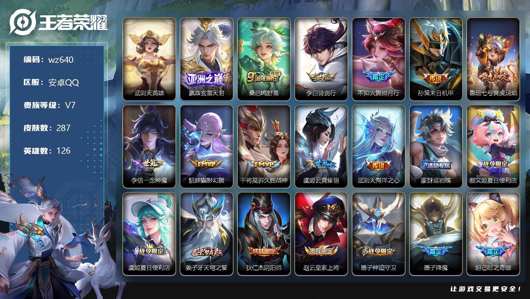 【云游堂】 【可二次实名】【wz640】【商品标题】:安卓Q-V7-最强王者段位-126英雄-287皮肤-0典藏-0珍品无双-0无双-0珍品传说-11传说-85史诗 【荣耀典藏】:武则天英雄 【传说皮肤】:嬴政玄雷天君,桑启鸣野蒿,李白诗剑行,不知火舞绯月行,孙策末日机甲,鲁班七号寅虎瑞焰,李信一念神魔,貂蝉猫影幻舞,干将莫邪久胜战神,虞姬云霓雀翎,武则天海洋之心 【限定皮肤】:蒙犽顽岩魄,蔡文姬夏日便利店,虞姬夏日便利店,姜子牙天穹之誓,狄仁杰阴阳师,赵云皇家上将,墨子神迹守卫,墨子降魔,妲己时之奇旅,嬴政白昼王子,孙尚香蔷薇恋人,鲁班七号寅虎瑞焰,庄周高山流水,钟无艳超时空战士,孙膑寅虎展翼,芈月重明,芈月幻夜卜梦,吕布猎兽之王,周瑜赤莲之焰,元歌无心,夏侯惇朔风刀,甄姬游园惊梦,甄姬落雪兰心,曹操烛龙,典韦穷奇,典韦蓝屏警告,马可波罗山海玄木吟,狄仁杰魔术师,狄仁杰万华元夜,达摩沙漠行僧,项羽海滩派对,老夫子航海奇遇记,程咬金演武夺筹,露娜一生所爱,兰陵王驯魔猎人,兰陵王金庭之子,不知火舞绯月行,孙悟空孙行者,牛魔御旌,后羿圣弓游侠,李元芳银河之约,李元芳云中旅人,钟馗神迹守卫,钟馗驱傩正仪,杨玉环遇见飞天,女娲朔望之晖,干将莫邪冰霜恋舞曲,干将莫邪真爱魔法,雅典娜单词大作战,太乙真人饕餮,鬼谷子原初探秘者,鬼谷子五谷丰年,黄忠火炮绅士,苏烈千军破阵,弈星混沌棋,梦奇顽趣,沈梦溪星空之诺,沈梦溪大漠名商,狂铁御狮,米莱狄御霄,盾山御銮,猪八戒猪悟能,上官婉儿梁祝,上官婉儿神器万象笔,嫦娥拒霜思,嫦娥暖冬兔眠,鲁班大师探海日志,桑启海盐诗旅,金蝉唐三藏,暃星界游侠,艾琳女武神,阿古朵江河有灵,张良古海寻踪,蒙犽百解令,鬼谷子天穹祈灯,刘邦剑破天穹,周瑜熔金海岸 【年限皮肤】:孙膑寅虎展翼,鲁班七号寅虎瑞焰,马超神威,马可波罗山海玄木吟 【赛季限定】:芈月重明,夏侯惇朔风刀,曹操烛龙,典韦穷奇,狄仁杰万华元夜,达摩沙漠行僧,程咬金演武夺筹,兰陵王金庭之子,张良古海寻踪,牛魔御旌,李元芳云中旅人,钟馗驱傩正仪,太乙真人饕餮,鬼谷子原初探秘者,苏烈千军破阵,弈星混沌棋,梦奇顽趣,沈梦溪大漠名商,狂铁御狮,米莱狄御霄,盾山御銮,鲁班大师探海日志,桑启海盐诗旅,鬼谷子天穹祈灯,刘邦剑破天穹,姜子牙天穹之誓 【战令限定】:墨子神迹守卫,蔡文姬夏日便利店,虞姬夏日便利店,嬴政白昼王子,钟无艳超时空战士,芈月幻夜卜梦,吕布猎兽之王,周瑜赤莲之焰,甄姬落雪兰心,典韦蓝屏警告,老夫子航海奇遇记,兰陵王驯魔猎人,后羿圣弓游侠,李元芳银河之约,钟馗神迹守卫,女娲朔望之晖,干将莫邪真爱魔法,雅典娜单词大作战,黄忠火炮绅士,沈梦溪星空之诺,嫦娥暖冬兔眠,暃星界游侠 【史诗皮肤】:项羽苍穹之光,露娜紫霞仙子,阿轲暗夜猫娘,赵云皇家上将,赵云未来纪元,貂蝉圣诞恋歌,甄姬冰雪圆舞曲,王昭君偶像歌手,狄仁杰魔术师,廉颇地狱岩魂,宫本武藏鬼剑武藏,孙尚香蔷薇恋人,孙尚香水果甜心,嬴政暗夜贵公子,嬴政摇滚巨星,妲己魅力维加斯,妲己女仆咖啡,墨子龙骑士,墨子金属风暴,吕布圣诞狂欢,刘禅绅士熊喵,曹操幽灵船长,李白千年之狐,吕布末日机甲,花木兰水晶猎龙者,刘邦德古拉伯爵,夏侯惇乘风破浪,小乔缤纷独角兽,兰陵王暗隐猎兽者,诸葛亮黄金分割率,甄姬游园惊梦,亚瑟心灵战警,安琪拉心灵骇客,百里守约特工魅影,铠曙光守护者,刘禅天才门将,李元芳逐浪之夏,程咬金功夫厨神,白起星夜王子,阿轲节奏热浪,杨玉环遇见飞天,嬴政白昼王子,大乔猫狗日记,干将莫邪冰霜恋舞曲,露娜一生所爱,典韦蓝屏警告,伽罗箭羽风息,狄仁杰鹰眼统帅,兰陵王驯魔猎人,上官婉儿梁祝,李元芳银河之约,娜可露露晚萤,不知火舞魅语,马超神威,孙尚香时之恋人,老夫子航海奇遇记,干将莫邪真爱魔法,孙悟空孙行者,猪八戒猪悟能,庄周高山流水,嫦娥拒霜思,黄忠火炮绅士,孙膑寅虎展翼,哪吒雪上飞焰,张良千筹问战,金蝉唐三藏,钟无艳超时空战士,妲己时之奇旅,鬼谷子五谷丰年,上官婉儿神器万象笔,元歌无心,墨子降魔,梦奇顽趣,暃星界游侠,马可波罗山海玄木吟,阿古朵江河有灵,姜子牙闲日渔趣,蒙犽百解令,蔡文姬夏日便利店,蒙犽顽岩魄,牛魔星界战将,刘禅鸭鸭历险记,狂铁龙之律动,后羿石田雨龙,西施织梦人 【其他皮肤】:项羽海滩派对,韩信教廷特使,韩信街头霸王,露娜哥特玫瑰,阿轲致命风华,达摩大发明家,赵云白执事,赵云忍炎影,芈月红桃皇后,艾琳女武神,程咬金星际陆战队,白起白色死神,牛魔西部大镖客,武则天东方不败,扁鹊化身博士,扁鹊救世之瞳,宫本武藏未来纪元,安琪拉玩偶对对碰,孙膑天使之翼,姜子牙时尚教父,妲己少女阿狸,典韦黄金武士,亚瑟死亡骑士,达摩拳王,花木兰兔女郎,张飞五福同心,甄姬花好人间,刘备万事如意,后羿阿尔法小队,狄仁杰阴阳师,刘备纽约教父,刘备汉昭烈帝
