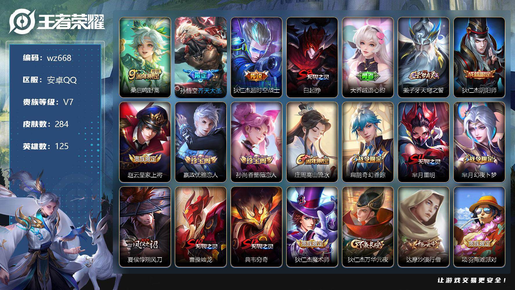 【云游堂】 【可二次实名】【wz668】【商品标题】:安卓Q-V7-永恒钻石III段位-125英雄-284皮肤-0典藏-0珍品无双-0无双-0珍品传说-3传说-53史诗 【传说皮肤】:桑启鸣野蒿,孙悟空齐天大圣,狄仁杰超时空战士 【限定皮肤】:白起狰,大乔绒语心约,姜子牙天穹之誓,狄仁杰阴阳师,赵云皇家上将,嬴政优雅恋人,孙尚香蔷薇恋人,庄周高山流水,扁鹊奇幻香踪,芈月重明,芈月幻夜卜梦,夏侯惇朔风刀,曹操烛龙,典韦穷奇,狄仁杰魔术师,狄仁杰万华元夜,达摩沙漠行僧,项羽海滩派对,程咬金演武夺筹,兰陵王金庭之子,孙悟空齐天大圣,牛魔御旌,李元芳云中旅人,钟馗驱傩正仪,杨戬潮玩骑兵,太乙真人饕餮,鬼谷子原初探秘者,鬼谷子五谷丰年,黄忠火炮绅士,苏烈千军破阵,弈星混沌棋,沈梦溪星空之诺,沈梦溪大漠名商,明世隐疑决卦,裴擒虎李小龙,裴擒虎擒涛扼浪,狂铁御狮,云中君纤云弄巧,盾山御銮,上官婉儿梁祝,嫦娥拒霜思,嫦娥暖冬兔眠,鲁班大师探海日志,桑启海盐诗旅,暃星界游侠,阿古朵江河有灵,张良古海寻踪,蒙犽百解令,蒙恬荣光圣徽,高渐离燃音魔法,妲己灵卜魔法,鬼谷子天穹祈灯,沈梦溪龙舞盛年,鲁班七号蔬乡物语,李元芳蔬乡物语,刘邦剑破天穹,程咬金群星魔术团,刘备异域游侠,周瑜熔金海岸 【赛季限定】:白起狰,芈月重明,夏侯惇朔风刀,曹操烛龙,典韦穷奇,狄仁杰万华元夜,达摩沙漠行僧,程咬金演武夺筹,兰陵王金庭之子,张良古海寻踪,牛魔御旌,李元芳云中旅人,钟馗驱傩正仪,太乙真人饕餮,鬼谷子原初探秘者,苏烈千军破阵,弈星混沌棋,沈梦溪大漠名商,明世隐疑决卦,裴擒虎擒涛扼浪,狂铁御狮,盾山御銮,鲁班大师探海日志,桑启海盐诗旅,鬼谷子天穹祈灯,蒙恬荣光圣徽,刘邦剑破天穹,姜子牙天穹之誓 【战令限定】:扁鹊奇幻香踪,芈月幻夜卜梦,杨戬潮玩骑兵,黄忠火炮绅士,沈梦溪星空之诺,嫦娥暖冬兔眠,暃星界游侠,高渐离燃音魔法,妲己灵卜魔法,鲁班七号蔬乡物语,李元芳蔬乡物语 【史诗皮肤】:露娜紫霞仙子,赵云皇家上将,赵云未来纪元,貂蝉圣诞恋歌,甄姬冰雪圆舞曲,王昭君偶像歌手,狄仁杰魔术师,宫本武藏鬼剑武藏,孙尚香蔷薇恋人,孙尚香水果甜心,嬴政优雅恋人,妲己魅力维加斯,曹操幽灵船长,李白千年之狐,花木兰水晶猎龙者,夏侯惇乘风破浪,兰陵王暗隐猎兽者,亚瑟心灵战警,雅典娜冰冠公主,安琪拉心灵骇客,百里守约特工魅影,铠曙光守护者,程咬金功夫厨神,白起星夜王子,阿轲节奏热浪,狄仁杰鹰眼统帅,上官婉儿梁祝,小乔青蛇,孙尚香时之恋人,裴擒虎李小龙,云中君纤云弄巧,杨戬天秀启明,庄周高山流水,嫦娥拒霜思,黄忠火炮绅士,鬼谷子五谷丰年,暃星界游侠,扁鹊奇幻香踪,阿古朵江河有灵,蒙犽百解令,周瑜雪夜绮愿,妲己灵卜魔法,高渐离燃音魔法,蒙恬荣光圣徽,鲁班七号蔬乡物语,廉颇撼地雄心,亚连破空之剑,百里守约百相守梦,牛魔星界战将,孙膑茶境仙,阿轲化蝶舞,刘禅鸭鸭历险记,狂铁龙之律动,公孙离涂山容容 【其他皮肤】:项羽海滩派对,韩信教廷特使,韩信街头霸王,露娜哥特玫瑰,阿轲爱心护理,达摩大发明家,赵云白执事,赵云忍炎影,芈月红桃皇后,程咬金星际陆战队,白起白色死神,牛魔西部大镖客,扁鹊化身博士,扁鹊救世之瞳,宫本武藏未来纪元,安琪拉玩偶对对碰,孙膑天使之翼,姜子牙时尚教父,妲己少女阿狸,典韦黄金武士,亚瑟死亡骑士,花木兰兔女郎,张飞五福同心,甄姬花好人间,刘备万事如意,宫本武藏万象初新,后羿阿尔法小队,狄仁杰阴阳师,刘备纽约教父,刘备汉昭烈帝,关羽龙腾万里,白起狰,钟无艳海滩丽影,太乙真人饕餮,宫本武藏霸王丸,曹操烛龙,王昭君幻想奇妙夜,芈月重明,狂铁命运角斗场,老夫子功夫老勺,孙尚香沉稳之力,典韦穷奇,诸葛亮掌控之力,李白敏锐之力,鬼谷子幻乐之宴,狂铁御狮,苏烈坚韧之力,大乔守护之力,明世隐虹云星官,庄周奇妙博物学,牛魔御旌,小乔丁香结,吕布野性能量,盾山御銮,沈梦溪鲨炮海盗猫,姜子牙炽热元素使,夏侯惇朔风刀,沈梦溪星空之诺,弈星混沌棋,哪吒次元突破,鲁班七号黑桃队长,明世隐疑决卦,盾山圆桌骑士,狂铁特工战影,廉颇无尽征程,鬼谷子原初探秘者,狄仁杰万华元夜,刘禅秘密基地,杨戬次元傲视,露娜瓷语鉴心,程咬金演武夺筹,张良缤纷绘卷,钟馗驱傩正仪,鲁班大师乓乓大师,苏烈千军破阵,达摩沙漠行僧,芈月幻夜卜梦,程咬金无双福将,刘邦虎啸剑宗,兰陵王金庭之子,刘禅唤灵魔甲,沈梦溪大漠名商,蒙犽胡桃狂想曲,蒙恬蔚蓝守将,李元芳云中旅人,戈娅危途狂花,刘备潮玩造梦师,桑启海盐诗旅,嫦娥暖冬兔眠,海月幻泉雾影,猪八戒潮玩探月行,牛魔牛运亨通,白起乐园追猎者,赵怀真太极少年,裴擒虎擒涛扼浪,杨戬潮玩骑兵,太乙真人劲辣红锅,莱西奥西部游侠,鲁班大师探海日志,姬小满零食大作战,李元芳妄想特派,张良古海寻踪,曹操决胜大满贯,后羿完美运算,程咬金暖冬