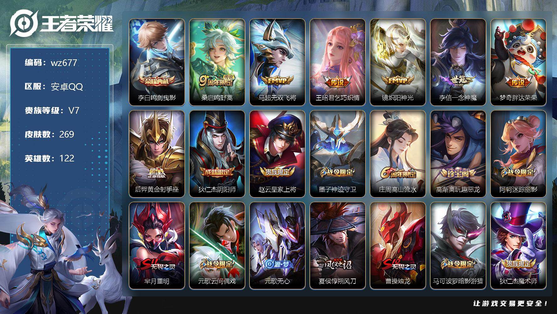 【云游堂】 【可二次实名】【wz677】【商品标题】:安卓Q-V7-尊贵铂金IV段位-122英雄-269皮肤-1典藏-0珍品无双-0无双-0珍品传说-7传说-64史诗 【荣耀典藏】:李白鸣剑曳影 【传说皮肤】:桑启鸣野蒿,马超无双飞将,王昭君乞巧织情,镜炽阳神光,李信一念神魔,梦奇胖达荣荣,后羿黄金射手座 【限定皮肤】:狄仁杰阴阳师,赵云皇家上将,墨子神迹守卫,庄周高山流水,高渐离玩趣恶龙,阿轲迷踪丽影,芈月重明,元歌云间偶戏,元歌无心,夏侯惇朔风刀,曹操烛龙,马可波罗暗影游猎,狄仁杰魔术师,狄仁杰万华元夜,达摩星际陆战队,达摩沙漠行僧,项羽海滩派对,老夫子醍醐杖,老夫子航海奇遇记,关羽冰锋战神,程咬金演武夺筹,刘邦夺宝奇兵,韩信逐梦之影,兰陵王金庭之子,花木兰青春决赛季,花木兰默契交锋,亚瑟潮玩骑士王,孙悟空至尊宝,孙悟空大圣娶亲,牛魔御旌,后羿圣弓游侠,李元芳云中旅人,钟馗驱傩正仪,杨玉环遇见飞天,干将莫邪真爱魔法,鬼谷子原初探秘者,鬼谷子五谷丰年,苏烈千军破阵,百里玄策原初追逐者,百里守约朱雀志,弈星混沌棋,沈梦溪大漠名商,明世隐疑决卦,裴擒虎李小龙,裴擒虎擒涛扼浪,狂铁御狮,米莱狄御霄,米莱狄胡桃异想国,云中君纤云弄巧,盾山御銮,猪八戒西部大镖客,猪八戒猪悟能,上官婉儿梁祝,嫦娥拒霜思,鲁班大师探海日志,镜匿光追影者,桑启海盐诗旅,艾琳女武神,阿古朵江河有灵,张良古海寻踪,蒙恬荣光圣徽,高渐离燃音魔法,妲己灵卜魔法,鬼谷子天穹祈灯,刘邦剑破天穹,周瑜熔金海岸 【年限皮肤】:百里守约朱雀志,马超神威 【赛季限定】:芈月重明,夏侯惇朔风刀,曹操烛龙,狄仁杰万华元夜,达摩沙漠行僧,老夫子醍醐杖,程咬金演武夺筹,兰陵王金庭之子,张良古海寻踪,牛魔御旌,李元芳云中旅人,钟馗驱傩正仪,鬼谷子原初探秘者,苏烈千军破阵,百里玄策原初追逐者,弈星混沌棋,沈梦溪大漠名商,明世隐疑决卦,裴擒虎擒涛扼浪,狂铁御狮,米莱狄御霄,盾山御銮,鲁班大师探海日志,桑启海盐诗旅,鬼谷子天穹祈灯,蒙恬荣光圣徽,刘邦剑破天穹 【战令限定】:墨子神迹守卫,阿轲迷踪丽影,元歌云间偶戏,马可波罗暗影游猎,达摩星际陆战队,老夫子航海奇遇记,刘邦夺宝奇兵,亚瑟潮玩骑士王,后羿圣弓游侠,干将莫邪真爱魔法,米莱狄胡桃异想国,猪八戒西部大镖客,高渐离燃音魔法,妲己灵卜魔法 【史诗皮肤】:项羽苍穹之光,露娜紫霞仙子,赵云皇家上将,貂蝉圣诞恋歌,甄姬冰雪圆舞曲,狄仁杰魔术师,宫本武藏鬼剑武藏,孙尚香水果甜心,妲己魅力维加斯,墨子金属风暴,吕布圣诞狂欢,刘禅绅士熊喵,曹操幽灵船长,李白千年之狐,张飞乱世虎臣,韩信白龙吟,关羽冰锋战神,孙悟空至尊宝,花木兰水晶猎龙者,刘邦德古拉伯爵,韩信逐梦之影,夏侯惇乘风破浪,小乔缤纷独角兽,兰陵王暗隐猎兽者,安琪拉心灵骇客,花木兰青春决赛季,百里守约特工魅影,铠曙光守护者,李元芳逐浪之夏,程咬金功夫厨神,阿轲节奏热浪,杨玉环遇见飞天,百里守约朱雀志,孙悟空大圣娶亲,伽罗箭羽风息,狄仁杰鹰眼统帅,上官婉儿梁祝,娜可露露晚萤,大乔白蛇,阿轲迷踪丽影,橘右京修罗,马超神威,马可波罗暗影游猎,百里玄策原初追逐者,裴擒虎李小龙,云中君纤云弄巧,元歌云间偶戏,花木兰默契交锋,米莱狄胡桃异想国,老夫子航海奇遇记,干将莫邪真爱魔法,沈梦溪月团寄思,猪八戒猪悟能,庄周高山流水,嫦娥拒霜思,镜匿光追影者,鬼谷子五谷丰年,元歌无心,刘禅电玩爆裂旋风,阿古朵江河有灵,妲己灵卜魔法,高渐离燃音魔法,蒙恬荣光圣徽,亚连破空之剑,弈星万物之道 【其他皮肤】:项羽海滩派对,韩信教廷特使,韩信街头霸王,露娜哥特玫瑰,阿轲爱心护理,达摩大发明家,赵云忍炎影,艾琳女武神,白起白色死神,武则天东方不败,扁鹊化身博士,宫本武藏未来纪元,安琪拉玩偶对对碰,孙膑天使之翼,姜子牙时尚教父,妲己少女阿狸,典韦黄金武士,亚瑟死亡骑士,达摩拳王,花木兰兔女郎,张飞五福同心,甄姬花好人间,刘备万事如意,宫本武藏万象初新,后羿阿尔法小队,狄仁杰阴阳师,刘备纽约教父,关羽龙腾万里,墨子进击墨子号,钟无艳海滩丽影,曹操烛龙,王昭君幻想奇妙夜,芈月重明,狂铁命运角斗场,老夫子功夫老勺,牛魔制霸全明星,孙尚香沉稳之力,诸葛亮掌控之力,李白敏锐之力,鬼谷子幻乐之宴,狂铁御狮,苏烈坚韧之力,大乔守护之力,米莱狄御霄,明世隐虹云星官,庄周奇妙博物学,牛魔御旌,小乔丁香结,吕布野性能量,盾山御銮,孙膑归虚梦演,高渐离玩趣恶龙,沈梦溪鲨炮海盗猫,姜子牙炽热元素使,夏侯惇朔风刀,弈星混沌棋,哪吒次元突破,鲁班七号黑桃队长,明世隐疑决卦,刘邦夺宝奇兵,盾山圆桌骑士,老夫子醍醐杖,猪八戒西部大镖客,狂铁特工战影,鬼谷子原初探秘者,狄仁杰万华元夜,亚瑟潮玩骑士王,刘禅秘密基地,杨戬次元傲视,露娜瓷语鉴心,达摩星际陆战队,程咬金演武夺筹,张良缤纷绘卷