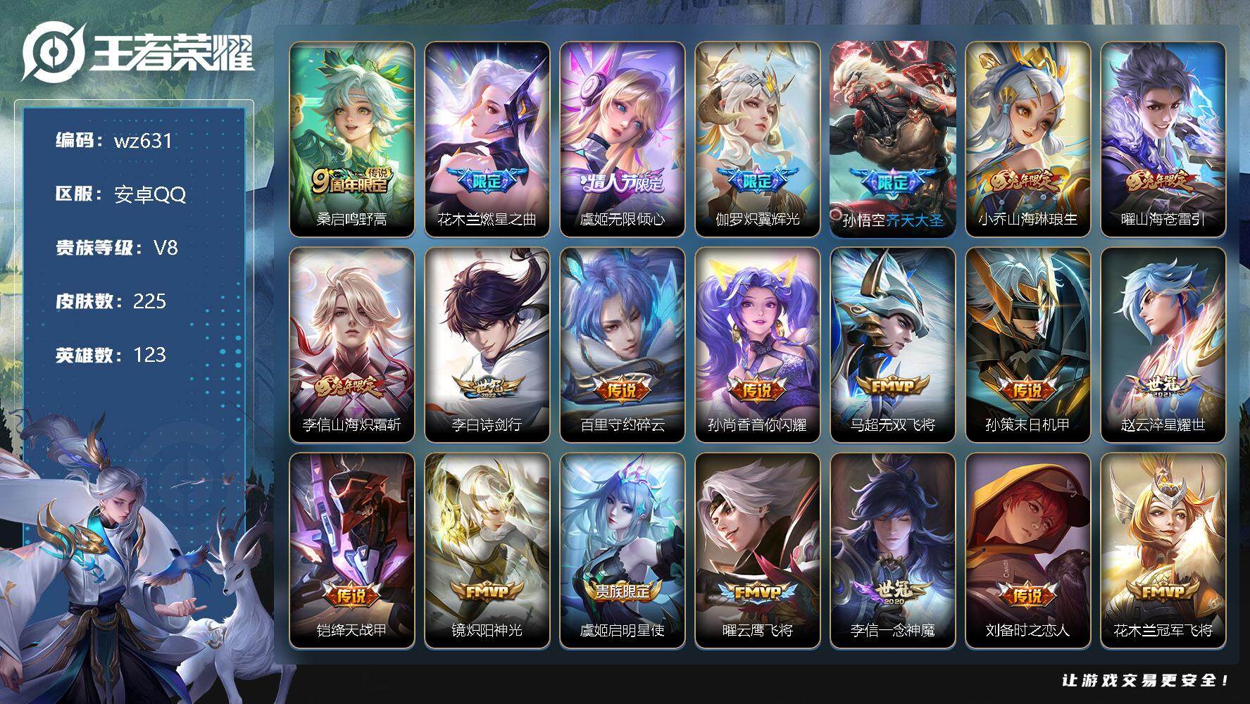 【云游堂】 【可二次实名】【wz631】【商品标题】:安卓Q-V8-最强王者段位-123英雄-225皮肤-0典藏-0珍品无双-0无双-0珍品传说-24传说-58史诗 【传说皮肤】:桑启鸣野蒿,花木兰燃星之曲,虞姬无限倾心,伽罗炽翼辉光,孙悟空齐天大圣,小乔山海琳琅生,曜山海苍雷引,李信山海炽霜斩,李白诗剑行,百里守约碎云,孙尚香音你闪耀,马超无双飞将,孙策末日机甲,赵云淬星耀世,铠绛天战甲,镜炽阳神光,虞姬启明星使,曜云鹰飞将,李信一念神魔,刘备时之恋人,花木兰冠军飞将,孙尚香末日机甲,孙悟空地狱火,狄仁杰超时空战士 【限定皮肤】:蒙犽顽岩魄,姜子牙天穹之誓,杨戬破阵退雄兵,狄仁杰阴阳师,小乔山海琳琅生,赵云皇家上将,孙尚香蔷薇恋人,高渐离玩趣恶龙,马可波罗山海玄木吟,狄仁杰魔术师,狄仁杰万华元夜,项羽海滩派对,老夫子醍醐杖,程咬金演武夺筹,兰陵王金庭之子,花木兰燃星之曲,孙悟空孙行者,孙悟空齐天大圣,后羿圣弓游侠,李元芳云中旅人,虞姬启明星使,虞姬无限倾心,钟馗驱傩正仪,杨玉环遇见飞天,鬼谷子原初探秘者,苏烈千军破阵,沈梦溪大漠名商,裴擒虎李小龙,裴擒虎擒涛扼浪,瑶山海碧波行,李信山海炽霜斩,伽罗炽翼辉光,嫦娥暖冬兔眠,曜山海苍雷引,西施玲珑珍味,鲁班大师探海日志,桑启海盐诗旅,暃星界游侠,戈娅驭风魔法,艾琳流音漫舞,司空震地狱燃心,阿古朵江河有灵,张良古海寻踪,鬼谷子天穹祈灯,沈梦溪龙舞盛年,刘邦剑破天穹,程咬金群星魔术团,周瑜熔金海岸 【年限皮肤】:瑶山海碧波行,马可波罗山海玄木吟,李信山海炽霜斩,小乔山海琳琅生,曜山海苍雷引,伽罗炽翼辉光 【赛季限定】:狄仁杰万华元夜,老夫子醍醐杖,程咬金演武夺筹,兰陵王金庭之子,张良古海寻踪,李元芳云中旅人,钟馗驱傩正仪,鬼谷子原初探秘者,苏烈千军破阵,沈梦溪大漠名商,裴擒虎擒涛扼浪,鲁班大师探海日志,桑启海盐诗旅,鬼谷子天穹祈灯,刘邦剑破天穹,姜子牙天穹之誓 【战令限定】:艾琳流音漫舞,后羿圣弓游侠,嫦娥暖冬兔眠,西施玲珑珍味,司空震地狱燃心,暃星界游侠,戈娅驭风魔法 【史诗皮肤】:鲁班七号电玩小子,露娜紫霞仙子,赵云皇家上将,赵云未来纪元,貂蝉圣诞恋歌,甄姬冰雪圆舞曲,王昭君偶像歌手,狄仁杰魔术师,廉颇地狱岩魂,宫本武藏鬼剑武藏,孙尚香蔷薇恋人,孙尚香水果甜心,嬴政暗夜贵公子,妲己魅力维加斯,妲己女仆咖啡,墨子金属风暴,吕布圣诞狂欢,吕布末日机甲,张飞乱世虎臣,韩信白龙吟,花木兰水晶猎龙者,刘邦德古拉伯爵,夏侯惇乘风破浪,小乔缤纷独角兽,兰陵王暗隐猎兽者,亚瑟心灵战警,安琪拉心灵骇客,百里守约特工魅影,铠曙光守护者,蔡文姬舞动绿茵,刘禅天才门将,阿轲节奏热浪,杨玉环遇见飞天,孙策猫狗日记,狄仁杰鹰眼统帅,娜可露露晚萤,不知火舞魅语,橘右京修罗,孙尚香时之恋人,裴擒虎李小龙,百里玄策热力回旋,安琪拉时之奇旅,孙悟空孙行者,澜赏金猎手,貂蝉唤灵魅影,庄周天秀幻梦,暃星界游侠,马可波罗山海玄木吟,瑶山海碧波行,刘禅电玩爆裂旋风,戈娅驭风魔法,司空震地狱燃心,阿古朵江河有灵,蒙犽顽岩魄,牛魔星界战将,阿轲化蝶舞,黄忠百相守梦,西施织梦人 【其他皮肤】:项羽海滩派对,韩信教廷特使,韩信街头霸王,露娜哥特玫瑰,阿轲致命风华,达摩大发明家,赵云忍炎影,芈月红桃皇后,程咬金星际陆战队,白起白色死神,牛魔西部大镖客,武则天东方不败,扁鹊化身博士,扁鹊救世之瞳,姜子牙时尚教父,妲己少女阿狸,典韦黄金武士,亚瑟死亡骑士,达摩拳王,花木兰兔女郎,张飞五福同心,甄姬花好人间,刘备万事如意,宫本武藏万象初新,狄仁杰阴阳师,刘备汉昭烈帝,关羽龙腾万里,墨子进击墨子号,钟无艳海滩丽影,王昭君幻想奇妙夜,孙尚香沉稳之力,李白敏锐之力,苏烈坚韧之力,大乔守护之力,吕布野性能量,孙膑归虚梦演,高渐离玩趣恶龙,沈梦溪鲨炮海盗猫,姜子牙炽热元素使,哪吒次元突破,盾山圆桌骑士,老夫子醍醐杖,狂铁特工战影,鬼谷子原初探秘者,狄仁杰万华元夜,刘禅秘密基地,露娜瓷语鉴心,程咬金演武夺筹,钟馗驱傩正仪,鲁班大师乓乓大师,苏烈千军破阵,后羿圣弓游侠,程咬金无双福将,兰陵王金庭之子,刘禅唤灵魔甲,沈梦溪大漠名商,李元芳云中旅人,戈娅危途狂花,桑启海盐诗旅,嫦娥暖冬兔眠,猪八戒潮玩探月行,裴擒虎擒涛扼浪,太乙真人劲辣红锅,鲁班大师探海日志,西施玲珑珍味,姬小满零食大作战,李元芳妄想特派,哪吒热血海滩,艾琳流音漫舞,张良古海寻踪,钟无艳聚星闪耀,后羿完美运算,鬼谷子天穹祈灯,廉颇功夫炙烤,沈梦溪龙舞盛年,钟无艳春野之旅,刘邦剑破天穹,程咬金群星魔术团,杨戬破阵退雄兵,姜子牙天穹之誓,周瑜熔金海岸,盘古敬我三分,东皇太一噬灭天穹,干将莫邪雾都夜雨,苍苍林狼骑,太乙真人谧流熔炉,典韦铁骨偃魂,西施雪境奇遇,姜子牙星梦巡礼,明世隐景韶洛都,戈娅玫蓝誓约,刘备浪漫序章