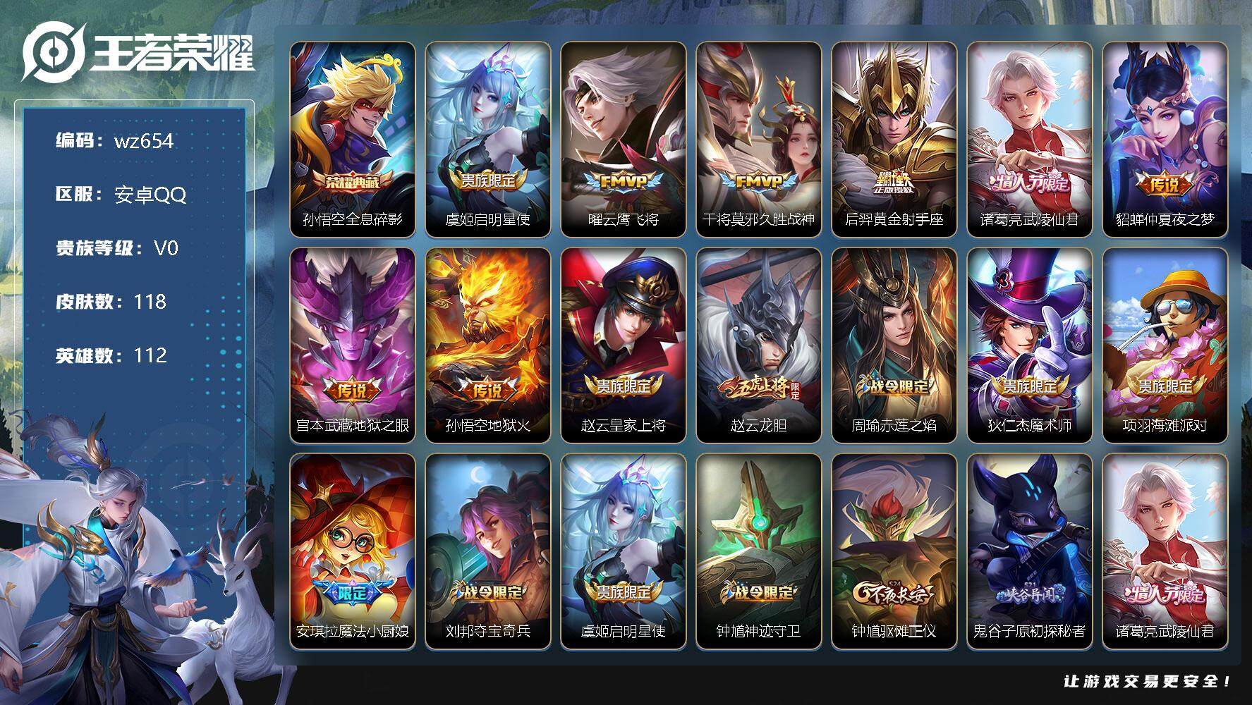 【云游堂】 【可二次实名】【wz654】【商品标题】:安卓Q-V0-尊贵铂金I段位-112英雄-118皮肤-1典藏-0珍品无双-0无双-0珍品传说-8传说-31史诗 【荣耀典藏】:孙悟空全息碎影 【传说皮肤】:虞姬启明星使,曜云鹰飞将,干将莫邪久胜战神,后羿黄金射手座,诸葛亮武陵仙君,貂蝉仲夏夜之梦,宫本武藏地狱之眼,孙悟空地狱火 【限定皮肤】:赵云皇家上将,赵云龙胆,周瑜赤莲之焰,狄仁杰魔术师,项羽海滩派对,安琪拉魔法小厨娘,刘邦夺宝奇兵,虞姬启明星使,钟馗神迹守卫,钟馗驱傩正仪,鬼谷子原初探秘者,诸葛亮武陵仙君,沈梦溪星空之诺,明世隐疑决卦,盾山御銮,猪八戒西部大镖客,上官婉儿梁祝,鬼谷子天穹祈灯,沈梦溪龙舞盛年,刘邦剑破天穹,镜青焰无极,项羽苍威无极,刘备异域游侠 【年限皮肤】:赵云龙胆 【赛季限定】:钟馗驱傩正仪,鬼谷子原初探秘者,明世隐疑决卦,盾山御銮,鬼谷子天穹祈灯,刘邦剑破天穹 【战令限定】:周瑜赤莲之焰,刘邦夺宝奇兵,钟馗神迹守卫,沈梦溪星空之诺,猪八戒西部大镖客,镜青焰无极,项羽苍威无极 【史诗皮肤】:赵云皇家上将,赵云未来纪元,甄姬冰雪圆舞曲,狄仁杰魔术师,宫本武藏鬼剑武藏,嬴政暗夜贵公子,妲己魅力维加斯,墨子龙骑士,墨子金属风暴,李白千年之狐,吕布末日机甲,安琪拉魔法小厨娘,张飞乱世虎臣,花木兰水晶猎龙者,夏侯惇乘风破浪,兰陵王暗隐猎兽者,诸葛亮黄金分割率,安琪拉心灵骇客,百里守约特工魅影,铠曙光守护者,刘禅天才门将,李元芳逐浪之夏,程咬金功夫厨神,阿轲节奏热浪,伽罗箭羽风息,狄仁杰鹰眼统帅,上官婉儿梁祝,橘右京修罗,赵云龙胆,孙尚香时之恋人,镜青焰无极 【其他皮肤】:项羽海滩派对,韩信教廷特使,韩信街头霸王,赵云忍炎影,芈月红桃皇后,扁鹊救世之瞳,安琪拉玩偶对对碰,姜子牙时尚教父,妲己少女阿狸,典韦黄金武士,亚瑟死亡骑士,张飞五福同心,甄姬花好人间,刘备汉昭烈帝,关羽龙腾万里,狂铁命运角斗场,孙尚香沉稳之力,诸葛亮掌控之力,李白敏锐之力,苏烈坚韧之力,吕布野性能量,钟馗神迹守卫,盾山御銮,姜子牙炽热元素使,周瑜赤莲之焰,沈梦溪星空之诺,哪吒次元突破,明世隐疑决卦,刘邦夺宝奇兵,猪八戒西部大镖客,狂铁特工战影,鬼谷子原初探秘者,露娜瓷语鉴心,钟馗驱傩正仪,后羿完美运算,鬼谷子天穹祈灯,朵莉亚金色潮汐,亚瑟鸿运当头,沈梦溪龙舞盛年,钟无艳春野之旅,扁鹊无尽旅途,刘邦剑破天穹,盘古经纬探寻者,项羽苍威无极,大司命暗都幽影,刘备异域游侠,貂蝉长夏之忆,雅典娜神奇女侠,鲁班七号木偶奇遇记,钟无艳生化警戒,王昭君精灵公主,曹操超能战警,张良一千零一夜,小乔万圣前夜,孙悟空西部大镖客,周瑜海军大将,后羿精灵王,钟馗地府判官,李元芳特种部队,雅典娜战争女神,马可波罗激情绿茵,苍维京掠夺者,杨戬埃及法老,哪吒三太子,东皇太一东海龙王,百里玄策威尼斯狂欢,苏烈爱与和平,女娲尼罗河女神,裴擒虎街头旋风,米莱狄精准探案法,元歌午夜歌剧院,司马懿魇语军师,盘古创世神祝,云中君荷鲁斯之眼,曜归虚梦演,澜孤猎,云缨赤焰之缨,桑启画中游 【内测皮肤】:狂铁特工战影 【营地ID】:457372153
