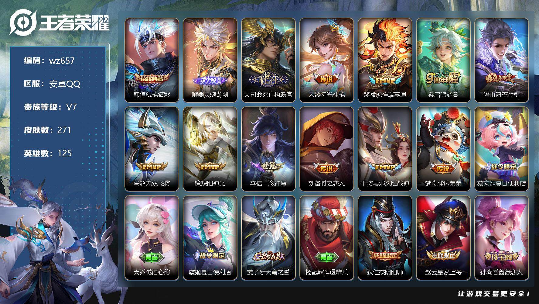 【云游堂】 【可二次实名】【wz657】【商品标题】:安卓Q-V7-最强王者段位-125英雄-271皮肤-1典藏-0珍品无双-1无双-0珍品传说-11传说-86史诗 【荣耀典藏】:韩信弑枪猎影 【无双皮肤】:曜器灵螭龙剑 【传说皮肤】:大司命死亡执政官,云缨幻光神枪,裴擒虎祥瑞亨通,桑启鸣野蒿,曜山海苍雷引,马超无双飞将,镜炽阳神光,李信一念神魔,刘备时之恋人,干将莫邪久胜战神,梦奇胖达荣荣 【限定皮肤】:蔡文姬夏日便利店,大乔绒语心约,虞姬夏日便利店,姜子牙天穹之誓,杨戬破阵退雄兵,狄仁杰阴阳师,赵云皇家上将,孙尚香蔷薇恋人,庄周高山流水,高渐离死亡摇滚,阿轲迷踪丽影,钟无艳超时空战士,芈月幻夜卜梦,吕布猎兽之王,周瑜赤莲之焰,元歌云间偶戏,元歌无心,甄姬游园惊梦,甄姬落雪兰心,典韦蓝屏警告,马可波罗山海玄木吟,狄仁杰魔术师,达摩沙漠行僧,项羽海滩派对,老夫子醍醐杖,老夫子航海奇遇记,程咬金演武夺筹,韩信飞衡,韩信傲雪梅枪,兰陵王金庭之子,孙悟空至尊宝,孙悟空孙行者,后羿如梦令,后羿圣弓游侠,李元芳云中旅人,钟馗驱傩正仪,杨戬潮玩骑兵,干将莫邪真爱魔法,雅典娜黎明之约,鬼谷子五谷丰年,黄忠火炮绅士,铠青龙志,苏烈千军破阵,百里玄策原初追逐者,梦奇顽趣,沈梦溪大漠名商,裴擒虎擒涛扼浪,狂铁御狮,云中君纤云弄巧,上官婉儿梁祝,嫦娥拒霜思,嫦娥暖冬兔眠,曜山海苍雷引,西施玲珑珍味,鲁班大师探海日志,桑启海盐诗旅,暃星界游侠,戈娅驭风魔法,艾琳流音漫舞,司空震地狱燃心,阿古朵江河有灵,张良古海寻踪,蒙犽百解令,蒙恬荣光圣徽,高渐离燃音魔法,妲己灵卜魔法,鬼谷子天穹祈灯,姬小满妄想食味,百里玄策超元猎域,沈梦溪龙舞盛年,鲁班七号蔬乡物语,李元芳蔬乡物语,刘邦剑破天穹,程咬金群星魔术团,镜青焰无极,项羽苍威无极,刘备异域游侠,周瑜熔金海岸 【年限皮肤】:铠青龙志,韩信飞衡,马可波罗山海玄木吟,曜山海苍雷引 【赛季限定】:达摩沙漠行僧,老夫子醍醐杖,程咬金演武夺筹,兰陵王金庭之子,张良古海寻踪,李元芳云中旅人,钟馗驱傩正仪,雅典娜黎明之约,苏烈千军破阵,百里玄策原初追逐者,梦奇顽趣,沈梦溪大漠名商,裴擒虎擒涛扼浪,狂铁御狮,鲁班大师探海日志,桑启海盐诗旅,鬼谷子天穹祈灯,蒙恬荣光圣徽,刘邦剑破天穹,姜子牙天穹之誓 【战令限定】:蔡文姬夏日便利店,虞姬夏日便利店,阿轲迷踪丽影,钟无艳超时空战士,芈月幻夜卜梦,吕布猎兽之王,周瑜赤莲之焰,元歌云间偶戏,甄姬落雪兰心,典韦蓝屏警告,老夫子航海奇遇记,艾琳流音漫舞,后羿圣弓游侠,杨戬潮玩骑兵,干将莫邪真爱魔法,黄忠火炮绅士,嫦娥暖冬兔眠,西施玲珑珍味,司空震地狱燃心,暃星界游侠,戈娅驭风魔法,高渐离燃音魔法,妲己灵卜魔法,鲁班七号蔬乡物语,李元芳蔬乡物语,镜青焰无极,项羽苍威无极 【史诗皮肤】:项羽苍穹之光,赵云皇家上将,貂蝉圣诞恋歌,甄姬冰雪圆舞曲,王昭君偶像歌手,狄仁杰魔术师,廉颇地狱岩魂,宫本武藏鬼剑武藏,孙尚香蔷薇恋人,孙尚香水果甜心,嬴政暗夜贵公子,嬴政摇滚巨星,妲己女仆咖啡,墨子金属风暴,曹操幽灵船长,吕布末日机甲,张飞乱世虎臣,孙悟空至尊宝,花木兰水晶猎龙者,夏侯惇乘风破浪,兰陵王暗隐猎兽者,诸葛亮黄金分割率,甄姬游园惊梦,雅典娜冰冠公主,安琪拉心灵骇客,百里守约特工魅影,铠曙光守护者,蔡文姬舞动绿茵,刘禅天才门将,李元芳逐浪之夏,程咬金功夫厨神,白起星夜王子,阿轲节奏热浪,孙策猫狗日记,铠青龙志,典韦蓝屏警告,狄仁杰鹰眼统帅,上官婉儿梁祝,娜可露露晚萤,韩信飞衡,后羿如梦令,阿轲迷踪丽影,橘右京修罗,百里玄策原初追逐者,云中君纤云弄巧,元歌云间偶戏,老夫子航海奇遇记,杨戬天秀启明,干将莫邪真爱魔法,钟馗乐园奇幻夜,孙悟空孙行者,庄周高山流水,嫦娥拒霜思,黄忠火炮绅士,雅典娜黎明之约,韩信傲雪梅枪,钟无艳超时空战士,鬼谷子五谷丰年,元歌无心,梦奇顽趣,暃星界游侠,马可波罗山海玄木吟,刘禅电玩爆裂旋风,戈娅驭风魔法,司空震地狱燃心,阿古朵江河有灵,蒙犽百解令,周瑜雪夜绮愿,妲己灵卜魔法,高渐离燃音魔法,蒙恬荣光圣徽,姬小满妄想食味,百里玄策超元猎域,鲁班七号蔬乡物语,镜青焰无极,蔡文姬夏日便利店,马可波罗星界特工,牛魔星界战将,孙膑茶境仙,赵怀真器灵浮梦炉,阿轲化蝶舞,狂铁龙之律动,后羿石田雨龙,周瑜百相守梦,西施织梦人,弈星守夜人,公孙离涂山容容 【其他皮肤】:项羽海滩派对,韩信教廷特使,韩信街头霸王,露娜哥特玫瑰,阿轲爱心护理,达摩大发明家,赵云白执事,赵云忍炎影,白起白色死神,牛魔西部大镖客,武则天东方不败,扁鹊化身博士,宫本武藏未来纪元,安琪拉玩偶对对碰,孙膑天使之翼,姜子牙时尚教父,妲己少女阿狸,典韦黄金武士,亚瑟死亡骑士,达摩拳王,花木兰兔女郎,甄姬花好人间,后羿阿尔法小队,狄仁杰阴阳师,刘备纽