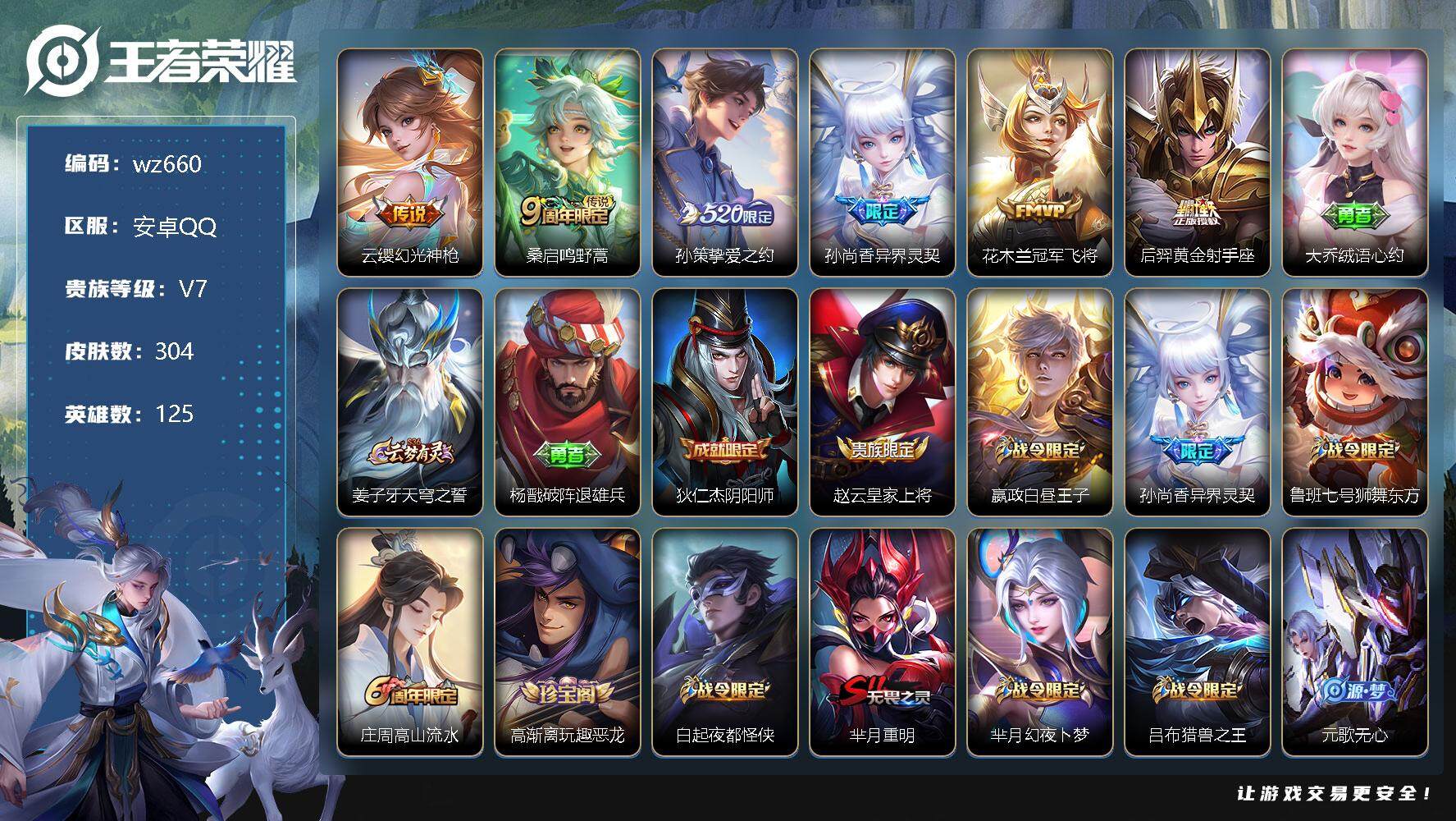 【云游堂】 【可二次实名】【wz660】【商品标题】:安卓Q-V7-永恒钻石III段位-125英雄-304皮肤-0典藏-0珍品无双-0无双-0珍品传说-6传说-86史诗 【传说皮肤】:云缨幻光神枪,桑启鸣野蒿,孙策挚爱之约,孙尚香异界灵契,花木兰冠军飞将,后羿黄金射手座 【限定皮肤】:大乔绒语心约,姜子牙天穹之誓,杨戬破阵退雄兵,狄仁杰阴阳师,赵云皇家上将,嬴政白昼王子,孙尚香异界灵契,鲁班七号狮舞东方,庄周高山流水,高渐离玩趣恶龙,白起夜都怪侠,芈月重明,芈月幻夜卜梦,吕布猎兽之王,元歌无心,夏侯惇匿光决锋者,甄姬游园惊梦,曹操烛龙,典韦穷奇,典韦蓝屏警告,马可波罗暗影游猎,狄仁杰魔术师,狄仁杰万华元夜,达摩沙漠行僧,项羽海滩派对,老夫子醍醐杖,程咬金演武夺筹,兰陵王金庭之子,孙悟空大圣娶亲,孙悟空孙行者,牛魔御旌,李元芳银河之约,李元芳云中旅人,钟馗神迹守卫,钟馗驱傩正仪,女娲朔望之晖,太乙真人饕餮,鬼谷子原初探秘者,鬼谷子五谷丰年,黄忠火炮绅士,铠青龙志,苏烈千军破阵,弈星混沌棋,梦奇顽趣,沈梦溪星空之诺,沈梦溪大漠名商,明世隐疑决卦,明世隐吟游魔法,裴擒虎李小龙,裴擒虎擒涛扼浪,狂铁御狮,米莱狄御霄,云中君纤云弄巧,盾山御銮,孙策挚爱之约,猪八戒西部大镖客,猪八戒猪悟能,上官婉儿梁祝,嫦娥拒霜思,鲁班大师探海日志,桑启海盐诗旅,艾琳女武神,阿古朵江河有灵,张良古海寻踪,蒙犽百解令,鬼谷子天穹祈灯,伽罗琥珀纪元,沈梦溪龙舞盛年,刘邦剑破天穹,程咬金群星魔术团,周瑜熔金海岸 【年限皮肤】:铠青龙志 【赛季限定】:芈月重明,曹操烛龙,典韦穷奇,狄仁杰万华元夜,达摩沙漠行僧,老夫子醍醐杖,程咬金演武夺筹,兰陵王金庭之子,张良古海寻踪,牛魔御旌,李元芳云中旅人,钟馗驱傩正仪,太乙真人饕餮,鬼谷子原初探秘者,苏烈千军破阵,弈星混沌棋,梦奇顽趣,沈梦溪大漠名商,明世隐疑决卦,裴擒虎擒涛扼浪,狂铁御狮,米莱狄御霄,盾山御銮,鲁班大师探海日志,桑启海盐诗旅,鬼谷子天穹祈灯,刘邦剑破天穹,姜子牙天穹之誓 【战令限定】:嬴政白昼王子,鲁班七号狮舞东方,白起夜都怪侠,芈月幻夜卜梦,吕布猎兽之王,典韦蓝屏警告,马可波罗暗影游猎,李元芳银河之约,钟馗神迹守卫,女娲朔望之晖,黄忠火炮绅士,沈梦溪星空之诺,明世隐吟游魔法,猪八戒西部大镖客 【史诗皮肤】:鲁班七号电玩小子,露娜紫霞仙子,赵云皇家上将,赵云未来纪元,貂蝉圣诞恋歌,甄姬冰雪圆舞曲,王昭君偶像歌手,狄仁杰魔术师,廉颇地狱岩魂,宫本武藏鬼剑武藏,孙尚香水果甜心,嬴政暗夜贵公子,嬴政摇滚巨星,妲己魅力维加斯,妲己女仆咖啡,墨子龙骑士,墨子金属风暴,吕布圣诞狂欢,刘禅绅士熊喵,曹操幽灵船长,李白千年之狐,吕布末日机甲,张飞乱世虎臣,花木兰水晶猎龙者,刘邦德古拉伯爵,夏侯惇乘风破浪,小乔缤纷独角兽,兰陵王暗隐猎兽者,诸葛亮黄金分割率,甄姬游园惊梦,亚瑟心灵战警,雅典娜冰冠公主,安琪拉心灵骇客,百里守约特工魅影,铠曙光守护者,蔡文姬舞动绿茵,刘禅天才门将,李元芳逐浪之夏,程咬金功夫厨神,白起星夜王子,阿轲节奏热浪,嬴政白昼王子,孙策猫狗日记,大乔猫狗日记,铠青龙志,孙悟空大圣娶亲,典韦蓝屏警告,伽罗箭羽风息,鲁班七号狮舞东方,狄仁杰鹰眼统帅,公孙离无限星赏官,上官婉儿梁祝,李元芳银河之约,橘右京修罗,瑶遇见神鹿,马可波罗暗影游猎,裴擒虎李小龙,云中君纤云弄巧,杨戬天秀启明,安琪拉时之奇旅,孙悟空孙行者,猪八戒猪悟能,庄周高山流水,嫦娥拒霜思,黄忠火炮绅士,夏洛特永昼,澜赏金猎手,明世隐吟游魔法,夏侯惇匿光决锋者,鬼谷子五谷丰年,元歌无心,梦奇顽趣,刘禅电玩爆裂旋风,阿古朵江河有灵,蒙犽百解令,周瑜雪夜绮愿,伽罗琥珀纪元,弈星万物之道,阿轲化蝶舞,刘禅鸭鸭历险记,狂铁龙之律动,扁鹊灵蛊蚀心,后羿石田雨龙,黄忠百相守梦,西施织梦人,公孙离涂山容容 【其他皮肤】:项羽海滩派对,韩信教廷特使,韩信街头霸王,露娜哥特玫瑰,阿轲爱心护理,达摩大发明家,赵云白执事,赵云忍炎影,芈月红桃皇后,艾琳女武神,程咬金星际陆战队,白起白色死神,牛魔西部大镖客,武则天东方不败,扁鹊化身博士,扁鹊救世之瞳,宫本武藏未来纪元,孙膑天使之翼,姜子牙时尚教父,妲己少女阿狸,典韦黄金武士,亚瑟死亡骑士,达摩拳王,花木兰兔女郎,张飞五福同心,甄姬花好人间,刘备万事如意,宫本武藏万象初新,后羿阿尔法小队,狄仁杰阴阳师,刘备纽约教父,刘备汉昭烈帝,李元芳黑猫爱糖果,关羽龙腾万里,墨子进击墨子号,钟无艳海滩丽影,太乙真人饕餮,曹操烛龙,王昭君幻想奇妙夜,芈月重明,老夫子功夫老勺,牛魔制霸全明星,孙尚香沉稳之力,典韦穷奇,李白敏锐之力,鬼谷子幻乐之宴,狂铁御狮,苏烈坚韧之力,大乔守护之力,项羽科学大爆炸,米莱狄御霄,吕布猎兽之王,明世隐虹云星官,张良幽兰居士,庄周奇妙