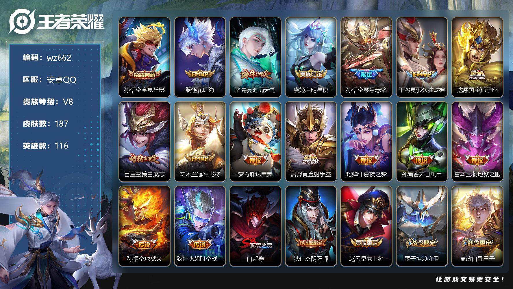 【云游堂】 【可二次实名】【wz662】【商品标题】:安卓Q-V8-永恒钻石II段位-116英雄-187皮肤-1典藏-0珍品无双-0无双-0珍品传说-15传说-47史诗 【荣耀典藏】:孙悟空全息碎影 【传说皮肤】:澜逐花归海,诸葛亮时雨天司,虞姬启明星使,孙悟空零号赤焰,干将莫邪久胜战神,达摩黄金狮子座,百里玄策白虎志,花木兰冠军飞将,梦奇胖达荣荣,后羿黄金射手座,貂蝉仲夏夜之梦,孙尚香末日机甲,宫本武藏地狱之眼,孙悟空地狱火,狄仁杰超时空战士 【限定皮肤】:白起狰,狄仁杰阴阳师,赵云皇家上将,墨子神迹守卫,嬴政白昼王子,庄周云端筑梦师,高渐离玩趣恶龙,芈月重明,吕布猎兽之王,元歌云间偶戏,元歌无心,夏侯惇朔风刀,曹操烛龙,典韦穷奇,典韦蓝屏警告,马可波罗暗影游猎,狄仁杰魔术师,狄仁杰万华元夜,达摩星际陆战队,项羽海滩派对,老夫子醍醐杖,老夫子航海奇遇记,程咬金演武夺筹,露娜一生所爱,花木兰青春决赛季,花木兰瑞麟志,亚瑟潮玩骑士王,孙悟空大圣娶亲,孙悟空零号赤焰,牛魔御旌,虞姬启明星使,钟馗驱傩正仪,女娲朔望之晖,干将莫邪冰霜恋舞曲,雅典娜单词大作战,蔡文姬繁星吟游,太乙真人饕餮,鬼谷子原初探秘者,诸葛亮时雨天司,铠青龙志,苏烈玄武志,苏烈千军破阵,百里玄策白虎志,百里守约朱雀志,弈星混沌棋,沈梦溪大漠名商,明世隐疑决卦,裴擒虎李小龙,狂铁御狮,米莱狄御霄,米莱狄胡桃异想国,云中君纤云弄巧,猪八戒西部大镖客,上官婉儿梁祝,嫦娥拒霜思,蒙犽狂想玩偶喵 【年限皮肤】:百里玄策白虎志,百里守约朱雀志,花木兰瑞麟志,铠青龙志,苏烈玄武志,诸葛亮时雨天司 【赛季限定】:白起狰,芈月重明,夏侯惇朔风刀,曹操烛龙,典韦穷奇,狄仁杰万华元夜,老夫子醍醐杖,程咬金演武夺筹,牛魔御旌,钟馗驱傩正仪,太乙真人饕餮,鬼谷子原初探秘者,苏烈千军破阵,弈星混沌棋,沈梦溪大漠名商,明世隐疑决卦,狂铁御狮,米莱狄御霄 【战令限定】:墨子神迹守卫,嬴政白昼王子,吕布猎兽之王,元歌云间偶戏,典韦蓝屏警告,马可波罗暗影游猎,达摩星际陆战队,老夫子航海奇遇记,亚瑟潮玩骑士王,女娲朔望之晖,雅典娜单词大作战,米莱狄胡桃异想国,猪八戒西部大镖客,蒙犽狂想玩偶喵 【史诗皮肤】:鲁班七号电玩小子,赵云皇家上将,赵云未来纪元,貂蝉圣诞恋歌,王昭君偶像歌手,狄仁杰魔术师,妲己魅力维加斯,墨子龙骑士,吕布圣诞狂欢,曹操幽灵船长,李白千年之狐,韩信白龙吟,夏侯惇乘风破浪,小乔缤纷独角兽,诸葛亮黄金分割率,雅典娜冰冠公主,庄周云端筑梦师,花木兰青春决赛季,百里守约特工魅影,铠曙光守护者,李元芳逐浪之夏,程咬金功夫厨神,白起星夜王子,嬴政白昼王子,孙策猫狗日记,铠青龙志,百里守约朱雀志,干将莫邪冰霜恋舞曲,露娜一生所爱,孙悟空大圣娶亲,苏烈玄武志,花木兰瑞麟志,典韦蓝屏警告,伽罗箭羽风息,狄仁杰鹰眼统帅,上官婉儿梁祝,蔡文姬繁星吟游,橘右京修罗,马可波罗暗影游猎,蒙犽狂想玩偶喵,裴擒虎李小龙,云中君纤云弄巧,元歌云间偶戏,米莱狄胡桃异想国,老夫子航海奇遇记,嫦娥拒霜思,元歌无心 【其他皮肤】:项羽海滩派对,韩信教廷特使,韩信街头霸王,阿轲致命风华,阿轲爱心护理,达摩大发明家,赵云白执事,赵云忍炎影,扁鹊化身博士,安琪拉玩偶对对碰,孙膑天使之翼,妲己少女阿狸,典韦黄金武士,亚瑟死亡骑士,花木兰兔女郎,张飞五福同心,甄姬花好人间,宫本武藏万象初新,狄仁杰阴阳师,刘备纽约教父,关羽龙腾万里,白起狰,钟无艳海滩丽影,太乙真人饕餮,宫本武藏霸王丸,曹操烛龙,王昭君幻想奇妙夜,芈月重明,老夫子功夫老勺,牛魔制霸全明星,孙尚香沉稳之力,典韦穷奇,诸葛亮掌控之力,鬼谷子幻乐之宴,狂铁御狮,苏烈坚韧之力,大乔守护之力,项羽科学大爆炸,米莱狄御霄,吕布猎兽之王,明世隐虹云星官,庄周奇妙博物学,牛魔御旌,女娲朔望之晖,小乔丁香结,高渐离玩趣恶龙,沈梦溪鲨炮海盗猫,姜子牙炽热元素使,夏侯惇朔风刀,弈星混沌棋,哪吒次元突破,明世隐疑决卦,盾山圆桌骑士,老夫子醍醐杖,猪八戒西部大镖客,廉颇无尽征程,鬼谷子原初探秘者,雅典娜单词大作战,狄仁杰万华元夜,亚瑟潮玩骑士王,杨戬次元傲视,达摩星际陆战队,程咬金演武夺筹,张良缤纷绘卷,钟馗驱傩正仪,墨子神迹守卫,鲁班大师乓乓大师,苏烈千军破阵,沈梦溪大漠名商,蒙恬蔚蓝守将,影魅影绮裳,甄姬逆浪荇歌,哪吒罗小黑战记,雅典娜神奇女侠,鲁班七号福禄兄弟,鲁班七号木偶奇遇记,露娜绯红之刃,钟无艳生化警戒,貂蝉异域舞娘,花木兰剑舞者,狄仁杰锦衣卫,曹操死神来了,孙悟空西部大镖客,周瑜海军大将,后羿精灵王,兰陵王隐刃,李白范海辛,钟馗地府判官,李元芳特种部队,刘邦圣殿之光,关羽天启骑士,马可波罗激情绿茵,苍维京掠夺者,杨戬埃及法老,大乔伊势巫女,干将莫邪第七人偶,鬼谷子阿摩司公爵,铠龙域领主,百里守约绝影神