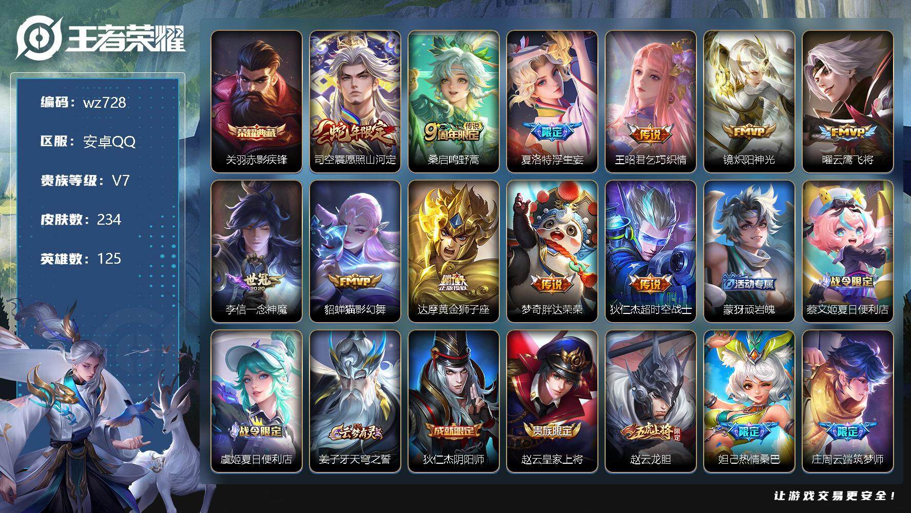 【云游堂】 【可二次实名】【wz728】【商品标题】:安卓Q-V7-最强王者段位-125英雄-234皮肤-1典藏-0珍品无双-0无双-0珍品传说-11传说-75史诗 【荣耀典藏】:关羽赤影疾锋 【传说皮肤】:司空震愿照山河定,桑启鸣野蒿,夏洛特浮生妄,王昭君乞巧织情,镜炽阳神光,曜云鹰飞将,李信一念神魔,貂蝉猫影幻舞,达摩黄金狮子座,梦奇胖达荣荣,狄仁杰超时空战士 【限定皮肤】:蒙犽顽岩魄,蔡文姬夏日便利店,虞姬夏日便利店,姜子牙天穹之誓,狄仁杰阴阳师,赵云皇家上将,赵云龙胆,妲己热情桑巴,庄周云端筑梦师,高渐离死亡摇滚,高渐离玩趣恶龙,周瑜赤莲之焰,元歌云间偶戏,狄仁杰魔术师,狄仁杰万华元夜,达摩沙漠行僧,项羽海滩派对,老夫子醍醐杖,程咬金演武夺筹,王昭君午后时光,兰陵王金庭之子,亚瑟潮玩骑士王,孙悟空大圣娶亲,牛魔御旌,李元芳云中旅人,钟馗驱傩正仪,杨玉环寅虎心曲,干将莫邪冰霜恋舞曲,雅典娜黎明之约,蔡文姬繁星吟游,鬼谷子原初探秘者,鬼谷子五谷丰年,黄忠烈魂,梦奇顽趣,沈梦溪大漠名商,明世隐疑决卦,裴擒虎李小龙,裴擒虎擒涛扼浪,狂铁电玩高手,米莱狄御霄,云中君纤云弄巧,盾山御銮,嫦娥暖冬兔眠,鲁班大师探海日志,桑启海盐诗旅,夏洛特浮生妄,暃星界游侠,阿古朵江河有灵,张良古海寻踪,蒙恬荣光圣徽,鬼谷子天穹祈灯,姬小满妄想食味,大乔乘龙忆丹青,沈梦溪龙舞盛年,刘邦剑破天穹,程咬金群星魔术团,周瑜熔金海岸 【年限皮肤】:杨玉环寅虎心曲,马超神威,黄忠烈魂,赵云龙胆,大乔乘龙忆丹青 【赛季限定】:狄仁杰万华元夜,达摩沙漠行僧,老夫子醍醐杖,程咬金演武夺筹,兰陵王金庭之子,张良古海寻踪,牛魔御旌,李元芳云中旅人,钟馗驱傩正仪,雅典娜黎明之约,鬼谷子原初探秘者,梦奇顽趣,沈梦溪大漠名商,明世隐疑决卦,裴擒虎擒涛扼浪,米莱狄御霄,盾山御銮,鲁班大师探海日志,桑启海盐诗旅,鬼谷子天穹祈灯,蒙恬荣光圣徽,刘邦剑破天穹,姜子牙天穹之誓 【战令限定】:蔡文姬夏日便利店,虞姬夏日便利店,周瑜赤莲之焰,元歌云间偶戏,王昭君午后时光,亚瑟潮玩骑士王,狂铁电玩高手,嫦娥暖冬兔眠,暃星界游侠 【史诗皮肤】:鲁班七号电玩小子,赵云皇家上将,赵云未来纪元,貂蝉圣诞恋歌,甄姬冰雪圆舞曲,狄仁杰魔术师,廉颇地狱岩魂,宫本武藏鬼剑武藏,孙尚香水果甜心,嬴政摇滚巨星,妲己魅力维加斯,妲己女仆咖啡,墨子金属风暴,吕布圣诞狂欢,刘禅绅士熊喵,曹操幽灵船长,李白千年之狐,吕布末日机甲,妲己热情桑巴,张飞乱世虎臣,花木兰水晶猎龙者,刘邦德古拉伯爵,夏侯惇乘风破浪,小乔缤纷独角兽,兰陵王暗隐猎兽者,诸葛亮黄金分割率,亚瑟心灵战警,雅典娜冰冠公主,安琪拉心灵骇客,庄周云端筑梦师,百里守约特工魅影,铠曙光守护者,蔡文姬舞动绿茵,刘禅天才门将,李元芳逐浪之夏,程咬金功夫厨神,白起星夜王子,阿轲节奏热浪,孙策猫狗日记,干将莫邪冰霜恋舞曲,孙悟空大圣娶亲,伽罗箭羽风息,狄仁杰鹰眼统帅,蔡文姬繁星吟游,橘右京修罗,马超神威,赵云龙胆,黄忠烈魂,裴擒虎李小龙,云中君纤云弄巧,元歌云间偶戏,沈梦溪月团寄思,雅典娜黎明之约,杨玉环寅虎心曲,貂蝉唤灵魅影,狂铁电玩高手,弈星滕王阁序,鬼谷子五谷丰年,梦奇顽趣,暃星界游侠,刘禅电玩爆裂旋风,阿古朵江河有灵,蒙恬荣光圣徽,姬小满妄想食味,大乔乘龙忆丹青,蔡文姬夏日便利店,蒙犽顽岩魄,亚连破空之剑,牛魔星界战将,赵怀真器灵浮梦炉,阿轲化蝶舞,狂铁龙之律动,周瑜百相守梦,黄忠百相守梦,西施织梦人 【其他皮肤】:项羽海滩派对,韩信教廷特使,韩信街头霸王,阿轲爱心护理,达摩大发明家,赵云白执事,赵云忍炎影,白起白色死神,牛魔西部大镖客,扁鹊化身博士,宫本武藏未来纪元,姜子牙时尚教父,妲己少女阿狸,典韦黄金武士,亚瑟死亡骑士,达摩拳王,花木兰兔女郎,张飞五福同心,甄姬花好人间,刘备万事如意,宫本武藏万象初新,狄仁杰阴阳师,刘备纽约教父,高渐离死亡摇滚,刘备汉昭烈帝,关羽龙腾万里,钟无艳海滩丽影,王昭君幻想奇妙夜,狂铁命运角斗场,老夫子功夫老勺,孙尚香沉稳之力,诸葛亮掌控之力,李白敏锐之力,鬼谷子幻乐之宴,苏烈坚韧之力,大乔守护之力,项羽科学大爆炸,米莱狄御霄,明世隐虹云星官,牛魔御旌,吕布野性能量,盾山御銮,高渐离玩趣恶龙,沈梦溪鲨炮海盗猫,姜子牙炽热元素使,周瑜赤莲之焰,哪吒次元突破,鲁班七号黑桃队长,明世隐疑决卦,老夫子醍醐杖,廉颇无尽征程,鬼谷子原初探秘者,狄仁杰万华元夜,亚瑟潮玩骑士王,刘禅秘密基地,程咬金演武夺筹,张良缤纷绘卷,钟馗驱傩正仪,鲁班大师乓乓大师,达摩沙漠行僧,程咬金无双福将,兰陵王金庭之子,刘禅唤灵魔甲,王昭君午后时光,沈梦溪大漠名商,李元芳云中旅人,桑启海盐诗旅,嫦娥暖冬兔眠,海月幻泉雾影,猪八戒潮玩探月行,裴擒虎擒涛扼浪,太乙真人劲辣红锅,鲁班大师探海日