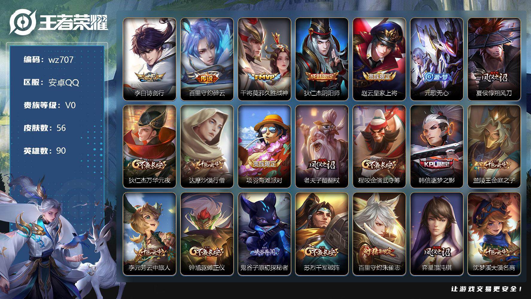 【云游堂】 【可二次实名】【wz707】【商品标题】:安卓Q-V0-永恒钻石III段位-90英雄-56皮肤-0典藏-0珍品无双-0无双-0珍品传说-3传说-13史诗 【传说皮肤】:李白诗剑行,百里守约碎云,干将莫邪久胜战神 【限定皮肤】:狄仁杰阴阳师,赵云皇家上将,元歌无心,夏侯惇朔风刀,狄仁杰万华元夜,达摩沙漠行僧,项羽海滩派对,老夫子醍醐杖,程咬金演武夺筹,韩信逐梦之影,兰陵王金庭之子,李元芳云中旅人,钟馗驱傩正仪,鬼谷子原初探秘者,苏烈千军破阵,百里守约朱雀志,弈星混沌棋,沈梦溪大漠名商,明世隐疑决卦,裴擒虎李小龙,盾山御銮,上官婉儿梁祝,鲁班大师探海日志,桑启海盐诗旅,张良古海寻踪,鬼谷子天穹祈灯,刘邦剑破天穹 【年限皮肤】:百里守约朱雀志 【赛季限定】:夏侯惇朔风刀,狄仁杰万华元夜,达摩沙漠行僧,老夫子醍醐杖,程咬金演武夺筹,兰陵王金庭之子,张良古海寻踪,李元芳云中旅人,钟馗驱傩正仪,鬼谷子原初探秘者,苏烈千军破阵,弈星混沌棋,沈梦溪大漠名商,明世隐疑决卦,盾山御銮,鲁班大师探海日志,桑启海盐诗旅,鬼谷子天穹祈灯,刘邦剑破天穹 【史诗皮肤】:阿轲暗夜猫娘,赵云皇家上将,宫本武藏鬼剑武藏,孙尚香水果甜心,墨子金属风暴,吕布末日机甲,韩信逐梦之影,亚瑟心灵战警,百里守约朱雀志,狄仁杰鹰眼统帅,上官婉儿梁祝,裴擒虎李小龙,元歌无心 【其他皮肤】:项羽海滩派对,露娜哥特玫瑰,达摩大发明家,白起白色死神,扁鹊化身博士,妲己少女阿狸,花木兰兔女郎,狄仁杰阴阳师,关羽龙腾万里,孙尚香沉稳之力,盾山御銮,夏侯惇朔风刀,弈星混沌棋,明世隐疑决卦,老夫子醍醐杖,鬼谷子原初探秘者,狄仁杰万华元夜,程咬金演武夺筹,张良缤纷绘卷,钟馗驱傩正仪,苏烈千军破阵,达摩沙漠行僧,兰陵王金庭之子,沈梦溪大漠名商,李元芳云中旅人,桑启海盐诗旅,鲁班大师探海日志,张良古海寻踪,鬼谷子天穹祈灯,刘邦剑破天穹,老夫子潮流仙人,雅典娜战争女神,干将莫邪第七人偶,女娲尼罗河女神,裴擒虎街头旋风,孙策海之征途,伽罗花见巫女,李信灼热之刃,曜归虚梦演,西施归虚梦演 【营地ID】:1893742935