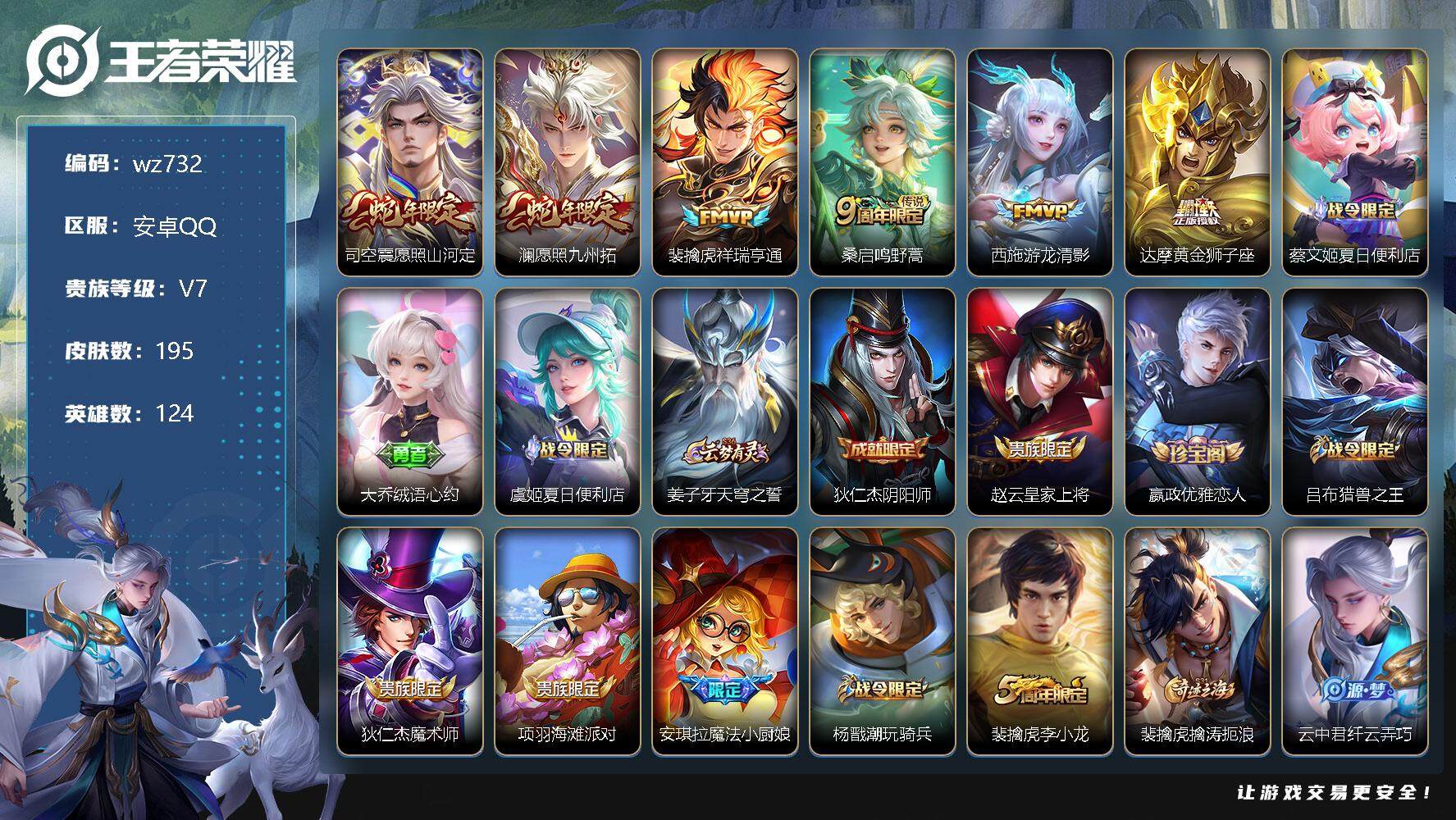 【云游堂】 【可二次实名】【wz732】【商品标题】:安卓Q-V7-最强王者段位-124英雄-195皮肤-0典藏-0珍品无双-0无双-0珍品传说-6传说-48史诗 【传说皮肤】:司空震愿照山河定,澜愿照九州拓,裴擒虎祥瑞亨通,桑启鸣野蒿,西施游龙清影,达摩黄金狮子座 【限定皮肤】:蔡文姬夏日便利店,大乔绒语心约,虞姬夏日便利店,姜子牙天穹之誓,狄仁杰阴阳师,赵云皇家上将,嬴政优雅恋人,吕布猎兽之王,狄仁杰魔术师,项羽海滩派对,安琪拉魔法小厨娘,杨戬潮玩骑兵,裴擒虎李小龙,裴擒虎擒涛扼浪,云中君纤云弄巧,嫦娥拒霜思,鲁班大师探海日志,艾琳流音漫舞,司空震地狱燃心,阿古朵江河有灵,张良古海寻踪,蒙犽百解令,高渐离燃音魔法,妲己灵卜魔法,鬼谷子天穹祈灯,伽罗琥珀纪元,沈梦溪龙舞盛年,李元芳蔬乡物语,刘邦剑破天穹,程咬金群星魔术团,关羽决胜骁骑,项羽苍威无极,刘备异域游侠,周瑜熔金海岸 【赛季限定】:张良古海寻踪,裴擒虎擒涛扼浪,鲁班大师探海日志,鬼谷子天穹祈灯,刘邦剑破天穹,姜子牙天穹之誓 【战令限定】:蔡文姬夏日便利店,虞姬夏日便利店,吕布猎兽之王,艾琳流音漫舞,杨戬潮玩骑兵,司空震地狱燃心,高渐离燃音魔法,妲己灵卜魔法,李元芳蔬乡物语,项羽苍威无极 【史诗皮肤】:露娜紫霞仙子,赵云皇家上将,赵云未来纪元,甄姬冰雪圆舞曲,狄仁杰魔术师,宫本武藏鬼剑武藏,孙尚香水果甜心,嬴政优雅恋人,嬴政暗夜贵公子,妲己魅力维加斯,妲己女仆咖啡,墨子金属风暴,李白千年之狐,吕布末日机甲,安琪拉魔法小厨娘,夏侯惇乘风破浪,小乔缤纷独角兽,兰陵王暗隐猎兽者,亚瑟心灵战警,雅典娜冰冠公主,百里守约特工魅影,铠曙光守护者,白起星夜王子,孙策猫狗日记,狄仁杰鹰眼统帅,娜可露露晚萤,小乔青蛇,孙尚香时之恋人,裴擒虎李小龙,云中君纤云弄巧,杨戬天秀启明,钟馗乐园奇幻夜,嫦娥拒霜思,刘禅电玩爆裂旋风,司空震地狱燃心,阿古朵江河有灵,蒙犽百解令,妲己灵卜魔法,高渐离燃音魔法,伽罗琥珀纪元,关羽决胜骁骑,蔡文姬夏日便利店,亚连破空之剑,百里守约百相守梦,孙膑茶境仙,阿轲化蝶舞,刘禅鸭鸭历险记,狂铁龙之律动,周瑜百相守梦,黄忠百相守梦 【其他皮肤】:项羽海滩派对,韩信街头霸王,露娜哥特玫瑰,阿轲爱心护理,赵云白执事,赵云忍炎影,芈月红桃皇后,白起白色死神,牛魔西部大镖客,宫本武藏未来纪元,安琪拉玩偶对对碰,孙膑天使之翼,姜子牙时尚教父,妲己少女阿狸,典韦黄金武士,亚瑟死亡骑士,花木兰兔女郎,甄姬花好人间,刘备万事如意,狄仁杰阴阳师,刘备纽约教父,刘备汉昭烈帝,关羽龙腾万里,钟无艳海滩丽影,王昭君幻想奇妙夜,狂铁命运角斗场,老夫子功夫老勺,孙尚香沉稳之力,鬼谷子幻乐之宴,吕布猎兽之王,明世隐虹云星官,吕布野性能量,沈梦溪鲨炮海盗猫,哪吒次元突破,鲁班七号黑桃队长,狂铁特工战影,露娜瓷语鉴心,鲁班大师乓乓大师,典韦铁甲之心,刘邦虎啸剑宗,蒙犽胡桃狂想曲,蒙恬蔚蓝守将,猪八戒潮玩探月行,裴擒虎擒涛扼浪,杨戬潮玩骑兵,太乙真人劲辣红锅,莱西奥西部游侠,鲁班大师探海日志,姬小满零食大作战,李元芳妄想特派,艾琳流音漫舞,张良古海寻踪,钟无艳聚星闪耀,亚连破局者,兰陵王幻夜行动,后羿完美运算,程咬金暖冬絮语,鬼谷子天穹祈灯,妲己灵卜魔法,海诺时空谍影,嫦娥漠中幻影,朵莉亚金色潮汐,廉颇功夫炙烤,亚瑟鸿运当头,沈梦溪龙舞盛年,钟无艳春野之旅,李元芳蔬乡物语,扁鹊无尽旅途,刘邦剑破天穹,盘古经纬探寻者,程咬金群星魔术团,项羽苍威无极,大司命暗都幽影,刘备异域游侠,姜子牙天穹之誓,周瑜熔金海岸,虞姬夏日便利店,大乔绒语心约,孙悟空神迹守卫,盘古敬我三分,东皇太一噬灭天穹,亚瑟动物派对,老夫子百相守梦,吕布逐霄战戟,苍苍林狼骑,太乙真人谧流熔炉,典韦铁骨偃魂,马超访茗客,西施雪境奇遇,东皇太一金福满堂,达摩爆裂喵拳,少司缘灵卦秘语,明世隐景韶洛都,戈娅玫蓝誓约,钟馗虚灵犬护,沈梦溪鸭鸭历险记,苏烈春野闲踪,小乔秘证寻踪,张良灵野札记,阿古朵布丁狗之约,露娜命运加冕,白起死霸装,甄姬逆浪荇歌,孙策百相守梦,庄周锦麟游梦,空空儿戏梦巡演,莱西奥踏浪烽翎,鬼谷子克喵,桑启青衿临川,鲁班七号福禄兄弟,高渐离金属狂潮,钟无艳生化警戒,貂蝉异域舞娘,花木兰剑舞者,小乔万圣前夜,孙悟空西部大镖客,后羿精灵王,刘邦圣殿之光,关羽天启骑士,夏侯惇战争骑士,马可波罗激情绿茵,太乙真人圆桌骑士,诸葛亮星航指挥官,大乔伊势巫女,干将莫邪第七人偶,铠龙域领主,百里守约绝影神枪,百里玄策威尼斯狂欢,女娲尼罗河女神,明世隐占星师,公孙离花间舞,裴擒虎街头旋风,元歌午夜歌剧院,司马懿魇语军师,沈梦溪棒球奇才,盘古创世神祝,马超幸存者,蒙恬秩序猎龙将,澜孤猎,司空震启蛰 【内测皮肤】:嬴政优雅恋人,狂铁特工战影 【营地ID】:1770373868