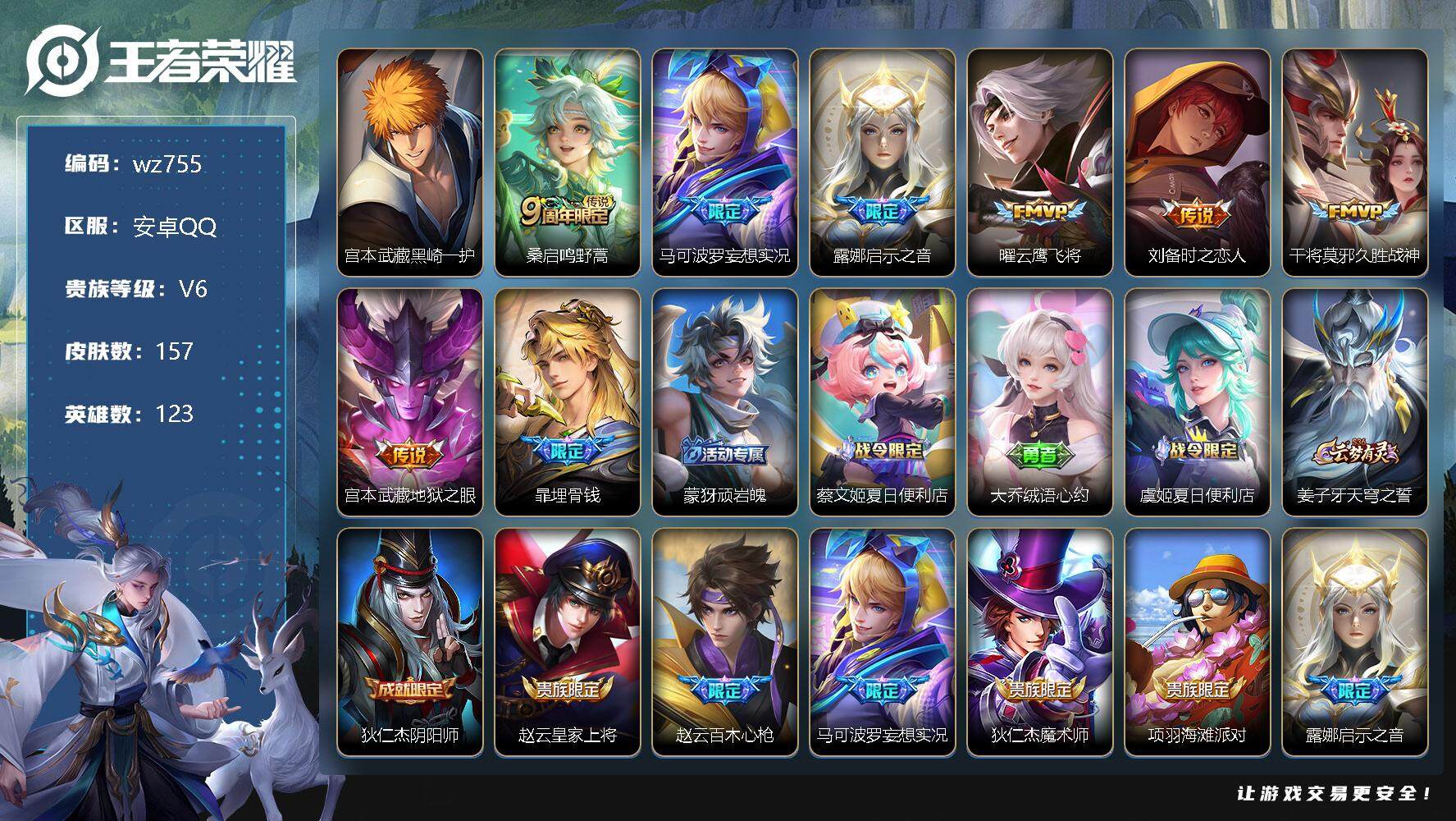 【云游堂】 【可二次实名】【wz755】【商品标题】:安卓Q-V6-至尊星耀I段位-123英雄-157皮肤-0典藏-0珍品无双-0无双-1珍品传说-7传说-40史诗 【珍品传说】:宫本武藏黑崎一护 【传说皮肤】:桑启鸣野蒿,马可波罗妄想实况,露娜启示之音,曜云鹰飞将,刘备时之恋人,干将莫邪久胜战神,宫本武藏地狱之眼 【限定皮肤】:暃埋骨钱,蒙犽顽岩魄,蔡文姬夏日便利店,大乔绒语心约,虞姬夏日便利店,姜子牙天穹之誓,狄仁杰阴阳师,赵云皇家上将,赵云百木心枪,马可波罗妄想实况,狄仁杰魔术师,项羽海滩派对,露娜启示之音,百里玄策原初追逐者,裴擒虎李小龙,鲁班大师探海日志,阿古朵江河有灵,张良古海寻踪,高渐离燃音魔法,妲己灵卜魔法,鬼谷子天穹祈灯,伽罗琥珀纪元,姬小满妄想食味,刘邦剑破天穹,程咬金群星魔术团,镜青焰无极,项羽苍威无极,刘备异域游侠,周瑜熔金海岸 【赛季限定】:张良古海寻踪,百里玄策原初追逐者,鲁班大师探海日志,鬼谷子天穹祈灯,刘邦剑破天穹,姜子牙天穹之誓 【战令限定】:蔡文姬夏日便利店,虞姬夏日便利店,高渐离燃音魔法,妲己灵卜魔法,镜青焰无极,项羽苍威无极 【史诗皮肤】:露娜紫霞仙子,赵云皇家上将,赵云未来纪元,甄姬冰雪圆舞曲,狄仁杰魔术师,廉颇地狱岩魂,宫本武藏鬼剑武藏,孙尚香水果甜心,妲己魅力维加斯,妲己女仆咖啡,吕布末日机甲,张飞乱世虎臣,小乔缤纷独角兽,兰陵王暗隐猎兽者,安琪拉心灵骇客,百里守约特工魅影,刘禅天才门将,李元芳逐浪之夏,阿轲节奏热浪,狄仁杰鹰眼统帅,大乔白蛇,百里玄策原初追逐者,裴擒虎李小龙,赵云百木心枪,镜玫瑰异探,阿古朵江河有灵,妲己灵卜魔法,高渐离燃音魔法,伽罗琥珀纪元,姬小满妄想食味,镜青焰无极,黄忠怒海争锋,蔡文姬夏日便利店,蒙犽顽岩魄,暃埋骨钱,亚连破空之剑,百里守约百相守梦,阿轲化蝶舞,后羿石田雨龙,黄忠百相守梦,弈星守夜人 【其他皮肤】:项羽海滩派对,韩信教廷特使,韩信街头霸王,露娜哥特玫瑰,芈月红桃皇后,白起白色死神,牛魔西部大镖客,扁鹊救世之瞳,宫本武藏未来纪元,安琪拉玩偶对对碰,孙膑天使之翼,姜子牙时尚教父,典韦黄金武士,亚瑟死亡骑士,达摩拳王,花木兰兔女郎,宫本武藏万象初新,狄仁杰阴阳师,王昭君幻想奇妙夜,狂铁命运角斗场,老夫子功夫老勺,李白敏锐之力,苏烈坚韧之力,大乔守护之力,明世隐虹云星官,小乔丁香结,吕布野性能量,沈梦溪鲨炮海盗猫,姜子牙炽热元素使,鲁班七号黑桃队长,刘禅秘密基地,杨戬次元傲视,露娜瓷语鉴心,鲁班大师乓乓大师,刘禅唤灵魔甲,米莱狄契约魔法,刘备潮玩造梦师,海月幻泉雾影,猪八戒潮玩探月行,鲁班大师探海日志,李元芳妄想特派,哪吒热血海滩,张良古海寻踪,钟无艳聚星闪耀,后羿完美运算,鬼谷子天穹祈灯,妲己灵卜魔法,海诺时空谍影,嫦娥漠中幻影,朵莉亚金色潮汐,廉颇功夫炙烤,亚瑟鸿运当头,刘邦剑破天穹,程咬金群星魔术团,项羽苍威无极,大司命暗都幽影,刘备异域游侠,貂蝉长夏之忆,姜子牙天穹之誓,周瑜熔金海岸,虞姬夏日便利店,大乔绒语心约,孙悟空神迹守卫,盘古敬我三分,东皇太一噬灭天穹,老夫子百相守梦,米莱狄怪诞之夜,干将莫邪雾都夜雨,吕布逐霄战戟,苍苍林狼骑,典韦铁骨偃魂,姜子牙星梦巡礼,戈娅玫蓝誓约,钟馗虚灵犬护,露娜命运加冕,姬小满小满鸭,白起死霸装,甄姬逆浪荇歌,庄周锦麟游梦,莱西奥踏浪烽翎,鬼谷子克喵,鲁班七号福禄兄弟,高渐离金属狂潮,狄仁杰锦衣卫,曹操超能战警,孙悟空西部大镖客,后羿精灵王,刘禅英喵野望,李白范海辛,李元芳特种部队,关羽天启骑士,夏侯惇战争骑士,马可波罗激情绿茵,诸葛亮星航指挥官,干将莫邪第七人偶,鬼谷子阿摩司公爵,百里玄策威尼斯狂欢,梦奇美梦成真,女娲尼罗河女神,公孙离花间舞,元歌午夜歌剧院,李信灼热之刃,猪八戒年年有余,瑶森,西施归虚梦演,镜冰刃幻境,阿古朵熊喵少女,澜孤猎,云缨赤焰之缨 【营地ID】:1671475302