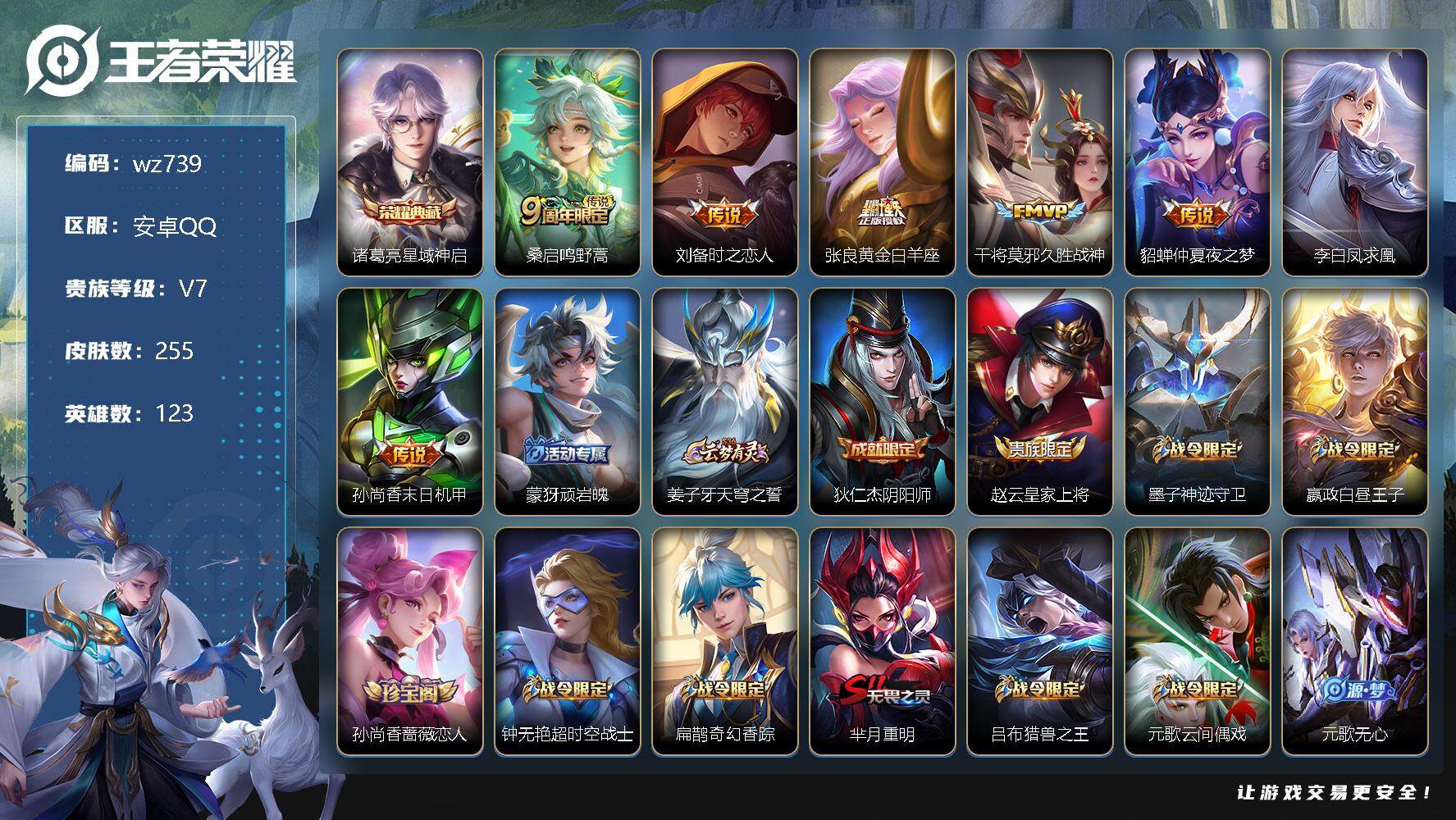 【云游堂】 【可二次实名】【wz739】【商品标题】:安卓Q-V7-最强王者段位-123英雄-255皮肤-1典藏-0珍品无双-0无双-0珍品传说-7传说-63史诗 【荣耀典藏】:诸葛亮星域神启 【传说皮肤】:桑启鸣野蒿,刘备时之恋人,张良黄金白羊座,干将莫邪久胜战神,貂蝉仲夏夜之梦,李白凤求凰,孙尚香末日机甲 【限定皮肤】:蒙犽顽岩魄,姜子牙天穹之誓,狄仁杰阴阳师,赵云皇家上将,墨子神迹守卫,嬴政白昼王子,孙尚香蔷薇恋人,钟无艳超时空战士,扁鹊奇幻香踪,芈月重明,吕布猎兽之王,元歌云间偶戏,元歌无心,夏侯惇朔风刀,甄姬落雪兰心,曹操烛龙,典韦穷奇,典韦蓝屏警告,马可波罗暗影游猎,狄仁杰魔术师,狄仁杰万华元夜,达摩星际陆战队,达摩沙漠行僧,项羽海滩派对,老夫子醍醐杖,老夫子航海奇遇记,程咬金演武夺筹,王昭君午后时光,兰陵王金庭之子,亚瑟潮玩骑士王,牛魔御旌,李元芳银河之约,李元芳云中旅人,钟馗驱傩正仪,杨戬潮玩骑兵,女娲朔望之晖,雅典娜单词大作战,雅典娜黎明之约,蔡文姬繁星吟游,鬼谷子原初探秘者,鬼谷子五谷丰年,百里玄策原初追逐者,弈星混沌棋,梦奇顽趣,沈梦溪星空之诺,沈梦溪大漠名商,明世隐疑决卦,裴擒虎天狼狩猎者,裴擒虎李小龙,裴擒虎擒涛扼浪,狂铁御狮,狂铁电玩高手,米莱狄御霄,米莱狄胡桃异想国,云中君纤云弄巧,盾山御銮,猪八戒西部大镖客,上官婉儿梁祝,蒙犽狂想玩偶喵,鲁班大师探海日志,桑启海盐诗旅,艾琳女武神,张良古海寻踪,蒙恬荣光圣徽,鬼谷子天穹祈灯,沈梦溪龙舞盛年 【年限皮肤】:李白凤求凰 【赛季限定】:芈月重明,夏侯惇朔风刀,曹操烛龙,典韦穷奇,狄仁杰万华元夜,达摩沙漠行僧,老夫子醍醐杖,程咬金演武夺筹,兰陵王金庭之子,张良古海寻踪,牛魔御旌,李元芳云中旅人,钟馗驱傩正仪,雅典娜黎明之约,鬼谷子原初探秘者,百里玄策原初追逐者,弈星混沌棋,梦奇顽趣,沈梦溪大漠名商,明世隐疑决卦,裴擒虎擒涛扼浪,狂铁御狮,米莱狄御霄,盾山御銮,鲁班大师探海日志,桑启海盐诗旅,鬼谷子天穹祈灯,蒙恬荣光圣徽,姜子牙天穹之誓 【战令限定】:墨子神迹守卫,嬴政白昼王子,钟无艳超时空战士,扁鹊奇幻香踪,吕布猎兽之王,元歌云间偶戏,甄姬落雪兰心,典韦蓝屏警告,马可波罗暗影游猎,达摩星际陆战队,老夫子航海奇遇记,王昭君午后时光,亚瑟潮玩骑士王,李元芳银河之约,杨戬潮玩骑兵,女娲朔望之晖,雅典娜单词大作战,沈梦溪星空之诺,狂铁电玩高手,米莱狄胡桃异想国,猪八戒西部大镖客,蒙犽狂想玩偶喵 【史诗皮肤】:鲁班七号电玩小子,露娜紫霞仙子,阿轲暗夜猫娘,赵云皇家上将,赵云未来纪元,貂蝉圣诞恋歌,狄仁杰魔术师,宫本武藏鬼剑武藏,孙尚香蔷薇恋人,孙尚香水果甜心,妲己女仆咖啡,墨子金属风暴,刘禅绅士熊喵,曹操幽灵船长,李白千年之狐,吕布末日机甲,花木兰水晶猎龙者,刘邦德古拉伯爵,夏侯惇乘风破浪,小乔缤纷独角兽,兰陵王暗隐猎兽者,安琪拉心灵骇客,百里守约特工魅影,铠曙光守护者,蔡文姬舞动绿茵,李元芳逐浪之夏,白起星夜王子,阿轲节奏热浪,嬴政白昼王子,孙策猫狗日记,大乔猫狗日记,典韦蓝屏警告,伽罗箭羽风息,裴擒虎天狼狩猎者,狄仁杰鹰眼统帅,上官婉儿梁祝,蔡文姬繁星吟游,李元芳银河之约,马可波罗暗影游猎,蒙犽狂想玩偶喵,百里玄策原初追逐者,裴擒虎李小龙,云中君纤云弄巧,元歌云间偶戏,米莱狄胡桃异想国,老夫子航海奇遇记,雅典娜黎明之约,狂铁电玩高手,钟无艳超时空战士,鬼谷子五谷丰年,元歌无心,梦奇顽趣,扁鹊奇幻香踪,蒙恬荣光圣徽,蒙犽顽岩魄,姬小满战舞者,牛魔星界战将,孙膑茶境仙,阿轲化蝶舞,狂铁龙之律动,周瑜百相守梦,黄忠百相守梦,公孙离涂山容容 【其他皮肤】:项羽海滩派对,韩信教廷特使,韩信街头霸王,露娜哥特玫瑰,阿轲爱心护理,达摩大发明家,赵云忍炎影,芈月红桃皇后,艾琳女武神,白起白色死神,武则天东方不败,扁鹊化身博士,安琪拉玩偶对对碰,孙膑天使之翼,姜子牙时尚教父,妲己少女阿狸,典韦黄金武士,亚瑟死亡骑士,达摩拳王,花木兰兔女郎,甄姬花好人间,宫本武藏万象初新,后羿阿尔法小队,狄仁杰阴阳师,刘备纽约教父,刘备汉昭烈帝,关羽龙腾万里,钟无艳海滩丽影,宫本武藏霸王丸,曹操烛龙,王昭君幻想奇妙夜,芈月重明,老夫子功夫老勺,孙尚香沉稳之力,典韦穷奇,诸葛亮掌控之力,李白敏锐之力,鬼谷子幻乐之宴,狂铁御狮,安琪拉如懿,苏烈坚韧之力,大乔守护之力,项羽科学大爆炸,米莱狄御霄,吕布猎兽之王,明世隐虹云星官,张良幽兰居士,庄周奇妙博物学,牛魔御旌,女娲朔望之晖,小乔丁香结,吕布野性能量,盾山御銮,孙膑归虚梦演,沈梦溪鲨炮海盗猫,姜子牙炽热元素使,夏侯惇朔风刀,沈梦溪星空之诺,弈星混沌棋,哪吒次元突破,鲁班七号黑桃队长,明世隐疑决卦,盾山圆桌骑士,老夫子醍醐杖,猪八戒西部大镖客,狂铁特工战影,廉颇无尽征程,