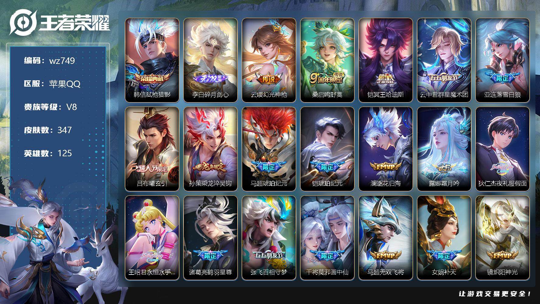 【云游堂】 【可二次实名】【wz749】【商品标题】:苹果Q-V8-最强王者段位-125英雄-347皮肤-1典藏-0珍品无双-1无双-0珍品传说-30传说-112史诗 【荣耀典藏】:韩信弑枪猎影 【无双皮肤】:李白碎月剑心 【传说皮肤】:云缨幻光神枪,桑启鸣野蒿,铠冥王哈迪斯,云中君群星魔术团,亚连落雪白狼,吕布曦玄引,孙策乘龙淬吴钩,马超琥珀纪元,铠琥珀纪元,澜逐花归海,露娜霜月吟,狄仁杰夜礼服假面,王昭君永恒水手月亮,诸葛亮鹤羽星尊,张飞百相守梦,干将莫邪画中仙,马超无双飞将,女娲补天,镜炽阳神光,虞姬启明星使,曜云鹰飞将,李信一念神魔,伽罗太华,貂蝉猫影幻舞,后羿黄金射手座,李白凤求凰,孙尚香末日机甲,宫本武藏地狱之眼,孙悟空地狱火,狄仁杰超时空战士 【限定皮肤】:铠冥王哈迪斯,暃埋骨钱,蒙犽顽岩魄,蔡文姬夏日便利店,虞姬夏日便利店,姜子牙天穹之誓,狄仁杰阴阳师,赵云皇家上将,墨子神迹守卫,嬴政优雅恋人,鲁班七号狮舞东方,高渐离死亡摇滚,高渐离玩趣恶龙,阿轲迷踪丽影,扁鹊奇幻香踪,元歌云间偶戏,曹操天狼征服者,典韦穷奇,典韦蓝屏警告,典韦岱宗,马可波罗山海玄木吟,狄仁杰魔术师,狄仁杰万华元夜,项羽海滩派对,老夫子醍醐杖,老夫子航海奇遇记,关羽百相守梦,程咬金演武夺筹,刘邦夺宝奇兵,王昭君凤凰于飞,花木兰瑞麟志,花木兰默契交锋,亚瑟潮玩骑士王,后羿辉光之辰,刘备百相守梦,张飞百相守梦,李元芳银河之约,虞姬启明星使,钟馗神迹守卫,钟馗驱傩正仪,杨玉环遇见飞天,杨戬潮玩骑兵,女娲朔望之晖,女娲补天,哪吒逐梦之翼,干将莫邪画中仙,蔡文姬繁星吟游,太乙真人华丽摇滚,鬼谷子原初探秘者,诸葛亮鹤羽星尊,百里玄策原初追逐者,弈星混沌棋,梦奇顽趣,沈梦溪星空之诺,沈梦溪匿光破解者,明世隐疑决卦,裴擒虎李小龙,裴擒虎擒涛扼浪,狂铁御狮,云中君纤云弄巧,伽罗太华,伽罗天狼溯光者,盾山御銮,上官婉儿天狼绘梦者,嫦娥如梦令,嫦娥拒霜思,西施玲珑珍味,鲁班大师探海日志,桑启海盐诗旅,金蝉唐三藏,戈娅驭风魔法,艾琳流音漫舞,司空震地狱燃心,阿古朵江河有灵,张良古海寻踪,王昭君永恒水手月亮,狄仁杰夜礼服假面,蒙犽百解令,蒙恬荣光圣徽,高渐离燃音魔法,妲己灵卜魔法,鬼谷子天穹祈灯,李白碎月剑心,伽罗琥珀纪元,铠琥珀纪元,马超琥珀纪元,孙策乘龙淬吴钩,吕布曦玄引,百里玄策超元猎域,亚连落雪白狼,沈梦溪龙舞盛年,鲁班七号蔬乡物语,李元芳蔬乡物语,刘邦剑破天穹,上官婉儿群星魔术团,程咬金群星魔术团,云中君群星魔术团,镜青焰无极,项羽苍威无极,刘备异域游侠,芈月浮光幕影,周瑜熔金海岸 【年限皮肤】:花木兰瑞麟志,王昭君凤凰于飞,李白凤求凰,后羿辉光之辰,伽罗太华,典韦岱宗,马可波罗山海玄木吟,孙策乘龙淬吴钩 【赛季限定】:典韦穷奇,狄仁杰万华元夜,老夫子醍醐杖,程咬金演武夺筹,张良古海寻踪,钟馗驱傩正仪,鬼谷子原初探秘者,百里玄策原初追逐者,弈星混沌棋,梦奇顽趣,明世隐疑决卦,裴擒虎擒涛扼浪,狂铁御狮,盾山御銮,鲁班大师探海日志,桑启海盐诗旅,鬼谷子天穹祈灯,蒙恬荣光圣徽,刘邦剑破天穹,姜子牙天穹之誓 【战令限定】:墨子神迹守卫,蔡文姬夏日便利店,虞姬夏日便利店,鲁班七号狮舞东方,阿轲迷踪丽影,扁鹊奇幻香踪,元歌云间偶戏,典韦蓝屏警告,老夫子航海奇遇记,刘邦夺宝奇兵,艾琳流音漫舞,亚瑟潮玩骑士王,李元芳银河之约,钟馗神迹守卫,杨戬潮玩骑兵,女娲朔望之晖,沈梦溪星空之诺,西施玲珑珍味,司空震地狱燃心,戈娅驭风魔法,高渐离燃音魔法,妲己灵卜魔法,鲁班七号蔬乡物语,李元芳蔬乡物语,镜青焰无极,项羽苍威无极 【史诗皮肤】:鲁班七号电玩小子,项羽苍穹之光,露娜紫霞仙子,赵云皇家上将,赵云未来纪元,貂蝉圣诞恋歌,甄姬冰雪圆舞曲,王昭君偶像歌手,狄仁杰魔术师,廉颇地狱岩魂,宫本武藏鬼剑武藏,孙尚香水果甜心,嬴政优雅恋人,嬴政暗夜贵公子,嬴政摇滚巨星,妲己女仆咖啡,墨子龙骑士,墨子金属风暴,吕布圣诞狂欢,刘禅绅士熊喵,曹操幽灵船长,李白千年之狐,吕布末日机甲,张飞乱世虎臣,王昭君凤凰于飞,花木兰水晶猎龙者,刘邦德古拉伯爵,夏侯惇乘风破浪,小乔缤纷独角兽,兰陵王暗隐猎兽者,诸葛亮黄金分割率,亚瑟心灵战警,安琪拉心灵骇客,后羿辉光之辰,百里守约特工魅影,铠曙光守护者,蔡文姬舞动绿茵,哪吒逐梦之翼,刘禅天才门将,李元芳逐浪之夏,白起星夜王子,阿轲节奏热浪,杨玉环遇见飞天,孙策猫狗日记,大乔猫狗日记,花木兰瑞麟志,典韦蓝屏警告,鲁班七号狮舞东方,狄仁杰鹰眼统帅,公孙离无限星赏官,曹操天狼征服者,蔡文姬繁星吟游,李元芳银河之约,娜可露露晚萤,典韦岱宗,嫦娥如梦令,大乔白蛇,不知火舞魅语,阿轲迷踪丽影,橘右京修罗,上官婉儿天狼绘梦者,百里玄策原初追逐者,裴擒虎李小龙,云中君纤云弄巧,元歌云间偶戏,花木兰默契交锋