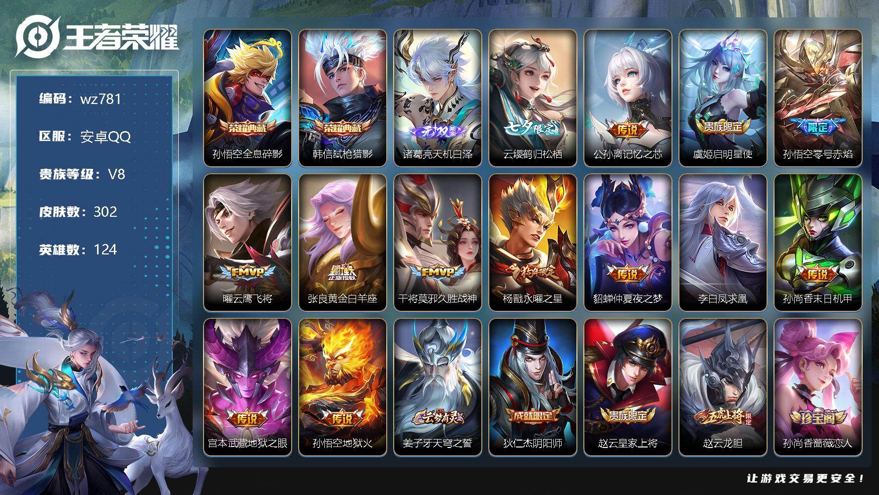 【云游堂】 【可二次实名】【wz734】【商品标题】:安卓Q-V0-最强王者段位-124英雄-231皮肤-0典藏-0珍品无双-0无双-0珍品传说-6传说-50史诗 【传说皮肤】:云缨幻光神枪,马超无双飞将,貂蝉猫影幻舞,花木兰冠军飞将,孙尚香末日机甲,孙悟空地狱火 【限定皮肤】:蔡文姬夏日便利店,虞姬夏日便利店,姜子牙天穹之誓,狄仁杰阴阳师,赵云皇家上将,嬴政白昼王子,鲁班七号狮舞东方,高渐离玩趣恶龙,吕布猎兽之王,周瑜赤莲之焰,元歌无心,夏侯惇朔风刀,曹操烛龙,典韦穷奇,典韦蓝屏警告,狄仁杰魔术师,狄仁杰万华元夜,项羽海滩派对,老夫子醍醐杖,关羽冰锋战神,程咬金演武夺筹,韩信飞衡,兰陵王驯魔猎人,兰陵王金庭之子,孙悟空大圣娶亲,牛魔御旌,李元芳银河之约,李元芳云中旅人,钟馗神迹守卫,钟馗驱傩正仪,女娲朔望之晖,鬼谷子原初探秘者,鬼谷子五谷丰年,百里玄策原初追逐者,弈星混沌棋,梦奇顽趣,沈梦溪星空之诺,沈梦溪大漠名商,明世隐疑决卦,裴擒虎李小龙,裴擒虎擒涛扼浪,狂铁御狮,米莱狄御霄,盾山御銮,上官婉儿梁祝,嫦娥拒霜思,鲁班大师探海日志,桑启海盐诗旅,阿古朵江河有灵,张良古海寻踪,蒙犽百解令,蒙恬荣光圣徽,鬼谷子天穹祈灯,沈梦溪龙舞盛年,刘邦剑破天穹,周瑜熔金海岸 【年限皮肤】:韩信飞衡 【赛季限定】:夏侯惇朔风刀,曹操烛龙,典韦穷奇,狄仁杰万华元夜,老夫子醍醐杖,程咬金演武夺筹,兰陵王金庭之子,张良古海寻踪,牛魔御旌,李元芳云中旅人,钟馗驱傩正仪,鬼谷子原初探秘者,百里玄策原初追逐者,弈星混沌棋,梦奇顽趣,沈梦溪大漠名商,明世隐疑决卦,裴擒虎擒涛扼浪,狂铁御狮,米莱狄御霄,盾山御銮,鲁班大师探海日志,桑启海盐诗旅,鬼谷子天穹祈灯,蒙恬荣光圣徽,刘邦剑破天穹,姜子牙天穹之誓 【战令限定】:蔡文姬夏日便利店,虞姬夏日便利店,嬴政白昼王子,鲁班七号狮舞东方,吕布猎兽之王,周瑜赤莲之焰,典韦蓝屏警告,兰陵王驯魔猎人,李元芳银河之约,钟馗神迹守卫,女娲朔望之晖,沈梦溪星空之诺 【史诗皮肤】:露娜紫霞仙子,阿轲暗夜猫娘,赵云皇家上将,赵云未来纪元,貂蝉圣诞恋歌,甄姬冰雪圆舞曲,狄仁杰魔术师,宫本武藏鬼剑武藏,孙尚香水果甜心,妲己魅力维加斯,墨子金属风暴,曹操幽灵船长,李白千年之狐,吕布末日机甲,张飞乱世虎臣,韩信白龙吟,关羽冰锋战神,花木兰水晶猎龙者,夏侯惇乘风破浪,小乔缤纷独角兽,兰陵王暗隐猎兽者,诸葛亮黄金分割率,雅典娜冰冠公主,百里守约特工魅影,铠曙光守护者,蔡文姬舞动绿茵,白起星夜王子,嬴政白昼王子,孙策猫狗日记,孙悟空大圣娶亲,典韦蓝屏警告,鲁班七号狮舞东方,狄仁杰鹰眼统帅,兰陵王驯魔猎人,上官婉儿梁祝,李元芳银河之约,韩信飞衡,百里玄策原初追逐者,裴擒虎李小龙,嫦娥拒霜思,夏洛特永昼,鬼谷子五谷丰年,元歌无心,梦奇顽趣,阿古朵江河有灵,蒙犽百解令,蒙恬荣光圣徽,蔡文姬夏日便利店,牛魔星界战将,公孙离涂山容容 【其他皮肤】:项羽海滩派对,韩信教廷特使,韩信街头霸王,露娜哥特玫瑰,达摩大发明家,赵云忍炎影,芈月红桃皇后,程咬金爱与正义,白起白色死神,牛魔西部大镖客,扁鹊化身博士,扁鹊救世之瞳,宫本武藏未来纪元,安琪拉玩偶对对碰,孙膑天使之翼,姜子牙时尚教父,妲己少女阿狸,典韦黄金武士,亚瑟死亡骑士,达摩拳王,花木兰兔女郎,张飞五福同心,宫本武藏万象初新,后羿阿尔法小队,狄仁杰阴阳师,刘备纽约教父,刘备汉昭烈帝,关羽龙腾万里,墨子进击墨子号,钟无艳海滩丽影,曹操烛龙,老夫子功夫老勺,孙尚香沉稳之力,典韦穷奇,李白敏锐之力,鬼谷子幻乐之宴,狂铁御狮,安琪拉如懿,苏烈坚韧之力,大乔守护之力,米莱狄御霄,吕布猎兽之王,明世隐虹云星官,牛魔御旌,女娲朔望之晖,钟馗神迹守卫,盾山御銮,孙膑归虚梦演,高渐离玩趣恶龙,沈梦溪鲨炮海盗猫,姜子牙炽热元素使,夏侯惇朔风刀,周瑜赤莲之焰,沈梦溪星空之诺,弈星混沌棋,哪吒次元突破,鲁班七号黑桃队长,明世隐疑决卦,盾山圆桌骑士,老夫子醍醐杖,鬼谷子原初探秘者,狄仁杰万华元夜,刘禅秘密基地,程咬金演武夺筹,张良缤纷绘卷,钟馗驱傩正仪,鲁班大师乓乓大师,程咬金无双福将,兰陵王金庭之子,沈梦溪大漠名商,蒙恬蔚蓝守将,李元芳云中旅人,桑启海盐诗旅,海月幻泉雾影,猪八戒潮玩探月行,裴擒虎擒涛扼浪,太乙真人劲辣红锅,鲁班大师探海日志,张良古海寻踪,钟无艳聚星闪耀,亚连破局者,后羿完美运算,鬼谷子天穹祈灯,嫦娥漠中幻影,朵莉亚金色潮汐,廉颇功夫炙烤,沈梦溪龙舞盛年,钟无艳春野之旅,刘邦剑破天穹,大司命暗都幽影,姜子牙天穹之誓,周瑜熔金海岸,虞姬夏日便利店,东皇太一噬灭天穹,干将莫邪雾都夜雨,吕布逐霄战戟,苍苍林狼骑,太乙真人谧流熔炉,典韦铁骨偃魂,影魅影绮裳,西施雪境奇遇,姜子牙星梦巡礼,钟馗虚灵犬护,张良灵野札记,甄姬逆浪荇歌,鲁班七号福禄