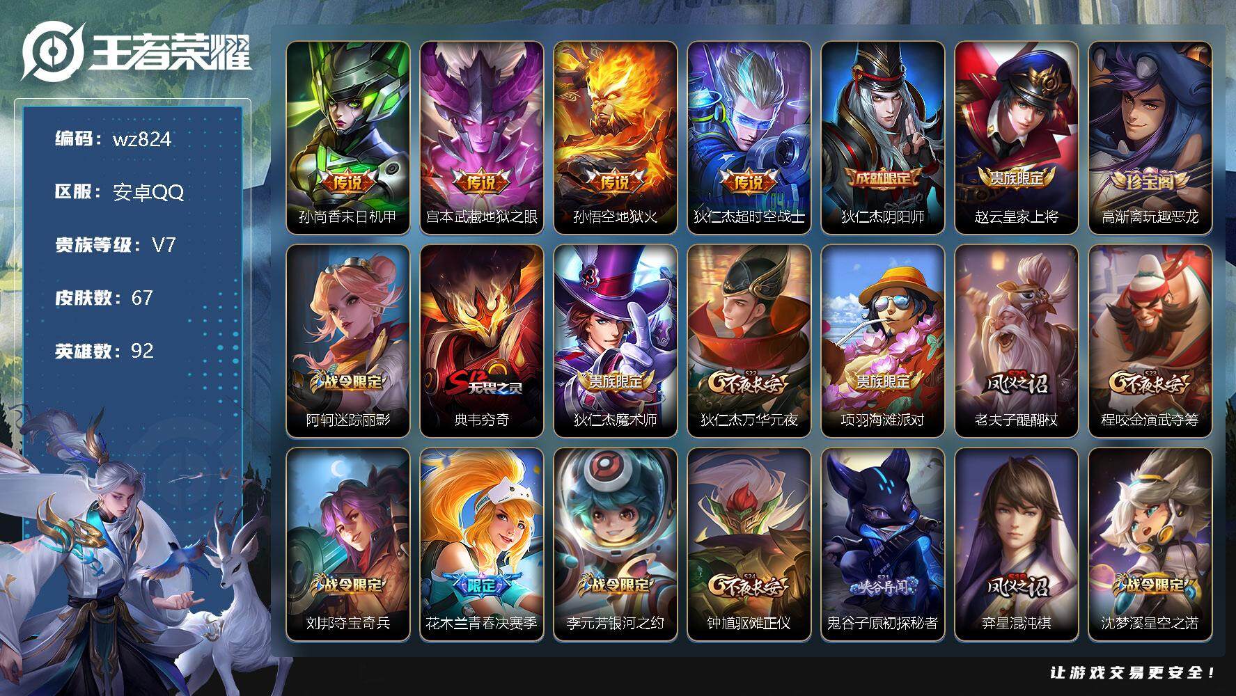 【云游堂】 【可二次实名】【wz824】【商品标题】:安卓Q-V7-尊贵铂金II段位-92英雄-67皮肤-0典藏-0珍品无双-0无双-0珍品传说-4传说-11史诗 【传说皮肤】:孙尚香末日机甲,宫本武藏地狱之眼,孙悟空地狱火,狄仁杰超时空战士 【限定皮肤】:狄仁杰阴阳师,赵云皇家上将,高渐离玩趣恶龙,阿轲迷踪丽影,典韦穷奇,狄仁杰魔术师,狄仁杰万华元夜,项羽海滩派对,老夫子醍醐杖,程咬金演武夺筹,刘邦夺宝奇兵,花木兰青春决赛季,李元芳银河之约,钟馗驱傩正仪,鬼谷子原初探秘者,弈星混沌棋,沈梦溪星空之诺,明世隐疑决卦,裴擒虎李小龙,狂铁御狮,米莱狄御霄 【赛季限定】:典韦穷奇,狄仁杰万华元夜,老夫子醍醐杖,程咬金演武夺筹,钟馗驱傩正仪,鬼谷子原初探秘者,弈星混沌棋,明世隐疑决卦,狂铁御狮,米莱狄御霄 【战令限定】:阿轲迷踪丽影,刘邦夺宝奇兵,李元芳银河之约,沈梦溪星空之诺 【史诗皮肤】:露娜紫霞仙子,赵云皇家上将,狄仁杰魔术师,墨子金属风暴,夏侯惇乘风破浪,诸葛亮黄金分割率,花木兰青春决赛季,狄仁杰鹰眼统帅,李元芳银河之约,阿轲迷踪丽影,裴擒虎李小龙 【其他皮肤】:项羽海滩派对,韩信街头霸王,扁鹊化身博士,妲己少女阿狸,亚瑟死亡骑士,刘备万事如意,狄仁杰阴阳师,钟无艳海滩丽影,宫本武藏霸王丸,老夫子功夫老勺,典韦穷奇,李白敏锐之力,狂铁御狮,项羽科学大爆炸,米莱狄御霄,高渐离玩趣恶龙,沈梦溪星空之诺,弈星混沌棋,哪吒次元突破,明世隐疑决卦,刘邦夺宝奇兵,盾山圆桌骑士,老夫子醍醐杖,鬼谷子原初探秘者,狄仁杰万华元夜,杨戬次元傲视,程咬金演武夺筹,张良缤纷绘卷,盘古重装意志,钟馗驱傩正仪,鲁班七号福禄兄弟,貂蝉异域舞娘,小乔万圣前夜,孙悟空西部大镖客,后羿精灵王,兰陵王隐刃,李白范海辛,李元芳特种部队,关羽天启骑士,夏侯惇战争骑士,杨戬埃及法老,哪吒三太子,东皇太一东海龙王,鬼谷子阿摩司公爵,百里守约绝影神枪,百里玄策威尼斯狂欢,苏烈爱与和平,裴擒虎街头旋风,盾山极冰防御线,盘古创世神祝,曜归虚梦演,司空震启蛰 【内测皮肤】:高渐离玩趣恶龙 【营地ID】:2126582554
