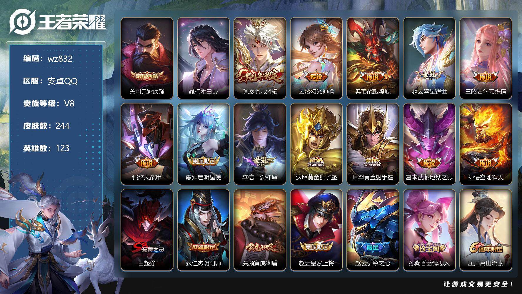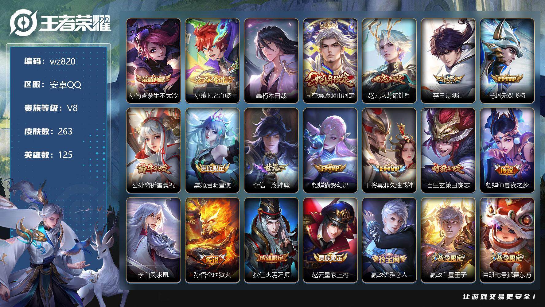 【云游堂】 【可二次实名】【wz820】【商品标题】:安卓Q-V8-至尊星耀II段位-125英雄-263皮肤-1典藏-0珍品无双-0无双-2珍品传说-13传说-69史诗 【荣耀典藏】:孙尚香杀手不太冷 【珍品传说】:孙策时之奇旅,暃朽木白哉 【传说皮肤】:司空震愿照山河定,赵云乘龙铭钟鼎,李白诗剑行,马超无双飞将,公孙离祈雪灵祝,虞姬启明星使,李信一念神魔,貂蝉猫影幻舞,干将莫邪久胜战神,百里玄策白虎志,貂蝉仲夏夜之梦,李白凤求凰,孙悟空地狱火 【限定皮肤】:狄仁杰阴阳师,赵云皇家上将,嬴政优雅恋人,嬴政白昼王子,鲁班七号狮舞东方,芈月重明,吕布猎兽之王,周瑜赤莲之焰,元歌无心,夏侯惇朔风刀,曹操烛龙,典韦穷奇,典韦蓝屏警告,马可波罗暗影游猎,狄仁杰魔术师,狄仁杰万华元夜,达摩沙漠行僧,项羽海滩派对,老夫子醍醐杖,程咬金演武夺筹,露娜一生所爱,韩信飞衡,兰陵王驯魔猎人,兰陵王金庭之子,花木兰青春决赛季,花木兰瑞麟志,孙悟空至尊宝,孙悟空大圣娶亲,牛魔御旌,李元芳银河之约,李元芳云中旅人,虞姬启明星使,钟馗神迹守卫,钟馗驱傩正仪,杨玉环遇见飞天,女娲朔望之晖,干将莫邪胡桃夹子,雅典娜单词大作战,雅典娜黎明之约,蔡文姬繁星吟游,太乙真人饕餮,太乙真人华丽摇滚,鬼谷子原初探秘者,鬼谷子五谷丰年,苏烈千军破阵,百里玄策白虎志,百里玄策原初追逐者,弈星混沌棋,梦奇顽趣,公孙离祈雪灵祝,沈梦溪星空之诺,沈梦溪大漠名商,明世隐疑决卦,裴擒虎李小龙,裴擒虎擒涛扼浪,狂铁御狮,米莱狄御霄,云中君纤云弄巧,盾山御銮,猪八戒西部大镖客,上官婉儿梁祝,蒙犽狂想玩偶喵,鲁班大师探海日志,桑启海盐诗旅,艾琳女武神,张良古海寻踪,蒙恬荣光圣徽,高渐离燃音魔法,妲己灵卜魔法,鬼谷子天穹祈灯,赵云乘龙铭钟鼎,刘邦剑破天穹,周瑜熔金海岸 【年限皮肤】:百里玄策白虎志,花木兰瑞麟志,李白凤求凰,公孙离祈雪灵祝,韩信飞衡,赵云乘龙铭钟鼎 【赛季限定】:芈月重明,夏侯惇朔风刀,曹操烛龙,典韦穷奇,狄仁杰万华元夜,达摩沙漠行僧,老夫子醍醐杖,程咬金演武夺筹,兰陵王金庭之子,张良古海寻踪,牛魔御旌,李元芳云中旅人,钟馗驱傩正仪,雅典娜黎明之约,太乙真人饕餮,鬼谷子原初探秘者,苏烈千军破阵,百里玄策原初追逐者,弈星混沌棋,梦奇顽趣,沈梦溪大漠名商,明世隐疑决卦,裴擒虎擒涛扼浪,狂铁御狮,米莱狄御霄,盾山御銮,鲁班大师探海日志,桑启海盐诗旅,鬼谷子天穹祈灯,蒙恬荣光圣徽,刘邦剑破天穹 【战令限定】:嬴政白昼王子,鲁班七号狮舞东方,吕布猎兽之王,周瑜赤莲之焰,典韦蓝屏警告,马可波罗暗影游猎,兰陵王驯魔猎人,李元芳银河之约,钟馗神迹守卫,女娲朔望之晖,雅典娜单词大作战,沈梦溪星空之诺,猪八戒西部大镖客,蒙犽狂想玩偶喵,高渐离燃音魔法,妲己灵卜魔法 【史诗皮肤】:鲁班七号电玩小子,露娜紫霞仙子,阿轲暗夜猫娘,赵云皇家上将,赵云未来纪元,貂蝉圣诞恋歌,甄姬冰雪圆舞曲,王昭君偶像歌手,狄仁杰魔术师,宫本武藏鬼剑武藏,孙尚香水果甜心,嬴政优雅恋人,嬴政摇滚巨星,妲己魅力维加斯,妲己女仆咖啡,墨子金属风暴,吕布圣诞狂欢,曹操幽灵船长,李白千年之狐,吕布末日机甲,张飞乱世虎臣,孙悟空至尊宝,花木兰水晶猎龙者,刘邦德古拉伯爵,夏侯惇乘风破浪,诸葛亮黄金分割率,花木兰青春决赛季,百里守约特工魅影,铠曙光守护者,蔡文姬舞动绿茵,刘禅天才门将,李元芳逐浪之夏,程咬金功夫厨神,白起星夜王子,杨玉环遇见飞天,嬴政白昼王子,露娜一生所爱,孙悟空大圣娶亲,花木兰瑞麟志,典韦蓝屏警告,鲁班七号狮舞东方,狄仁杰鹰眼统帅,公孙离无限星赏官,兰陵王驯魔猎人,上官婉儿梁祝,蔡文姬繁星吟游,李元芳银河之约,韩信飞衡,不知火舞魅语,橘右京修罗,马可波罗暗影游猎,蒙犽狂想玩偶喵,百里玄策原初追逐者,裴擒虎李小龙,云中君纤云弄巧,杨戬天秀启明,雅典娜黎明之约,鬼谷子五谷丰年,元歌无心,梦奇顽趣,妲己灵卜魔法,高渐离燃音魔法,蒙恬荣光圣徽,姬小满飞车小橘子,赵怀真器灵浮梦炉,刘禅鸭鸭历险记,狂铁龙之律动,后羿石田雨龙,周瑜百相守梦,黄忠百相守梦 【其他皮肤】:项羽海滩派对,韩信教廷特使,韩信街头霸王,露娜哥特玫瑰,阿轲爱心护理,达摩大发明家,赵云白执事,赵云忍炎影,艾琳女武神,程咬金星际陆战队,扁鹊化身博士,宫本武藏未来纪元,安琪拉玩偶对对碰,孙膑天使之翼,姜子牙时尚教父,妲己少女阿狸,典韦黄金武士,亚瑟死亡骑士,达摩拳王,花木兰兔女郎,张飞五福同心,甄姬花好人间,刘备万事如意,宫本武藏万象初新,后羿阿尔法小队,狄仁杰阴阳师,刘备纽约教父,关羽龙腾万里,钟无艳海滩丽影,太乙真人饕餮,宫本武藏霸王丸,曹操烛龙,王昭君幻想奇妙夜,芈月重明,狂铁命运角斗场,老夫子功夫老勺,孙尚香沉稳之力,典韦穷奇,诸葛亮掌控之力,李白敏锐之力,鬼谷子幻乐之宴,狂铁御狮,