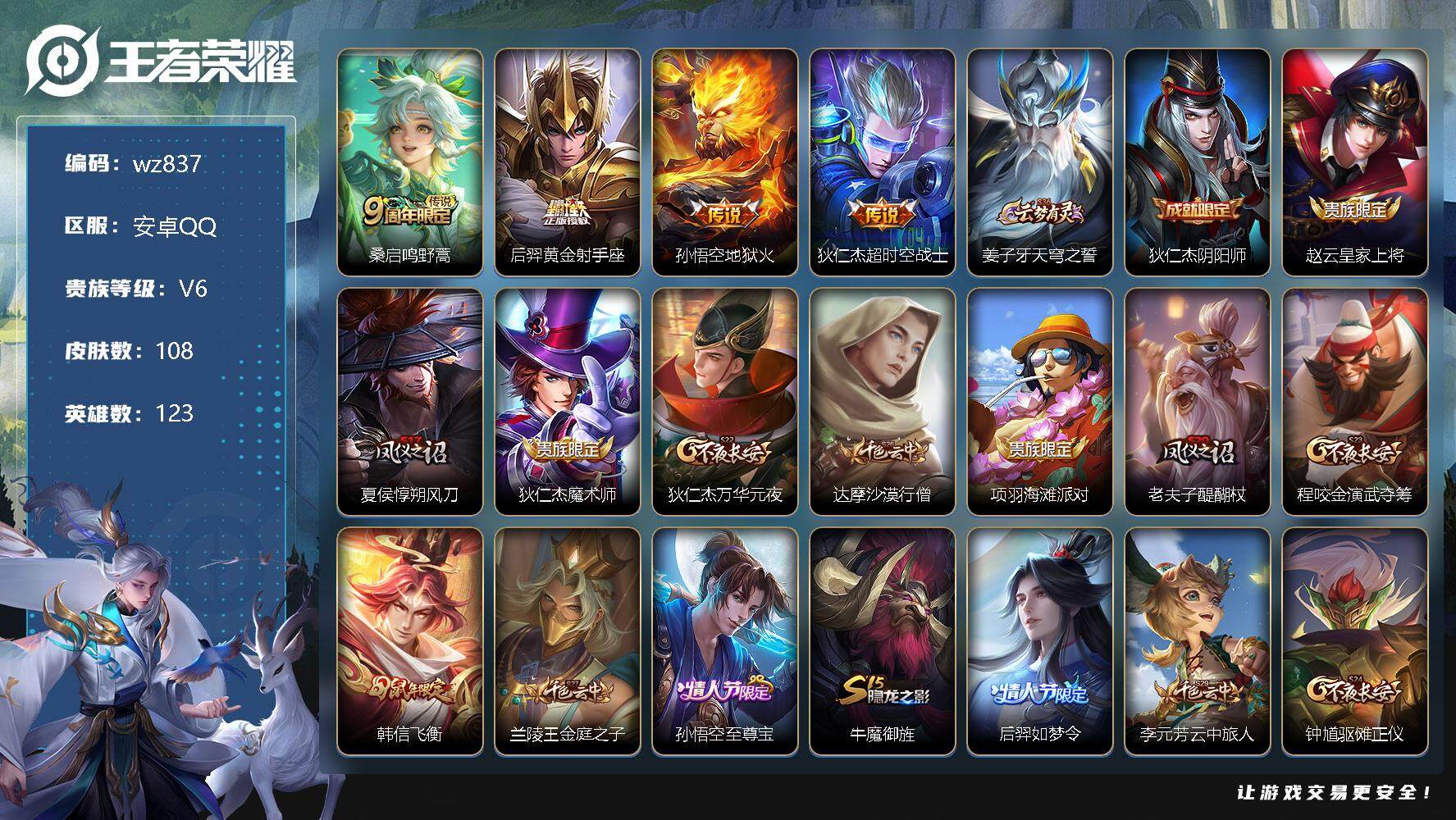【云游堂】 【可二次实名】【wz837】【商品标题】:安卓Q-V6-最强王者段位-123英雄-108皮肤-0典藏-0珍品无双-0无双-0珍品传说-4传说-19史诗 【传说皮肤】:桑启鸣野蒿,后羿黄金射手座,孙悟空地狱火,狄仁杰超时空战士 【限定皮肤】:姜子牙天穹之誓,狄仁杰阴阳师,赵云皇家上将,夏侯惇朔风刀,狄仁杰魔术师,狄仁杰万华元夜,达摩沙漠行僧,项羽海滩派对,老夫子醍醐杖,程咬金演武夺筹,韩信飞衡,兰陵王金庭之子,孙悟空至尊宝,牛魔御旌,后羿如梦令,李元芳云中旅人,钟馗驱傩正仪,鬼谷子原初探秘者,苏烈千军破阵,沈梦溪大漠名商,明世隐疑决卦,裴擒虎擒涛扼浪,狂铁御狮,米莱狄御霄,盾山御銮,上官婉儿梁祝,鲁班大师探海日志,桑启海盐诗旅,张良古海寻踪,鬼谷子天穹祈灯,刘邦剑破天穹,周瑜熔金海岸 【年限皮肤】:韩信飞衡 【赛季限定】:夏侯惇朔风刀,狄仁杰万华元夜,达摩沙漠行僧,老夫子醍醐杖,程咬金演武夺筹,兰陵王金庭之子,张良古海寻踪,牛魔御旌,李元芳云中旅人,钟馗驱傩正仪,鬼谷子原初探秘者,苏烈千军破阵,沈梦溪大漠名商,明世隐疑决卦,裴擒虎擒涛扼浪,狂铁御狮,米莱狄御霄,盾山御銮,鲁班大师探海日志,桑启海盐诗旅,鬼谷子天穹祈灯,刘邦剑破天穹,姜子牙天穹之誓 【史诗皮肤】:赵云皇家上将,狄仁杰魔术师,廉颇地狱岩魂,宫本武藏鬼剑武藏,孙尚香水果甜心,墨子金属风暴,刘禅绅士熊喵,孙悟空至尊宝,花木兰水晶猎龙者,雅典娜冰冠公主,刘禅天才门将,李元芳逐浪之夏,程咬金功夫厨神,伽罗箭羽风息,狄仁杰鹰眼统帅,公孙离无限星赏官,上官婉儿梁祝,韩信飞衡,后羿如梦令 【其他皮肤】:项羽海滩派对,韩信教廷特使,韩信街头霸王,露娜哥特玫瑰,赵云忍炎影,程咬金爱与正义,牛魔西部大镖客,宫本武藏未来纪元,妲己少女阿狸,典韦黄金武士,花木兰兔女郎,张飞五福同心,甄姬花好人间,宫本武藏万象初新,狄仁杰阴阳师,关羽龙腾万里,墨子进击墨子号,钟无艳海滩丽影,王昭君幻想奇妙夜,老夫子功夫老勺,孙尚香沉稳之力,鬼谷子幻乐之宴,狂铁御狮,大乔守护之力,米莱狄御霄,明世隐虹云星官,牛魔御旌,小乔丁香结,吕布野性能量,盾山御銮,沈梦溪鲨炮海盗猫,夏侯惇朔风刀,哪吒次元突破,鲁班七号黑桃队长,明世隐疑决卦,老夫子醍醐杖,狂铁特工战影,鬼谷子原初探秘者,狄仁杰万华元夜,刘禅秘密基地,程咬金演武夺筹,钟馗驱傩正仪,鲁班大师乓乓大师,苏烈千军破阵,达摩沙漠行僧,程咬金无双福将,兰陵王金庭之子,沈梦溪大漠名商,李元芳云中旅人,桑启海盐诗旅,猪八戒潮玩探月行,裴擒虎擒涛扼浪,鲁班大师探海日志,张良古海寻踪,后羿完美运算,鬼谷子天穹祈灯,廉颇功夫炙烤,刘邦剑破天穹,姜子牙天穹之誓,周瑜熔金海岸,盘古敬我三分,哪吒罗小黑战记,露娜绯红之刃,程咬金华尔街大亨,王昭君精灵公主,狄仁杰锦衣卫,曹操超能战警,小乔万圣前夜,孙悟空西部大镖客,后羿精灵王,兰陵王隐刃,钟馗地府判官,夏侯惇战争骑士,马可波罗激情绿茵,干将莫邪第七人偶,铠龙域领主,百里守约绝影神枪,苏烈爱与和平,公孙离花间舞,裴擒虎街头旋风,元歌午夜歌剧院,李信灼热之刃,瑶森,澜孤猎,司空震启蛰 【内测皮肤】:狂铁特工战影 【营地ID】:1741163845
