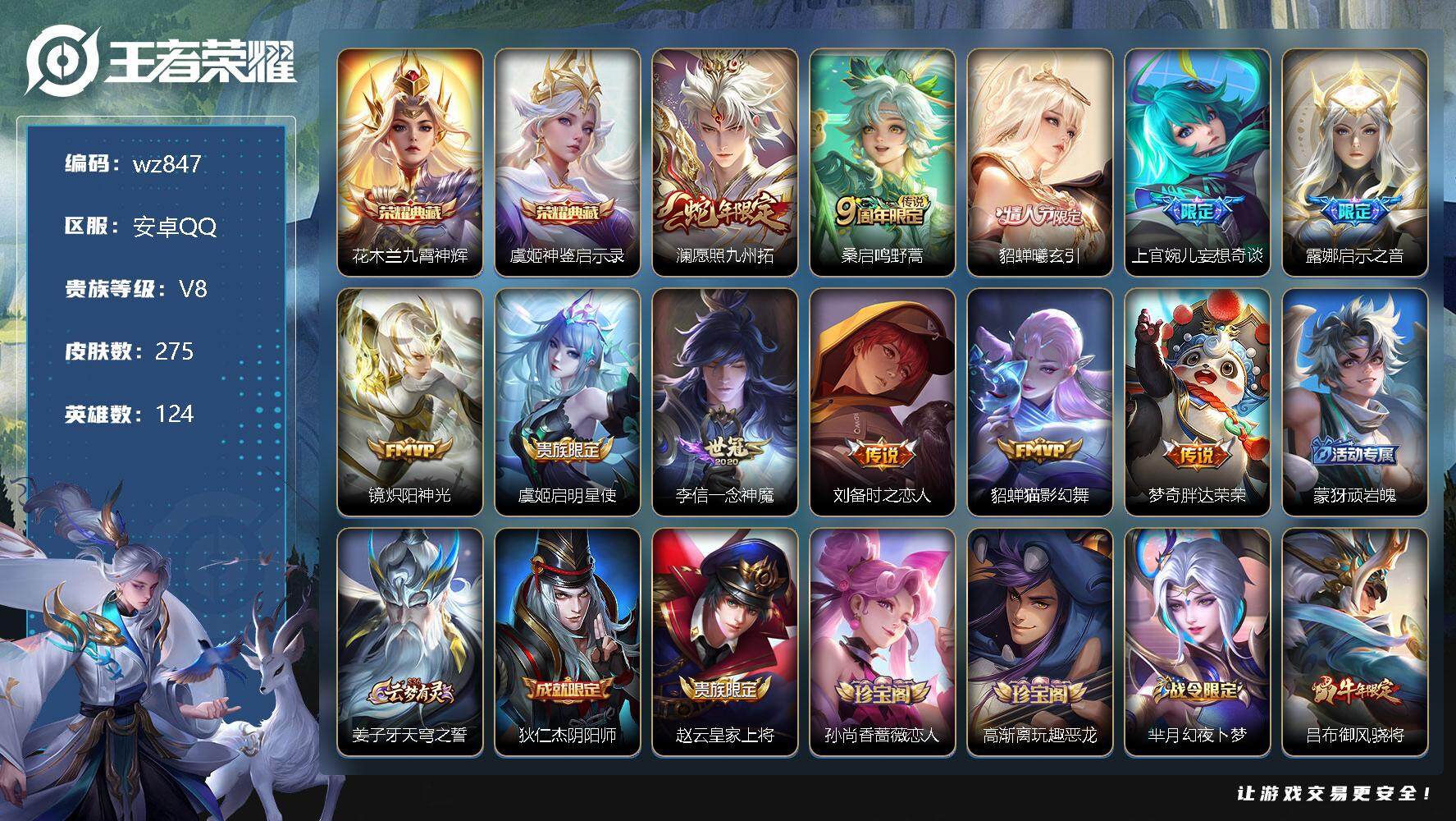 【云游堂】 【可二次实名】【wz847】【商品标题】:安卓Q-V8-最强王者段位-124英雄-275皮肤-2典藏-0珍品无双-0无双-0珍品传说-11传说-82史诗 【荣耀典藏】:花木兰九霄神辉,虞姬神鉴启示录 【传说皮肤】:澜愿照九州拓,桑启鸣野蒿,貂蝉曦玄引,上官婉儿妄想奇谈,露娜启示之音,镜炽阳神光,虞姬启明星使,李信一念神魔,刘备时之恋人,貂蝉猫影幻舞,梦奇胖达荣荣 【限定皮肤】:蒙犽顽岩魄,姜子牙天穹之誓,狄仁杰阴阳师,赵云皇家上将,孙尚香蔷薇恋人,高渐离玩趣恶龙,芈月幻夜卜梦,吕布御风骁将,元歌云间偶戏,元歌无心,夏侯惇朔风刀,马可波罗山海玄木吟,狄仁杰魔术师,狄仁杰万华元夜,达摩星际陆战队,达摩沙漠行僧,项羽海滩派对,老夫子醍醐杖,程咬金演武夺筹,露娜一生所爱,露娜启示之音,韩信傲雪梅枪,兰陵王金庭之子,亚瑟潮玩骑士王,孙悟空至尊宝,后羿如梦令,后羿圣弓游侠,李元芳云中旅人,虞姬霸王别姬,虞姬启明星使,钟馗驱傩正仪,杨玉环遇见飞天,干将莫邪冰霜恋舞曲,干将莫邪真爱魔法,雅典娜黎明之约,太乙真人华丽摇滚,鬼谷子原初探秘者,鬼谷子五谷丰年,黄忠火炮绅士,苏烈千军破阵,百里玄策原初追逐者,弈星混沌棋,梦奇顽趣,公孙离蜜橘之夏,沈梦溪大漠名商,明世隐疑决卦,裴擒虎李小龙,裴擒虎擒涛扼浪,狂铁御狮,米莱狄御霄,米莱狄胡桃异想国,云中君纤云弄巧,盾山御銮,上官婉儿妄想奇谈,嫦娥拒霜思,鲁班大师探海日志,桑启海盐诗旅,阿古朵江河有灵,张良古海寻踪,蒙恬荣光圣徽,高渐离燃音魔法,妲己灵卜魔法,鬼谷子天穹祈灯,姬小满妄想食味,貂蝉曦玄引,沈梦溪龙舞盛年,鲁班七号蔬乡物语,李元芳蔬乡物语,刘邦剑破天穹,程咬金群星魔术团,镜青焰无极,项羽苍威无极,周瑜熔金海岸 【年限皮肤】:吕布御风骁将,马超神威,马可波罗山海玄木吟 【赛季限定】:夏侯惇朔风刀,狄仁杰万华元夜,达摩沙漠行僧,老夫子醍醐杖,程咬金演武夺筹,兰陵王金庭之子,张良古海寻踪,李元芳云中旅人,钟馗驱傩正仪,雅典娜黎明之约,鬼谷子原初探秘者,苏烈千军破阵,百里玄策原初追逐者,弈星混沌棋,梦奇顽趣,沈梦溪大漠名商,明世隐疑决卦,裴擒虎擒涛扼浪,狂铁御狮,米莱狄御霄,盾山御銮,鲁班大师探海日志,桑启海盐诗旅,鬼谷子天穹祈灯,蒙恬荣光圣徽,刘邦剑破天穹,姜子牙天穹之誓 【战令限定】:芈月幻夜卜梦,元歌云间偶戏,达摩星际陆战队,亚瑟潮玩骑士王,后羿圣弓游侠,干将莫邪真爱魔法,黄忠火炮绅士,米莱狄胡桃异想国,高渐离燃音魔法,妲己灵卜魔法,鲁班七号蔬乡物语,李元芳蔬乡物语,镜青焰无极,项羽苍威无极 【史诗皮肤】:鲁班七号电玩小子,项羽苍穹之光,露娜紫霞仙子,阿轲暗夜猫娘,赵云皇家上将,赵云未来纪元,貂蝉圣诞恋歌,甄姬冰雪圆舞曲,王昭君偶像歌手,狄仁杰魔术师,廉颇地狱岩魂,宫本武藏鬼剑武藏,孙尚香蔷薇恋人,孙尚香水果甜心,嬴政摇滚巨星,妲己魅力维加斯,妲己女仆咖啡,墨子金属风暴,吕布圣诞狂欢,刘禅绅士熊喵,曹操幽灵船长,李白千年之狐,吕布末日机甲,张飞乱世虎臣,虞姬霸王别姬,孙悟空至尊宝,花木兰水晶猎龙者,刘邦德古拉伯爵,夏侯惇乘风破浪,小乔缤纷独角兽,兰陵王暗隐猎兽者,诸葛亮黄金分割率,亚瑟心灵战警,安琪拉心灵骇客,百里守约特工魅影,铠曙光守护者,刘禅天才门将,公孙离蜜橘之夏,李元芳逐浪之夏,程咬金功夫厨神,白起星夜王子,阿轲节奏热浪,杨玉环遇见飞天,孙策猫狗日记,大乔猫狗日记,干将莫邪冰霜恋舞曲,露娜一生所爱,伽罗箭羽风息,狄仁杰鹰眼统帅,娜可露露晚萤,后羿如梦令,不知火舞魅语,橘右京修罗,马超神威,孙尚香时之恋人,百里玄策原初追逐者,裴擒虎李小龙,云中君纤云弄巧,元歌云间偶戏,吕布御风骁将,米莱狄胡桃异想国,干将莫邪真爱魔法,沈梦溪月团寄思,嫦娥拒霜思,黄忠火炮绅士,雅典娜黎明之约,韩信傲雪梅枪,鬼谷子五谷丰年,元歌无心,梦奇顽趣,马可波罗山海玄木吟,阿古朵江河有灵,妲己灵卜魔法,高渐离燃音魔法,蒙恬荣光圣徽,姬小满妄想食味,鲁班七号蔬乡物语,镜青焰无极,蒙犽顽岩魄,百里守约百相守梦,牛魔星界战将,赵怀真器灵浮梦炉,公孙离涂山容容 【其他皮肤】:项羽海滩派对,韩信教廷特使,韩信街头霸王,露娜哥特玫瑰,阿轲爱心护理,达摩大发明家,赵云忍炎影,芈月红桃皇后,白起白色死神,牛魔西部大镖客,扁鹊化身博士,扁鹊救世之瞳,宫本武藏未来纪元,安琪拉玩偶对对碰,孙膑天使之翼,姜子牙时尚教父,妲己少女阿狸,典韦黄金武士,亚瑟死亡骑士,达摩拳王,花木兰兔女郎,甄姬花好人间,刘备万事如意,宫本武藏万象初新,后羿阿尔法小队,狄仁杰阴阳师,刘备纽约教父,刘备汉昭烈帝,关羽龙腾万里,钟无艳海滩丽影,王昭君幻想奇妙夜,狂铁命运角斗场,老夫子功夫老勺,孙尚香沉稳之力,诸葛亮掌控之力,李白敏锐之力,鬼谷子幻乐之宴,狂铁御狮,太乙真人华丽摇滚,