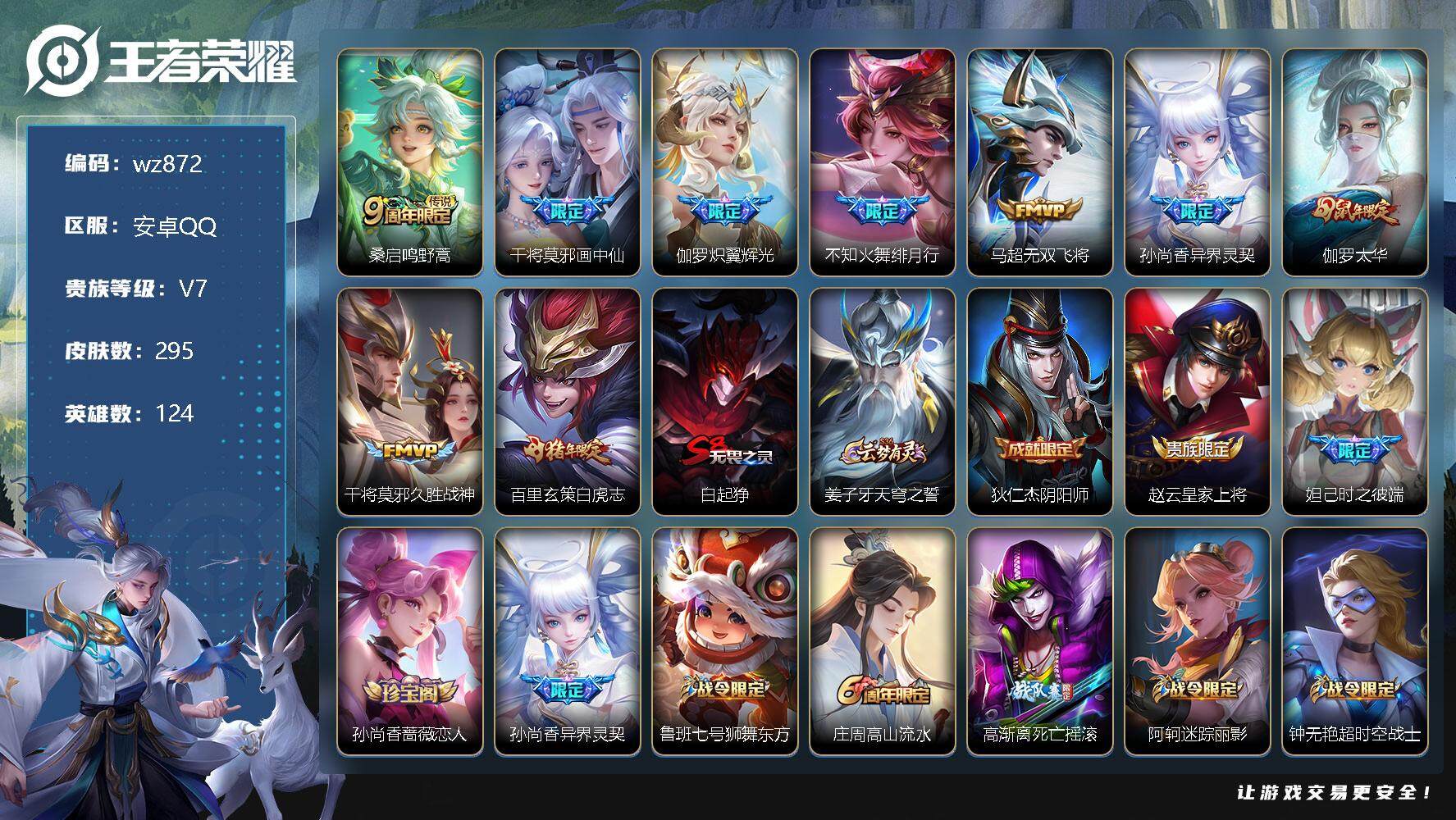 【云游堂】 【可二次实名】【wz872】【商品标题】:安卓Q-V7-永恒钻石III段位-124英雄-295皮肤-0典藏-0珍品无双-0无双-0珍品传说-9传说-89史诗 【传说皮肤】:桑启鸣野蒿,干将莫邪画中仙,伽罗炽翼辉光,不知火舞绯月行,马超无双飞将,孙尚香异界灵契,伽罗太华,干将莫邪久胜战神,百里玄策白虎志 【限定皮肤】:白起狰,姜子牙天穹之誓,狄仁杰阴阳师,赵云皇家上将,妲己时之彼端,孙尚香蔷薇恋人,孙尚香异界灵契,鲁班七号狮舞东方,庄周高山流水,高渐离死亡摇滚,阿轲迷踪丽影,钟无艳超时空战士,扁鹊炼金王,白起夜都怪侠,芈月幻夜卜梦,吕布御风骁将,周瑜赤莲之焰,元歌无心,夏侯惇朔风刀,甄姬落雪兰心,曹操烛龙,典韦穷奇,马可波罗暗影游猎,狄仁杰魔术师,狄仁杰万华元夜,达摩星际陆战队,达摩沙漠行僧,项羽海滩派对,老夫子醍醐杖,程咬金演武夺筹,刘邦夺宝奇兵,韩信飞衡,兰陵王驯魔猎人,兰陵王金庭之子,不知火舞绯月行,孙悟空至尊宝,孙悟空大圣娶亲,牛魔御旌,后羿圣弓游侠,李元芳银河之约,李元芳云中旅人,钟馗神迹守卫,钟馗驱傩正仪,杨玉环遇见飞天,杨玉环寅虎心曲,干将莫邪冰霜恋舞曲,干将莫邪胡桃夹子,干将莫邪真爱魔法,干将莫邪画中仙,雅典娜单词大作战,雅典娜黎明之约,蔡文姬繁星吟游,太乙真人饕餮,太乙真人华丽摇滚,鬼谷子原初探秘者,鬼谷子五谷丰年,黄忠火炮绅士,苏烈千军破阵,百里玄策白虎志,百里玄策原初追逐者,弈星混沌棋,梦奇顽趣,公孙离玉兔公主,沈梦溪星空之诺,沈梦溪大漠名商,明世隐疑决卦,明世隐吟游魔法,裴擒虎李小龙,裴擒虎擒涛扼浪,狂铁御狮,米莱狄御霄,米莱狄胡桃异想国,云中君纤云弄巧,伽罗太华,伽罗天狼溯光者,伽罗炽翼辉光,盾山御銮,猪八戒西部大镖客,猪八戒猪悟能,上官婉儿梁祝,上官婉儿天狼绘梦者,西施玲珑珍味,蒙犽狂想玩偶喵,鲁班大师探海日志,镜匿光追影者,桑启海盐诗旅,戈娅驭风魔法,艾琳女武神,阿古朵江河有灵,张良古海寻踪,蒙恬荣光圣徽,高渐离燃音魔法,妲己灵卜魔法,鬼谷子天穹祈灯,伽罗琥珀纪元,沈梦溪龙舞盛年,鲁班七号蔬乡物语,李元芳蔬乡物语 【年限皮肤】:百里玄策白虎志,杨玉环寅虎心曲,吕布御风骁将,伽罗太华,韩信飞衡,马超神威,伽罗炽翼辉光 【赛季限定】:扁鹊炼金王,白起狰,夏侯惇朔风刀,曹操烛龙,典韦穷奇,狄仁杰万华元夜,达摩沙漠行僧,老夫子醍醐杖,程咬金演武夺筹,兰陵王金庭之子,张良古海寻踪,牛魔御旌,李元芳云中旅人,钟馗驱傩正仪,雅典娜黎明之约,太乙真人饕餮,鬼谷子原初探秘者,苏烈千军破阵,百里玄策原初追逐者,弈星混沌棋,梦奇顽趣,沈梦溪大漠名商,明世隐疑决卦,裴擒虎擒涛扼浪,狂铁御狮,米莱狄御霄,盾山御銮,鲁班大师探海日志,桑启海盐诗旅,鬼谷子天穹祈灯,蒙恬荣光圣徽,姜子牙天穹之誓 【战令限定】:鲁班七号狮舞东方,阿轲迷踪丽影,钟无艳超时空战士,白起夜都怪侠,芈月幻夜卜梦,周瑜赤莲之焰,甄姬落雪兰心,马可波罗暗影游猎,达摩星际陆战队,刘邦夺宝奇兵,兰陵王驯魔猎人,后羿圣弓游侠,李元芳银河之约,钟馗神迹守卫,干将莫邪真爱魔法,雅典娜单词大作战,黄忠火炮绅士,沈梦溪星空之诺,明世隐吟游魔法,米莱狄胡桃异想国,猪八戒西部大镖客,西施玲珑珍味,蒙犽狂想玩偶喵,戈娅驭风魔法,高渐离燃音魔法,妲己灵卜魔法,鲁班七号蔬乡物语,李元芳蔬乡物语 【史诗皮肤】:鲁班七号电玩小子,露娜紫霞仙子,赵云皇家上将,貂蝉圣诞恋歌,甄姬冰雪圆舞曲,狄仁杰魔术师,宫本武藏鬼剑武藏,孙尚香蔷薇恋人,孙尚香水果甜心,妲己魅力维加斯,妲己女仆咖啡,墨子龙骑士,墨子金属风暴,吕布圣诞狂欢,刘禅绅士熊喵,曹操幽灵船长,李白千年之狐,吕布末日机甲,张飞乱世虎臣,韩信白龙吟,孙悟空至尊宝,花木兰水晶猎龙者,刘邦德古拉伯爵,夏侯惇乘风破浪,小乔缤纷独角兽,兰陵王暗隐猎兽者,诸葛亮黄金分割率,亚瑟心灵战警,安琪拉心灵骇客,百里守约特工魅影,蔡文姬舞动绿茵,刘禅天才门将,李元芳逐浪之夏,程咬金功夫厨神,白起星夜王子,阿轲节奏热浪,杨玉环遇见飞天,孙策猫狗日记,大乔猫狗日记,干将莫邪冰霜恋舞曲,孙悟空大圣娶亲,伽罗箭羽风息,鲁班七号狮舞东方,狄仁杰鹰眼统帅,兰陵王驯魔猎人,上官婉儿梁祝,蔡文姬繁星吟游,李元芳银河之约,韩信飞衡,妲己时之彼端,不知火舞魅语,阿轲迷踪丽影,瑶遇见神鹿,马超神威,孙尚香时之恋人,上官婉儿天狼绘梦者,马可波罗暗影游猎,蒙犽狂想玩偶喵,百里玄策原初追逐者,裴擒虎李小龙,云中君纤云弄巧,吕布御风骁将,米莱狄胡桃异想国,伽罗天狼溯光者,干将莫邪真爱魔法,猪八戒猪悟能,庄周高山流水,镜匿光追影者,黄忠火炮绅士,雅典娜黎明之约,杨玉环寅虎心曲,夏洛特永昼,公孙离玉兔公主,明世隐吟游魔法,钟无艳超时空战士,弈星滕王阁序,鬼谷子五谷丰年,元歌无心,梦奇顽趣,杨玉环银翎春