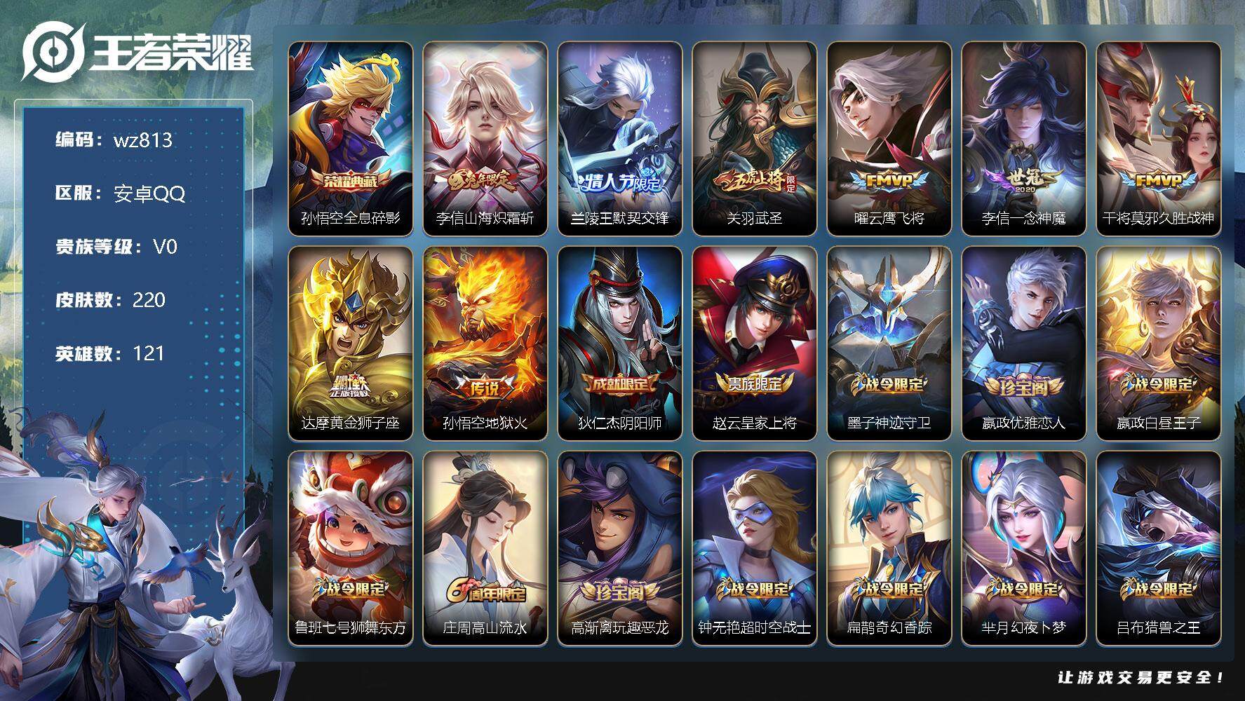 【云游堂】 【可二次实名】【wz813】【商品标题】:安卓Q-V0-尊贵铂金IV段位-121英雄-220皮肤-1典藏-0珍品无双-0无双-0珍品传说-8传说-69史诗 【荣耀典藏】:孙悟空全息碎影 【传说皮肤】:李信山海炽霜斩,兰陵王默契交锋,关羽武圣,曜云鹰飞将,李信一念神魔,干将莫邪久胜战神,达摩黄金狮子座,孙悟空地狱火 【限定皮肤】:狄仁杰阴阳师,赵云皇家上将,墨子神迹守卫,嬴政优雅恋人,嬴政白昼王子,鲁班七号狮舞东方,庄周高山流水,高渐离玩趣恶龙,钟无艳超时空战士,扁鹊奇幻香踪,芈月幻夜卜梦,吕布猎兽之王,吕布御风骁将,元歌无心,夏侯惇朔风刀,甄姬落雪兰心,马可波罗暗影游猎,狄仁杰魔术师,狄仁杰万华元夜,达摩沙漠行僧,项羽海滩派对,老夫子醍醐杖,老夫子航海奇遇记,关羽冰锋战神,关羽武圣,程咬金演武夺筹,兰陵王默契交锋,兰陵王金庭之子,花木兰青春决赛季,花木兰默契交锋,孙悟空至尊宝,孙悟空大圣娶亲,牛魔御旌,李元芳银河之约,李元芳云中旅人,钟馗神迹守卫,钟馗驱傩正仪,杨戬潮玩骑兵,雅典娜黎明之约,鬼谷子原初探秘者,鬼谷子五谷丰年,黄忠火炮绅士,铠青龙志,苏烈玄武志,苏烈千军破阵,百里玄策原初追逐者,弈星混沌棋,沈梦溪星空之诺,沈梦溪大漠名商,明世隐疑决卦,裴擒虎李小龙,裴擒虎擒涛扼浪,狂铁御狮,米莱狄御霄,李信山海炽霜斩,盾山御銮,猪八戒西部大镖客,猪八戒猪悟能,上官婉儿梁祝,鲁班大师探海日志,桑启海盐诗旅,阿古朵江河有灵,张良古海寻踪,鬼谷子天穹祈灯,沈梦溪龙舞盛年,周瑜熔金海岸 【年限皮肤】:铠青龙志,苏烈玄武志,吕布御风骁将,关羽武圣,李信山海炽霜斩 【赛季限定】:夏侯惇朔风刀,狄仁杰万华元夜,达摩沙漠行僧,老夫子醍醐杖,程咬金演武夺筹,兰陵王金庭之子,张良古海寻踪,牛魔御旌,李元芳云中旅人,钟馗驱傩正仪,雅典娜黎明之约,鬼谷子原初探秘者,苏烈千军破阵,百里玄策原初追逐者,弈星混沌棋,沈梦溪大漠名商,明世隐疑决卦,裴擒虎擒涛扼浪,狂铁御狮,米莱狄御霄,盾山御銮,鲁班大师探海日志,桑启海盐诗旅,鬼谷子天穹祈灯 【战令限定】:墨子神迹守卫,嬴政白昼王子,鲁班七号狮舞东方,钟无艳超时空战士,扁鹊奇幻香踪,芈月幻夜卜梦,吕布猎兽之王,甄姬落雪兰心,马可波罗暗影游猎,老夫子航海奇遇记,李元芳银河之约,钟馗神迹守卫,杨戬潮玩骑兵,黄忠火炮绅士,沈梦溪星空之诺,猪八戒西部大镖客 【史诗皮肤】:鲁班七号电玩小子,项羽苍穹之光,露娜紫霞仙子,赵云皇家上将,赵云未来纪元,貂蝉圣诞恋歌,甄姬冰雪圆舞曲,王昭君偶像歌手,狄仁杰魔术师,廉颇地狱岩魂,宫本武藏鬼剑武藏,孙尚香水果甜心,嬴政优雅恋人,嬴政摇滚巨星,妲己魅力维加斯,妲己女仆咖啡,墨子金属风暴,吕布圣诞狂欢,刘禅绅士熊喵,曹操幽灵船长,李白千年之狐,吕布末日机甲,张飞乱世虎臣,韩信白龙吟,关羽冰锋战神,孙悟空至尊宝,花木兰水晶猎龙者,刘邦德古拉伯爵,夏侯惇乘风破浪,小乔缤纷独角兽,兰陵王暗隐猎兽者,诸葛亮黄金分割率,亚瑟心灵战警,花木兰青春决赛季,百里守约特工魅影,铠曙光守护者,蔡文姬舞动绿茵,刘禅天才门将,李元芳逐浪之夏,程咬金功夫厨神,白起星夜王子,嬴政白昼王子,孙策猫狗日记,铠青龙志,孙悟空大圣娶亲,苏烈玄武志,伽罗箭羽风息,鲁班七号狮舞东方,狄仁杰鹰眼统帅,上官婉儿梁祝,李元芳银河之约,娜可露露晚萤,不知火舞魅语,橘右京修罗,马可波罗暗影游猎,百里玄策原初追逐者,裴擒虎李小龙,吕布御风骁将,花木兰默契交锋,老夫子航海奇遇记,杨戬天秀启明,猪八戒猪悟能,庄周高山流水,黄忠火炮绅士,雅典娜黎明之约,钟无艳超时空战士,鬼谷子五谷丰年,元歌无心,扁鹊奇幻香踪,阿古朵江河有灵 【其他皮肤】:项羽海滩派对,韩信教廷特使,韩信街头霸王,阿轲爱心护理,达摩大发明家,赵云白执事,赵云忍炎影,芈月红桃皇后,白起白色死神,扁鹊化身博士,宫本武藏未来纪元,安琪拉玩偶对对碰,孙膑天使之翼,姜子牙时尚教父,妲己少女阿狸,典韦黄金武士,亚瑟死亡骑士,达摩拳王,花木兰兔女郎,张飞五福同心,刘备万事如意,宫本武藏万象初新,狄仁杰阴阳师,刘备纽约教父,刘备汉昭烈帝,关羽龙腾万里,钟无艳海滩丽影,宫本武藏霸王丸,王昭君幻想奇妙夜,狂铁命运角斗场,老夫子功夫老勺,牛魔制霸全明星,孙尚香沉稳之力,诸葛亮掌控之力,鬼谷子幻乐之宴,狂铁御狮,苏烈坚韧之力,大乔守护之力,项羽科学大爆炸,米莱狄御霄,吕布猎兽之王,明世隐虹云星官,牛魔御旌,钟馗神迹守卫,盾山御銮,孙膑归虚梦演,高渐离玩趣恶龙,沈梦溪鲨炮海盗猫,姜子牙炽热元素使,夏侯惇朔风刀,沈梦溪星空之诺,弈星混沌棋,哪吒次元突破,明世隐疑决卦,盾山圆桌骑士,老夫子醍醐杖,猪八戒西部大镖客,狂铁特工战影,廉颇无尽征程,鬼谷子原初探秘者,狄仁杰万华元夜,杨戬次元傲视,程咬金演武夺筹,张良缤纷绘卷