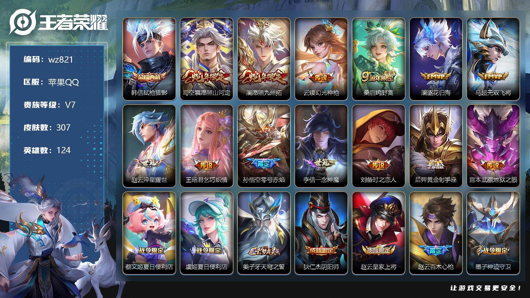 【云游堂】 【可二次实名】【wz821】【商品标题】:苹果Q-V7-最强王者段位-124英雄-307皮肤-1典藏-0珍品无双-0无双-0珍品传说-13传说-108史诗 【荣耀典藏】:韩信弑枪猎影 【传说皮肤】:司空震愿照山河定,澜愿照九州拓,云缨幻光神枪,桑启鸣野蒿,澜逐花归海,马超无双飞将,赵云淬星耀世,王昭君乞巧织情,孙悟空零号赤焰,李信一念神魔,刘备时之恋人,后羿黄金射手座,宫本武藏地狱之眼 【限定皮肤】:蔡文姬夏日便利店,虞姬夏日便利店,姜子牙天穹之誓,狄仁杰阴阳师,赵云皇家上将,赵云百木心枪,墨子神迹守卫,孙尚香蔷薇恋人,鲁班七号乒乒小将,庄周高山流水,高渐离玩趣恶龙,白起夜都怪侠,芈月幻夜卜梦,元歌云间偶戏,元歌无心,典韦岱宗,马可波罗暗影游猎,狄仁杰魔术师,狄仁杰万华元夜,达摩星际陆战队,达摩沙漠行僧,项羽海滩派对,老夫子醍醐杖,老夫子航海奇遇记,关羽冰锋战神,程咬金演武夺筹,王昭君午后时光,兰陵王金庭之子,亚瑟潮玩骑士王,孙悟空至尊宝,孙悟空零号赤焰,孙悟空孙行者,后羿圣弓游侠,李元芳云中旅人,钟馗驱傩正仪,干将莫邪真爱魔法,雅典娜黎明之约,蔡文姬繁星吟游,鬼谷子原初探秘者,鬼谷子五谷丰年,黄忠火炮绅士,铠青龙志,苏烈千军破阵,百里玄策原初追逐者,梦奇顽趣,沈梦溪大漠名商,裴擒虎李小龙,裴擒虎擒涛扼浪,狂铁电玩高手,米莱狄胡桃异想国,云中君纤云弄巧,伽罗天狼溯光者,猪八戒西部大镖客,上官婉儿梁祝,嫦娥拒霜思,蒙犽狂想玩偶喵,鲁班大师探海日志,桑启海盐诗旅,艾琳流音漫舞,司空震地狱燃心,阿古朵江河有灵,张良古海寻踪,蒙犽百解令,蒙恬荣光圣徽,高渐离燃音魔法,妲己灵卜魔法,鬼谷子天穹祈灯,伽罗琥珀纪元,沈梦溪龙舞盛年,鲁班七号蔬乡物语,李元芳蔬乡物语,刘邦剑破天穹,镜青焰无极,项羽苍威无极,周瑜熔金海岸 【年限皮肤】:铠青龙志,典韦岱宗,马超神威 【赛季限定】:狄仁杰万华元夜,达摩沙漠行僧,老夫子醍醐杖,程咬金演武夺筹,兰陵王金庭之子,张良古海寻踪,李元芳云中旅人,钟馗驱傩正仪,雅典娜黎明之约,鬼谷子原初探秘者,苏烈千军破阵,百里玄策原初追逐者,梦奇顽趣,沈梦溪大漠名商,裴擒虎擒涛扼浪,鲁班大师探海日志,桑启海盐诗旅,鬼谷子天穹祈灯,蒙恬荣光圣徽,刘邦剑破天穹,姜子牙天穹之誓 【战令限定】:墨子神迹守卫,蔡文姬夏日便利店,虞姬夏日便利店,白起夜都怪侠,芈月幻夜卜梦,元歌云间偶戏,马可波罗暗影游猎,达摩星际陆战队,老夫子航海奇遇记,王昭君午后时光,艾琳流音漫舞,亚瑟潮玩骑士王,后羿圣弓游侠,干将莫邪真爱魔法,黄忠火炮绅士,狂铁电玩高手,米莱狄胡桃异想国,猪八戒西部大镖客,蒙犽狂想玩偶喵,司空震地狱燃心,高渐离燃音魔法,妲己灵卜魔法,鲁班七号蔬乡物语,李元芳蔬乡物语,镜青焰无极,项羽苍威无极 【史诗皮肤】:鲁班七号电玩小子,项羽苍穹之光,露娜紫霞仙子,阿轲暗夜猫娘,赵云皇家上将,赵云未来纪元,貂蝉圣诞恋歌,甄姬冰雪圆舞曲,王昭君偶像歌手,狄仁杰魔术师,廉颇地狱岩魂,宫本武藏鬼剑武藏,孙尚香蔷薇恋人,孙尚香水果甜心,嬴政暗夜贵公子,嬴政摇滚巨星,妲己魅力维加斯,妲己女仆咖啡,墨子龙骑士,墨子金属风暴,吕布圣诞狂欢,刘禅绅士熊喵,曹操幽灵船长,李白千年之狐,吕布末日机甲,张飞乱世虎臣,关羽冰锋战神,孙悟空至尊宝,花木兰水晶猎龙者,刘邦德古拉伯爵,夏侯惇乘风破浪,小乔缤纷独角兽,兰陵王暗隐猎兽者,诸葛亮黄金分割率,亚瑟心灵战警,雅典娜冰冠公主,安琪拉心灵骇客,百里守约特工魅影,铠曙光守护者,蔡文姬舞动绿茵,刘禅天才门将,李元芳逐浪之夏,程咬金功夫厨神,白起星夜王子,阿轲节奏热浪,孙策猫狗日记,大乔猫狗日记,铠青龙志,伽罗箭羽风息,狄仁杰鹰眼统帅,公孙离无限星赏官,上官婉儿梁祝,蔡文姬繁星吟游,典韦岱宗,大乔白蛇,马超神威,马可波罗暗影游猎,蒙犽狂想玩偶喵,百里玄策原初追逐者,裴擒虎李小龙,云中君纤云弄巧,元歌云间偶戏,米莱狄胡桃异想国,西施诗语江南,老夫子航海奇遇记,伽罗天狼溯光者,鲁班七号乒乒小将,杨戬天秀启明,干将莫邪真爱魔法,钟馗乐园奇幻夜,孙悟空孙行者,庄周高山流水,司马懿暗渊魔法,嫦娥拒霜思,黄忠火炮绅士,雅典娜黎明之约,赵云百木心枪,澜赏金猎手,狂铁电玩高手,鬼谷子五谷丰年,元歌无心,梦奇顽趣,刘禅电玩爆裂旋风,司空震地狱燃心,阿古朵江河有灵,蒙犽百解令,周瑜雪夜绮愿,妲己灵卜魔法,高渐离燃音魔法,蒙恬荣光圣徽,伽罗琥珀纪元,鲁班七号蔬乡物语,镜青焰无极,蔡文姬夏日便利店,大司命东方月初,亚连破空之剑,艾琳陌上桑,百里守约百相守梦,牛魔星界战将,孙膑茶境仙,弈星万物之道,赵怀真器灵浮梦炉,阿轲化蝶舞,刘禅鸭鸭历险记,狂铁龙之律动,扁鹊灵蛊蚀心,周瑜百相守梦,黄忠百相守梦,公孙离涂山容容 【其他皮肤】:项羽海滩派对,韩信教廷特使,韩信街