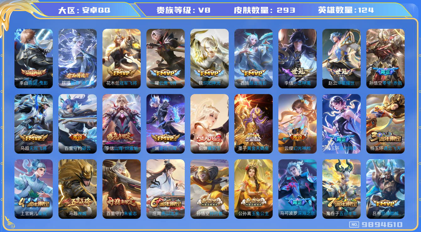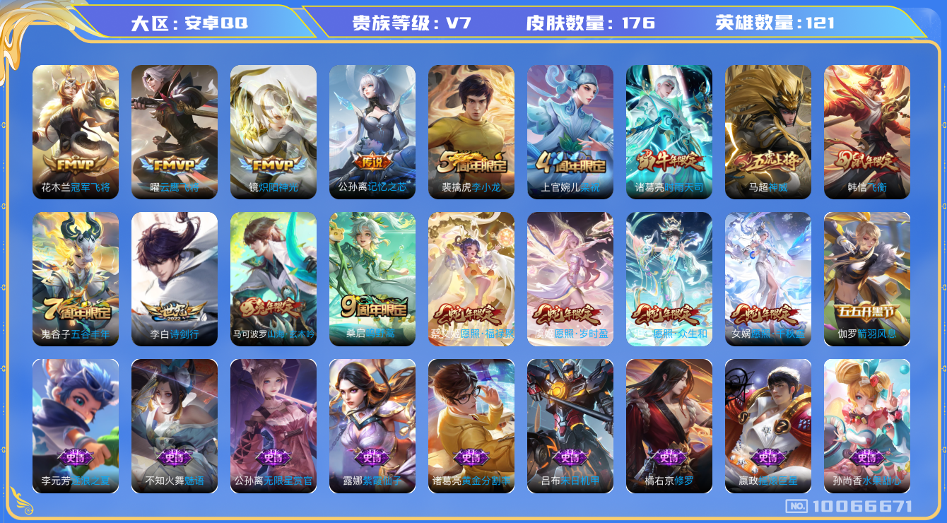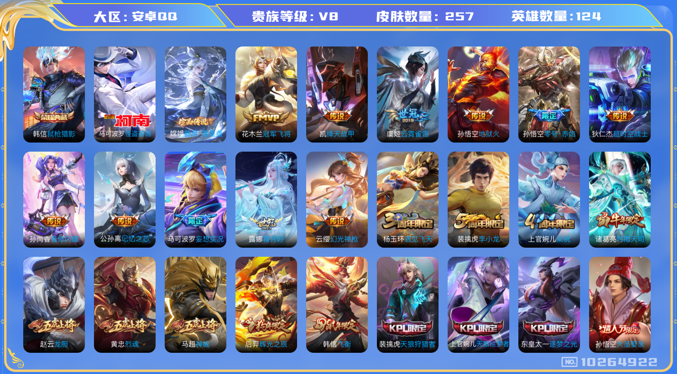 【云游堂】 【可二次实名】[10066671]hswz10332hswz10332安卓q-v-176皮肤11传说 神威 愿照岁时盈 愿照千秋盛 愿照众生和 愿照福禄聚 鸣野蒿 时雨天司 山海玄木吟 飞衡 星空之诺 银河之约 记忆之芯 暗影游猎 诗剑行 原初追逐者 黎明之约 死神来了 梁祝 狂想玩偶喵 暗夜猫娘 炽阳神光 云鹰飞将 冠军飞将 未来纪元赵云 电玩爆裂旋风 无限星赏官 原初探秘者 李小龙 水晶猎龙者 暗隐猎兽者 金属风暴 特工魅影 曙光守护者 黄金分割率 优雅恋人 逐浪之夏 修罗 魅语 千年之狐 紫霞仙子 功夫厨神 心灵骇客 圣诞恋歌 幽灵船长 乘风破浪 圣诞狂欢 末日机甲男 星夜王子 永昼 街头霸王 箭羽风息 摇滚巨星 缤纷独角兽 鬼剑武藏 赤莲之焰 单词大作战 冰雪圆舞曲 花好人间 烛龙 重明 穷奇 御狮 御銮 朔风刀 混沌棋 疑决卦 醍醐杖 万华元夜 演武夺筹 驱傩正仪 千军破阵 拳王 沙漠行僧 金庭之子 大漠名商 敏锐之力 云中旅人 海盐诗旅 皇家上将 擒涛扼浪 魅力维加斯 探海日志 水果甜心 古海寻踪 天穹祈灯 迷踪丽影 超时空战士钟无艳 无心 荣光圣徽 纤云弄巧 五谷丰年 鹰眼统帅 魔术师 顽趣梦奇 121英雄-营地id:424790069