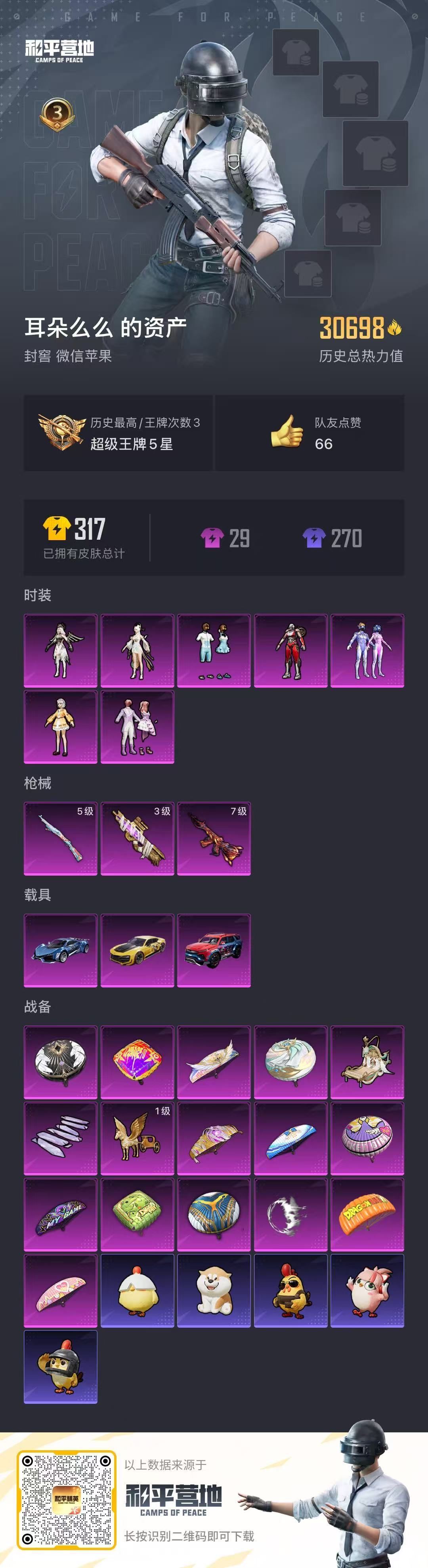【云游堂】 【可二次实名】zy苹果q区热力值46455-4粉装-3粉呛-2载具,6粉色战备,111套装,124呛械,138装备,4滑翔尾翼,25降落伞; 等级:lv.66 历史最高段位:超级王牌6星 当前段位:坚韧.铂金ⅱ;王牌印记5次; 【粉色套装】:粉装-木曜青龙,粉装-梦幻火箭,粉装-蝶舞迷情,粉装-草莓生巧;【粉色呛械】:scar-l-梦幻火箭[4级],m416-五爪金龙[6级],kar98k-巳巳如意[2级];【粉色载具】:阿斯顿马丁dbs(绿),双人摩托-梦幻火箭;【粉色滑翔尾翼】:梦幻火箭飞行器,春暖花开飞行器;【粉色降落伞】:梦幻火箭降落伞,精灵迷巫降落伞,春暖花开降落伞,夏日绵绵冰降落伞;【其他套装】:套装-特训学院,套装-猎鹰,套装-橘黑制服,套装-红色运动,套装-黄色运动,套装-蓝色运动,套装-黑色伏地魔,套装-骑行爱好者,套装-竞技名士,套装-酒红色名流,套装-湖蓝色名流,套装-黄色名流,套装-猛禽,套装-长空猛禽,套装-竞技勇士朋克,套装-蓝色守护者,套装-刚毅裁决者,套装-战地菁英,套装-甜蜜告白,套装-滨海假日,套装-完美偶像,套装-人气偶像,套装-街头潮人,套装-蓝彩潮人,套装-千禧之恋,套装-怒火燎原,套装-魅力单车,套装-绮丽涂鸦,套装-耀眼新星,套装-坚韧舞者,套装-竞技达人朋克,套装-狂沙舞者,套装-破晓战魂,套装-丛林猎人,套装-雪山精英,套装-传奇侦探,套装-幻世战舞者,套装-缤纷果语,套装-滨海厨神,套装-冰川特警,套装-破蛋小黄鸡,套装-疯狂小兔子,套装-深蓝冒险家,套装-无畏开拓者,套装-迷域探索者,套装-阳光火鸡,套装-北国孤狼,套装-ss6特训,套装-拳皇97八神庵,套装-炽焰拳师,套装-格斗专家,套装-星光纪元,套装-奇迹天团,套装-仓鼠灰灰,套装-淡雅花蕊,套装-玲珑飞花,套装-跃动心情,套装-ss7特训,套装-黑色刀锋,套装-核芯基因,套装-精神漫游,套装-银河圣歌,套装-霓虹街区,套装-清香五月粽,套装-软嫩糖心蛋,套装-ss10特训,套装-ss8特训,
