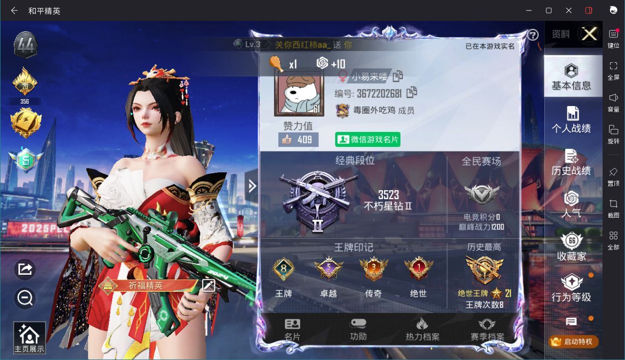 【云游堂】 【可二次实名】3级梦海之灵!光圈螳螂!合金龙骨(绿)!火箭少女!小金鞋!可二次!D10641.安卓微信.2红装24粉装7载具17粉枪.336扭蛋碎片.营地id:727718950. 【热力值】144472【粉色套装】套装-甜心巧克力/套装-天使彩虹糖/套装-梦幻火箭/套装-蝶舞迷情/套装-金属狂野/套装-新星烈龙/套装-向日葵/套装-冰霜白皇/套装-炙焰红王/套装-星之彼岸/套装-暗夜玫瑰/套装-寒光使者/套装-冰川幽秘/套装-海螺星光/套装-第五大道/套装-飒粉甜心/套装-炫光之旅/套装-机械师花傲天/角色-电磁星/角色-守护天翼/角色-初号机 觉醒Ver./套装-创世·救赎/角色-千金淑猫/套装-星穹咏叹调 【粉色枪皮】M416-心之恋语[7级]/M762-甜蜜誓约[7级]/AKM-炫紫旋律[7级]/SCAR-L-童趣迷兔[7级]/M416-墨龙九天[3级]/GROZA-精灵之光[2级]/GROZA-旋转彩虹[4级]/AUG-暖羊咩咩[5级]/Kar98K-巳巳如意[5级]/AWM-橘柚倾心[5级]/AMR-智耀战神[4级]/M200-梦海之灵[3级]/Mk14-盛世惊鸿[3级]/UMP45-量子极限[5级]/平底锅-林间仙鹿[6级]/烟雾弹-猫咪绅士[3级]/破片手榴弹-粉粉猫爪[4级] 【载具】合金龙骨(绿)/仰望U8(龙石绿)/特斯拉Roadster(沁心粉)/幽焰风驰摩托车/星梦玉骢/护世瑞兽 【飞行器】神秘黑猫飞行器/繁花小夜曲飞行翼/甜蜜誓约飞行器/深渊漩涡飞行器/凤舞九天飞行器/幽焰列车飞行器[1级]/幻海仙踪飞行器[1级]/鸿潮鸣舰飞行器/齐天大圣飞行器/沙丘之主天马[1级]/星梦奇缘飞行器/幻海精灵飞行器[1级]/酣梦熊熊飞行器/绮梦青鸾飞行器/镜域双华-灵镜之阶/千面幻镜飞行器/龙翔九天飞行器[2级]/祥瑞起舞飞行器 【珍稀背包】百万伏特背包(3级)/洛神天依背包(3级)