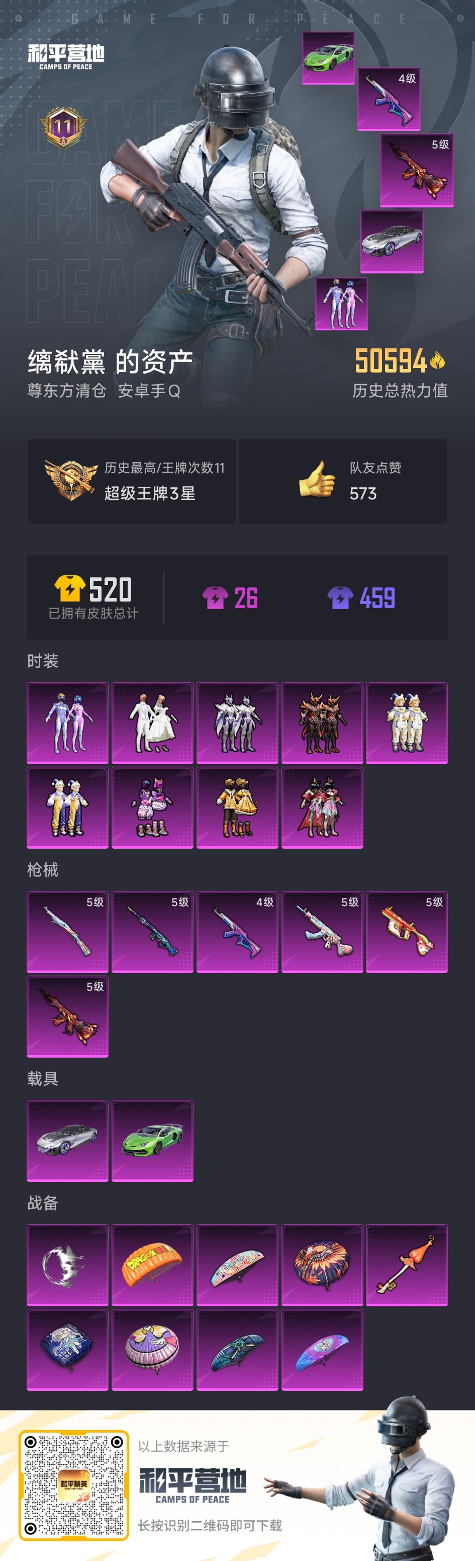 【云游堂】 【可包人脸】木乃伊!稻草人!奇异狩猎者!可二次!D10643.安卓微信.253套装20粉装285枪皮8粉枪3车.和平营地id:548137077.---连体王者V8!199区228皮1水17传说. 【稀有资产】角色-零款战斗服/木乃伊套装/套装-奇异狩猎者/套装-暗夜魅影/套装-雪山精英/套装-龟仙人/套装-迅捷狂鲨/套装-浪漫波比/角色-六号稻草人/套装-花面小丑/套装-奇迹天团/M416-仓鼠灰灰 【粉色套装】套装-梦幻火箭/套装-华贵君王/套装-PEL轰鸣竞梦者/套装-金属狂野/套装-智能音符/套装-缤纷油彩/套装-向日葵/套装-极致幻想/套装-山涧鹿灵/角色-洛天依/ 【粉色枪皮】AKM-炫紫旋律[4级]/M24-星之信仰[4级]/SCAR-L-梦幻火箭[7级]/M416-风花雪月[7级]/AUG-妙趣可丽[6级][5级]/M249-绒雪飘舞[4级]/MG3-洛神天依[4级] 【载具】特斯拉Model 3(冷光银)/双人摩托-梦幻火箭/兰博基尼Aventador SVJ(翡翠绿) 【飞行器】梦幻火箭飞行器/PEL轰鸣竞梦者飞行器/齐天大圣飞行器/风花雪月飞行器 【珍稀背包】百万伏特背包(2级)/洛神天依背包(3级)/ 王者营地id:2136732844.金色天幕一个灿若星河.1个星传说.未来机甲.荣耀典藏一个赤影疾锋.17个传说上海炽霜斩.诗剑行.绯月行.碎云.枫霜尽.启示之音.寅虎瑞焰.音你心动.祈雪灵祝.绛天战甲.启明星使.零号赤焰.时之恋人.猫影幻舞.久胜战神.