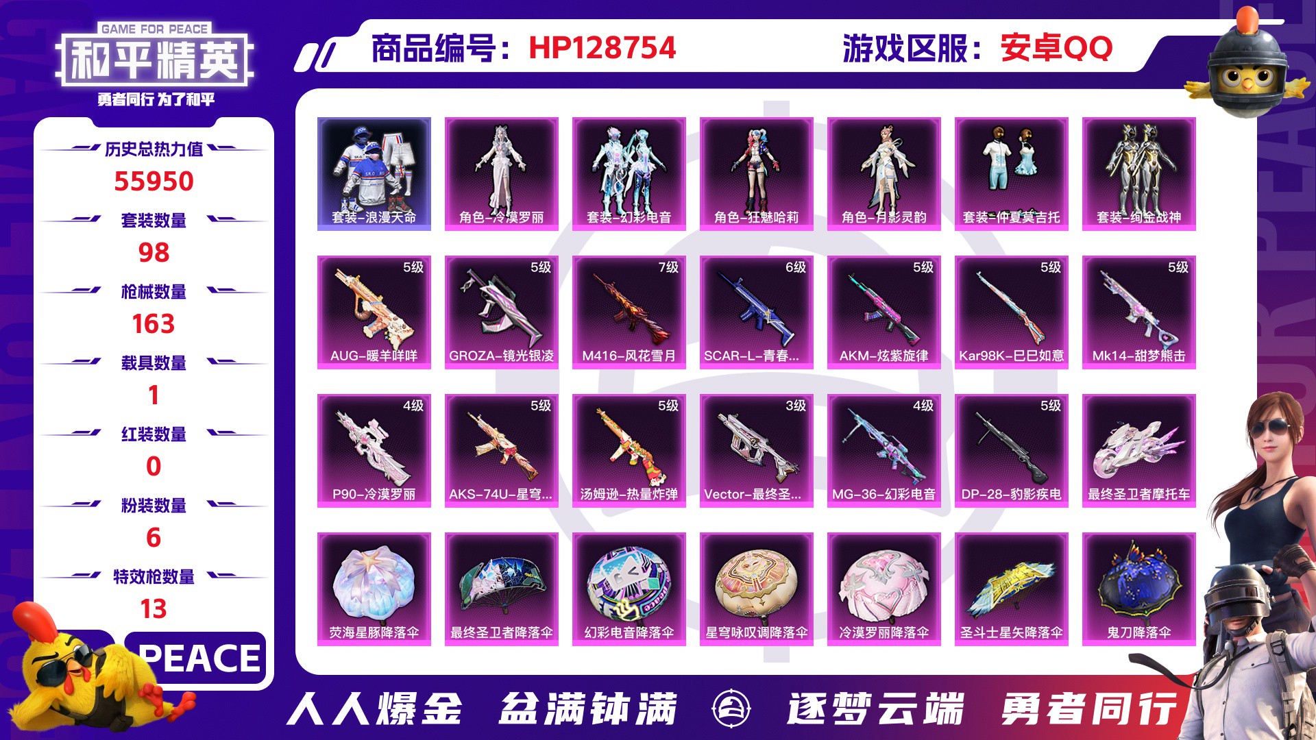 【云游堂】 【可二次实名】2109650-(可二次实名)苹果q-115252热力值15王牌印记历史无敌战神(ss32战神框地铁满天赋雪国巧克力猪妹小狐萌萌小番茄马卡龙兔兔白日梦小黄鸭圆圆喜羊羊发光眼罩粉熊包都市赤蝎金鞋)249套装286呛皮【2载具】最终圣卫者摩托车俏皮小熊猫【6稀有】奇异狩猎者赤蝎幽灵都市猎人浪漫天命派对舞王派对舞王(金靴子)【35粉装】梦幻火箭小蓝美琪雪国幻梦奇迹舞步美琪绯穹魔姬宝贝奶油派天使彩虹糖甜心巧克力千金淑猫金丰海韵星穹咏叹调太空嘟嘟缤纷油彩放客神游星空武士第五大道新星烈龙花间之火童趣迷兔冰霜白皇炙焰红王暖熊萌萌霞光圣骑甜梦小狐冰川红玫蜜桃特工海盐物语山涧鹿灵彩虹鹿灵天之羽翼寒光使者黄伞悠悠黑伞漫漫碧影闪光【16特效呛】m416-电玩时刻(5级)m416-灵猫魔法师(3级)kar98k-巳巳如意(5级)dp-28-豹影疾电(3级)svd-月影灵韵(2级)aug-暖羊咩咩(5级)mk14-甜梦熊击(5级)amr-智耀战神(5级)m24-镜域双华(3级)groza-巴啦啦小魔仙(7级)scar-l-童趣迷兔(7级)ump45-相思残雪(7级)akm-梦之光华(5级)m249-蓝莓炮弹(7级)平底锅-林间仙鹿(7级)破片手留单-瓶中星球(7级)【3飞行器】暖熊萌萌飞行器星夜魔法师飞行翼天之羽翼飞行器【31热门】mark.06龟仙人红熊茄茄雪山精英动感兔斯基潮萌小黄鸭爱崽白熊呆萌铁蟹万圣娃娃鹰眼刺客兔兔白日梦奶芙汪汪激萌罗小黑迅捷狂鲨深海小丑鱼胖达圆圆胖达团团暗影哥特团圆交子瑞龙福将星河浪客漫步者韶华初心破蛋小黄鸡极速红龙英勇保护者弄潮海豚m762-奇异狩猎者m762-瑞龙福将s686-奇异狩猎者mk47-林间仙鹿【5头盔】梦幻火箭头盔雪国精灵头盔甜心宝贝头盔深海小丑鱼头盔花间之火头盔【5背包】梦幻火箭背包雪国精灵背包甜心宝贝背包萌熊伴侣背包深海小丑鱼背包营地id:762534724