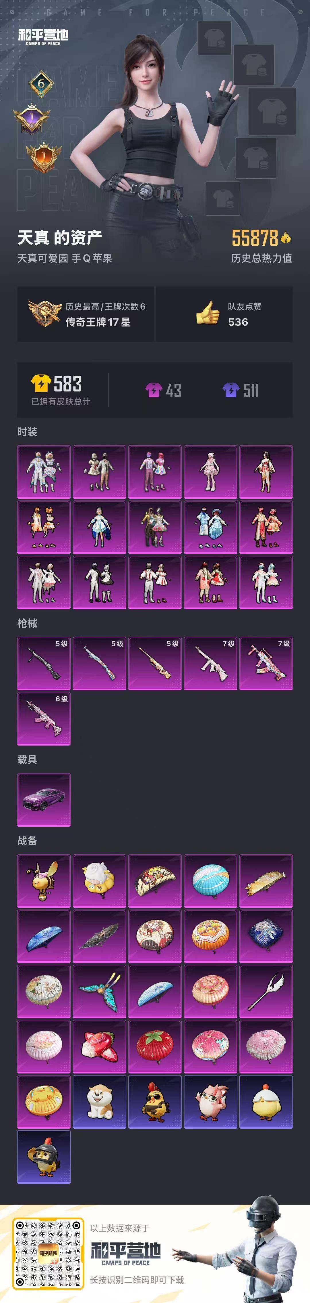 【云游堂】 【可二次实名】兰博基尼Estoque(银翼灰)!小白龙!梦幻火箭!洛天依!满级心之恋语!D10590.IOS微信77套装19粉装2载具82枪皮8粉枪7飞行器.4.5万热力值. 178扭蛋碎片.营地ID:775944792. 【稀有资产】套装-胖达圆圆/套装-暗夜魅影/套装-粉红小猪 【粉色套装】套装-梦幻火箭/套装-新星烈龙/套装-林间仙鹿/套装-彩虹鹿灵/套装-山涧鹿灵/角色-洛天依/套装-齐天大圣/套装-银龙傲海/套装-暗夜玫瑰/套装-吟月归客/套装-蓝莓炮弹/套装-恐龙拽拽/套装-焦糖拿铁/套装-绚金瑰梦/套装-薄荷物语/套装-海盐物语/套装-霁雪冰心/套装-寒光使者/套装-灵感创作师 【粉色枪皮】M416-心之恋语[7级]/AKM-百合蜜语[2级]/SCAR-L-青春物语[3级]/SLR-暗夜玫瑰[1级]/UMP45-恐龙拽拽[6级]/M249-蓝莓炮弹[1级]/MG3-洛神天依[1级]/平底锅-林间仙鹿[1级] 【载具】特斯拉Roadster(沁心粉)/兰博基尼Estoque(银翼灰) 【飞行器】梦幻火箭飞行器/四圣焕新飞行器/齐天大圣飞行器/林间仙鹿飞行器/星夜魔法师飞行翼/绮梦青鸾飞行器/绚金瑰梦飞行器 【珍稀背包】洛神天依背包(3级)/