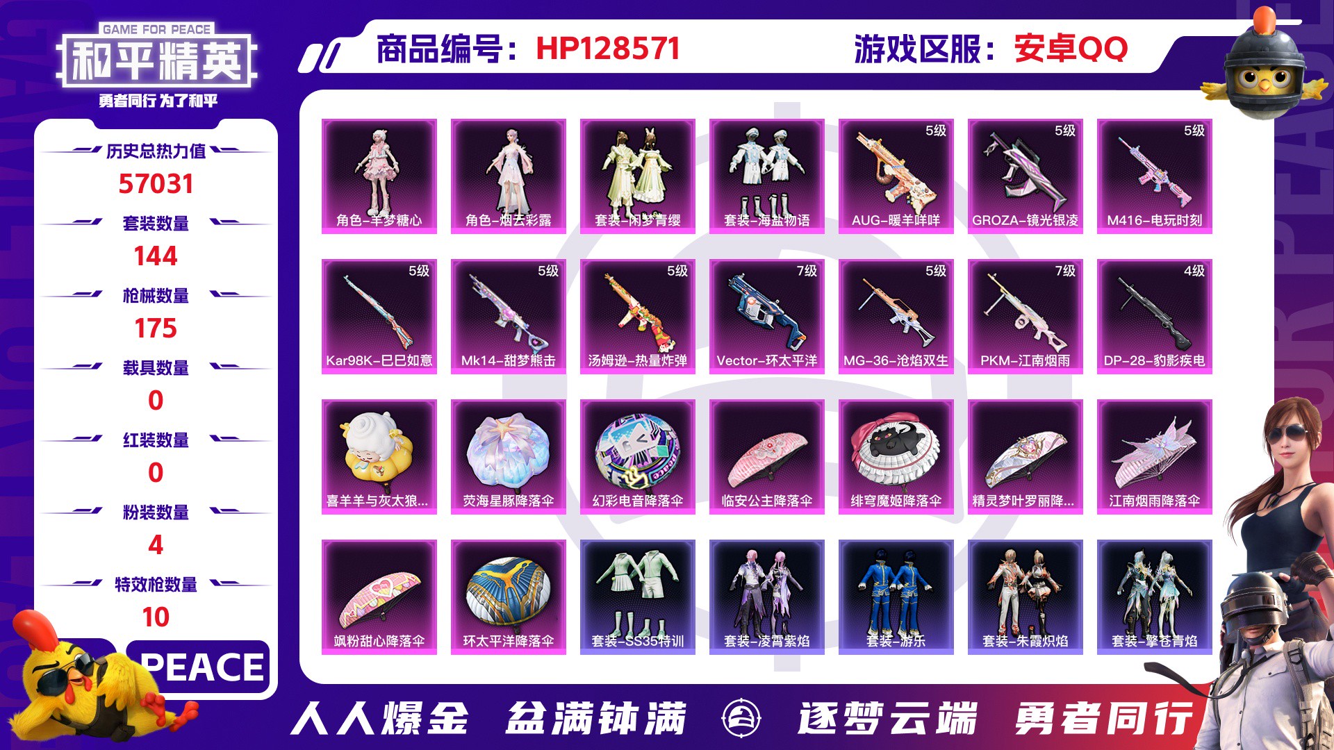【云游堂】 【可二次实名】2182463-安卓qq历史总热力值:57031粉装数量:4特效呛数量:10王牌印记:10历史最高段位:超级王牌13星套装数量:144时装数量:551呛械数量:175战备数量:130装备数量:204时装:套装-海盐物语套装-闲梦青缨角色-烟云彩露角色-羊梦糖心套装-ss14特训套装-ss15特训套装-ss16特训套装-ss17特训套装-ss18特训套装-ss19特训套装-ss20特训套装-ss21特训套装-ss22特训套装-ss23特训套装-ss24特训套装-ss25特训套装-ss27特训套装-ss28特训套装-ss29特训套装-ss30特训套装-ss31特训套装-ss32特训套装-ss33特训套装-ss34特训套装-ss35特训套装-云朵鹅套装-人气偶像套装-光之冒险套装-冷焰舞者套装-凌霄紫焰套装-凛冬战士套装-圣诞惊喜套装-夏日音浪套装-大橘大利套装-娇憨猪猪套装-完美偶像套装-巳巳如意套装-幻世战舞者套装-幻影武者套装-幻羽潜行套装-幽夜迷踪套装-异域银装套装-弄潮海豚套装-彩虹兔套装-恋语绒绒套装-战地督导套装-战术大师套装-探宝勇士套装-擎苍青焰套装-星影赞美诗套装-星河浪客套装-星渊小夜曲套装-智谋强哥套装-曼妙人鱼套装-朱霞炽焰套装-极地朋克套装-极速红龙套装-柠萌假日套装-格斗先锋套装-梦魇先生套装-森林游猎者套装-橘黑制服套装-海岛探路者套装-海盐绵绵冰套装-深蓝色名流套装-游乐套装-湖蓝色名流套装-滨海厨神套装-潮流炫酷套装-灼焰舞者套装-热情海星套装-热血青春套装-焰鹰斗篷套装-燕燕于飞套装-牛气冲天套装-牛气满满套装-特种颜团子套装-特训学院套装-猎梦纪元套装-猎鹰套装-猛禽套装-玉兔迎春套装-王牌教练套装-甜心亚梦套装-田园牧歌套装-疯狂小兔子套装-白熊同盟套装-白色伏地魔套装-破晓战魂套装-破蛋小黄鸡套装-福星高照套装-空投萌叽套装-竞技名士套装-竞技达人朋克套装-粉日山川套装-粉红小猪套装-红色运动套装-纯真浪花套装-绮丽涂鸦套装-绯格组合套装-缤纷果语套装-耀粉歌者套装-荧惑魅影套装-萌趣咩咩套装-萌趣颜团子套装-萌黄之夏套装-蓝彩潮人套装-蓝色运动套装-虎虎生威吉莉套装-虚音幻奏套装-蝶变套装-街头潮人套装-街头风暴套装-覆海蛟龙套装-轻风白浪套装-都市魅力套装-酒红色名流套装-长空猛禽套装-雪山精英套装-雪绒豹套装-霓虹街区套装-青年教官套装-顶瓜瓜套装-飞行日记套装-飞驰魅影套装-骑行爱好者套装-魅力单车套装-鱼渊荷华套装-麻辣教官套装-黄色伏地魔套装-黄色名流套装-黄色运动套装-黑色伏地魔套装-龙的传人套装-龙魂突击队玩偶服-美羊羊角色-临安公主角色-军刀雅典娜角色-湖雨初晴角色-灵公主角色-白光莹角色-英勇保护者角色-蝶吟花词角色-许七安呛械:aug-暖羊咩咩(5级)groza-镜光银凌(5级)m416-电玩时刻(5级)ac-val-天降萌叽ac-val-甜心亚梦akm-彩虹符号akm-江南烟雨akm-环太平洋akm-破晓战魂akm-萌趣颜团子akm-虎虎生威akm-霓彩脉冲akm-龙的传人arx-凌霄紫焰aug-天降萌叽aug-异域银装aug-海螺星光aug-耀粉歌者g36c-星穹咏叹调g36c-炙焰牛王groza-彩虹符号groza-无面战甲groza-田园牧歌m16a4-冰河战士m16a4-幻世战舞者m16a4-甜心亚梦m16a4-电光马卡龙m416-糯团青竹m416-蓝色火焰m762-云朵鹅m762-天降萌叽m762-奇异狩猎者m762-彩虹符号m762-甜心宝贝m762-萌物绒绒mk47-乌木金纹mk47-百万伏特qbz-彩虹符号qbz-纯真浪花scar-l-星途旅人scar-l-海盐豹豹scar-l-玉兔迎春蜜獾-天降萌叽蜜獾-娇憨猪猪kar98k-巳巳如意(5级)amr-喜羊羊与灰太狼awm-焰鹰斗篷awm-纯真浪花kar98k-彩虹符号kar98k-炫彩节奏kar98k-顶峰精英m24-幻彩电音m24-影袭svd-云朵鹅莫辛纳甘-乌木金纹mk14-甜梦熊击(5级)m417-玩趣呆呆mk20-h-星途旅人mini14-炫彩节奏mini14-香桃花海mk14-乌木金纹mk14-冰河战士sks-炫彩节奏slr-娇憨猪猪slr-彩虹符号slr-月影鸳鸯vss-田园牧歌vect-环太平洋(7级)汤姆逊-热量炸弹(5级)aks-74u-鸡智如我js9-凌霄紫焰mp5k-飒粉甜心p90-巳巳如意p90-玩趣呆呆p90-金蛇镇世ump45-夜灯ump45-海盐豹豹ump45-生命誓言ump45-蓝色火焰uzi-冰河战士uzi-天降萌叽uzi-娇憨猪猪uzi-炫彩节奏vect-创世·救赎vect-彩虹符号vect-焰鹰斗篷vect-燕燕于飞vect-田园牧歌汤姆逊-天降萌叽汤姆逊-樱桃泡泡汤姆逊-环太平洋汤姆逊-纯真浪花汤姆逊-耀粉歌者野牛-燕燕于飞aa12-g-纯真浪花dbs-焰鹰斗篷dbs-甜心亚梦s12k-夜灯s12k-娇憨猪猪s12k-幻世战舞者s12k-智耀战神s12k-玩趣呆呆s12k-破晓战魂s12k-霓彩脉冲s1897-星夜魔法师s1897-炫彩节奏s1897-精灵梦叶罗丽s1897-糯团青竹s686-奇异狩猎者s686-巳巳如意s686-彩虹符号s686-红色方程式spas-12-云朵鹅spas-12-燕燕于飞spas-12-田园牧歌dp-28-豹影疾电(4级)mg-36-沧焰双生(5级)pkm-江南烟雨(7级)dp-28-彩虹符号dp-28-焰鹰斗篷dp-28-甜心亚梦m249-彩虹符号m249-无面战甲m249-破晓战魂m249-糯团青竹mg-36-凌霄紫焰mg3-乌木金纹mg3-幻世战舞者mg3-惊鸿侠骨pkm-啾咪啾咪pkm-明月桂语p18c-竞速先锋p1911-无面战甲p92-凌霄紫焰tmp-9-江南烟雨tmp-9-霓彩节奏沙墨之鹦-云朵鹅短管霰弹-竹节火铳蝎式手呛-燕燕于飞大砍刀-云朵鹅大砍刀-黑金刀平底锅-光之冒险平底锅-凌霄紫焰平底锅-娇憨猪猪平底锅-焰鹰斗篷平底锅-甜心亚梦平底锅-田园牧歌平底锅-空岛之星平底锅-纯真浪花平底锅-许七安撬棍-幻世战舞者撬棍-环太平洋十子怒-异域银装十子怒-燕燕于飞战术弩-江南烟雨破片手留单-巳巳如意破片手留单-拽到爆炸破片手留单-萌趣颜团子战备:临安公主降落伞喜羊羊与灰太狼降落伞幻彩电音