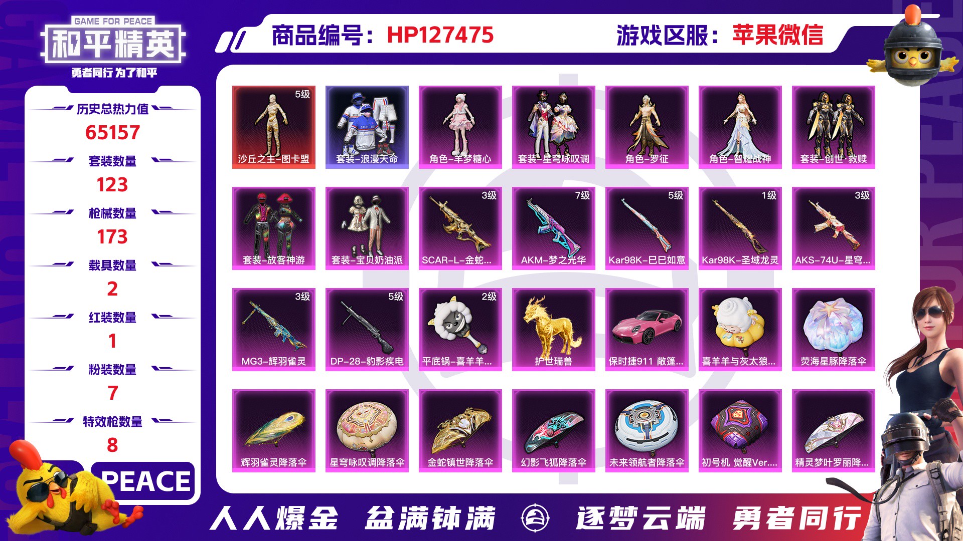 【云游堂】 【可二次实名】2181078-苹果微信历史总热力值:65157红装数量:1粉装数量:7特效呛数量:8载具数量:2王牌印记:10历史最高段位:绝世王牌17星套装数量:123时装数量:488呛械数量:173战备数量:146装备数量:220载具:保时捷911敞篷版(星珀红)护世瑞兽时装:沙丘之主-图卡盟(5级)套装-创世·救赎套装-宝贝奶油派套装-放客神游套装-星穹咏叹调角色-智耀战神角色-罗征角色-羊梦糖心套装-alanwalker套装-lgd追光队服套装-ss19特训套装-ss1特训套装-ss24特训套装-ss25特训套装-ss26特训套装-ss27特训套装-ss28特训套装-ss29特训套装-ss2特训套装-ss30特训套装-ss31特训套装-ss32特训套装-ss33特训套装-ss34特训套装-ss35特训套装-云朵鹅套装-元气之梦套装-光之冒险套装-冥星暗影套装-冰冻风暴套装-冰河战士套装-凌霄紫焰套装-刚毅裁决者套装-华灯初上套装-吉莉礼服套装-呆萌铁蟹套装-圣穹绘梦套装-大橘大利套装-小熊娃娃套装-小鸟芋圆套装-巳巳如意套装-幻羽潜行套装-幽夜迷踪套装-异域银装套装-彩虹兔套装-快闪甜心套装-恋语绒绒套装-懵萌河马套装-战地菁英套装-战术大师套装-擎苍青焰套装-旭日情侣套装-明鸳圣池套装-星影赞美诗套装-星渊小夜曲套装-星途旅人套装-春光漫游套装-春日漫步套装-智谋强哥套装-暗金炫舞套装-朱霞炽焰套装-棉花软糖套装-浪漫天命套装-海岛探路者套装-海滨突袭者套装-海盐绵绵冰套装-深海小丑鱼套装-游乐套装-漫步者套装-漫游都市套装-火种守卫者套装-热情海星套装-焰鹰斗篷套装-燃烧卡路里套装-燕燕于飞套装-甜蜜告白套装-白色伏地魔套装-破蛋小黄鸡套装-神气柴柴套装-空岛之星套装-竞技名士套装-竞技达人朋克套装-粉恋花套装-糖糖葫芦套装-紫幽梦套装-纯真浪花套装-缤纷果语套装-老实芭蕉套装-萝兰蝴蝶套装-蓝冰羽套装-蓝色运动套装-蓝调潮人套装-薄荷星砂套装-蝶变套装-街头风暴套装-贝斯之夜套装-都市猎人套装-酷萌兔限定套装-铁血战翼套装-长空猛禽套装-雏菊兔兔套装-雪绒豹套装-霓虹街区套装-青团波波套装-青玉碎影套装-顶瓜瓜套装-香桃花海套装-魅力单车套装-鱼渊荷华套装-鹰眼刺客套装-黑色伏地魔套装-龙魂突击队套装-龟仙人玩偶服-喜羊羊玩偶服-憨乐熊二玩偶服-懒羊羊玩偶服-美羊羊玩偶服-酷勇熊大角色-mark.06角色-多纳泰罗角色-湖雨初晴角色-都市丽猫角色-风玲呛械:akm-梦之光华(7级)scar-l-金蛇镇世(3级)ac-val-乌木金纹ac-val-快闪甜心akm-影袭akm-江南烟雨akm-涂鸦街区akm-霓彩脉冲akm-龙的传人arx-凌霄紫焰aug-异域银装aug-甜蜜菠萝aug-紫晶流影aug-金蛇镇世famas-镜域双华g36c-懵萌河马g36c-星穹咏叹调groza-影袭groza-懵萌河马groza-春暖花开groza-海盐豹豹groza-生命誓言m16a4-冰河战士m762-云朵鹅m762-雏菊兔兔qbz-未来歌姬qbz-纯真浪花scar-l-夜灯scar-l-彩虹符号scar-l-星途旅人scar-l-海盐豹豹蜜獾-天降萌叽蜜獾-精灵梦叶罗丽蜜獾-糖糖葫芦蜜獾-鸡智如我kar98k-圣域龙灵(1级)kar98k-巳巳如意(5级)amr-喜羊羊与灰太狼amr-鬼刀amr-鸡智如我awm-焰鹰斗篷awm-纯真浪花kar98k-影袭kar98k-星穹咏叹调kar98k-炫彩节奏kar98k-顶峰精英m200-六号稻草人m24-影袭svd-云朵鹅svd-冷漠罗丽win94-拳皇·狂花道win94-晶梦幻蝶莫辛纳甘-懵萌河马m417-玩趣呆呆mk12-金蛇镇世mk20-h-快闪甜心mk20-h-星途旅人mk20-h-糖糖葫芦mini14-炫彩节奏mini14-辉羽雀灵mini14-雏菊兔兔mini14-香桃花海mini14-鸡智如我mk14-冰河战士mk14-紫幽梦mk14-薄荷星砂slr-圣穹绘梦vss-香桃花海aks-74u-星穹咏叹调(3级)aks-74u-辉羽雀灵aks-74u-鸡智如我js9-凌霄紫焰p90-巳巳如意p90-快闪甜心p90-玩趣呆呆p90-金蛇镇世ump45-圣穹绘梦ump45-夜灯ump45-海盐豹豹ump45-糖糖葫芦ump45-金玉无双uzi-冰河战士uzi-影袭uzi-生命誓言vect-焰鹰斗篷vect-燕燕于飞vect-生命誓言汤姆逊-纯真浪花野牛-沙丘之主野牛-燕燕于飞野牛-雏菊兔兔aa12-g-纯真浪花dbs-焰鹰斗篷s12k-夜灯s12k-守护天翼s12k-霓彩脉冲s1897-糯团青竹s1897-紫幽梦s686-千金淑猫s686-彩虹符号s686-生命誓言spas-12-云朵鹅spas-12-燕燕于飞dp-28-豹影疾电(5级)mg3-辉羽雀灵(3级)dp-28-alanwalker潮音版dp-28-焰鹰斗篷m249-彩虹符号m249-无面战甲m249-金丰海韵mg-36-凌霄紫焰mg3-霓彩脉冲pkm-啾咪啾咪pkm-懵萌河马pkm-紫幽梦p18c-糖糖葫芦p1911-无面战甲p92-凌霄紫焰p92-紫幽梦r1895-雏菊兔兔r45-拳皇·狂花道沙墨之鹦-云朵鹅沙墨之鹦-圣穹绘梦沙墨之鹦-快闪甜心电击呛-喜羊羊与灰太狼短管霰弹-圣域龙灵短管霰弹-星穹咏叹调蝎式手呛-六号稻草人蝎式手呛-千金淑猫蝎式手呛-燕燕于飞平底锅-喜羊羊与灰太狼(2级)大砍刀-云朵鹅大砍刀-鬼刀平底锅-凌霄紫焰平底锅-属我最6平底锅-快闪甜心平底锅-懵萌河马平底锅-焰鹰斗篷平底锅-空岛之星平底锅-糖糖葫芦平底锅-紫幽梦平底锅-纯真浪花平底锅-辉羽雀灵平底锅-雏菊兔兔撬棍-alanwalker潮音版撬棍-朗基努斯之呛撬棍-沙丘之主权杖撬棍-火尖呛十子怒-异域银装十子怒-燕燕于飞盐雾蛋-冰氧夏日燃点复合弓-火尖莲影爆炸猎弓-喜羊羊与灰太狼破片手留单-呆爆全场破片手留单-巳巳如意破片手留单-星途旅人破片手留单-海盐豹豹突击盾牌-初号机觉醒ver.战备:初号机觉醒ver.降落伞喜羊羊与灰太狼降落伞圣堂之誓降落伞幻影飞狐降落伞忍者神龟降落伞星穹咏叹调降落伞未来歌姬降落伞未来领航者降落伞江南烟雨降落伞碧影闪光降落伞精灵梦叶罗丽降落伞荧海星豚降落伞辉羽雀灵
