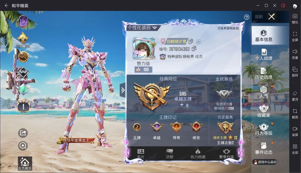 【云游堂】 【可二次实名】女号!暖熊萌萌!冷漠罗丽!猪脸!M416女娲灵识!D10859.安卓QQ.112套装12粉装116枪皮5粉枪.满级P90金丰海韵.4.8万热力值.冰川幽秘.特权卡余300天. 【稀有资产】套装-晶辉守护/玩偶服-小狗蛇点点/角色-摩登魅猫/套装-绒宝小鹅/角色-冰公主 【粉色套装】套装-静灵氛围/套装-缤纷油彩/套装-彩虹鹿灵/套装-暖熊萌萌/套装-冰川幽秘/角色-小可学妹/套装-闲梦青缨/角色-茉莉星/角色-烟云彩露/角色-小蓝/套装-雪月幻音/角色-冷漠罗丽 【粉色枪皮】M416-女娲灵识[3级]/Kar98K-巳巳如意[5级]/P90-金丰海韵[7级]/M249-彩虹甜喵[5级]/MG3-酷泡奶龙[6级] 【飞行器】童趣迷兔飞行器/雀灵庇佑飞行器