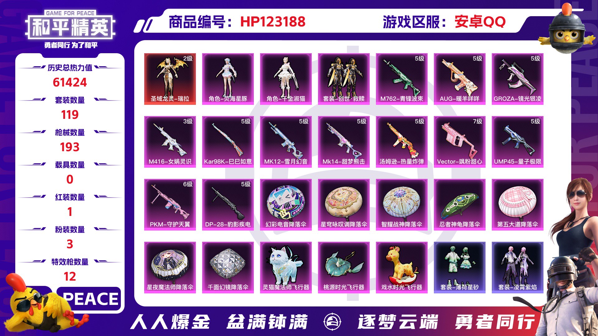 【云游堂】 【可二次实名】光圈螳螂!第五大道!满级m416风花雪月!5.8万热力值!d10576.安卓qq.139套装13粉装156呛皮4粉呛6飞行器.美琪美雪.天使彩虹糖. 【稀有】角色-8号机/角色-mark.06/套装-胖达圆圆/套装-浪漫天命/套装-潮萌小黄鸭/套装-雪山精英/套装-暗影哥特/套装-龟仙人/套装-胖达团团/套装-兔兔白日梦/套装-狂沙舞者/套装-狂战萌兔 【粉色套装】套装-天使彩虹糖/套装-冰霜白皇/套装-彩虹鹿灵/套装-山涧鹿灵/套装-相思残雪/套装-海盐物语/角色-呆萌星弥/角色-白勺歌姬/套装-第五大道/角色-美雪/角色-美琪/角色-守护天翼/角色-初号机 觉醒ver. 【粉色呛皮】scar-l-时空协奏[3级]/m416-风花雪月[7级]/groza-镜光银凌[5级]/kar98k-巳巳如意[5级] 【飞行器】深渊漩涡飞行器/冠军兔兔飞行器/拂晓神骑飞行器/萌物绒绒飞行器 【珍稀背包】洛神天依背包(1级)/