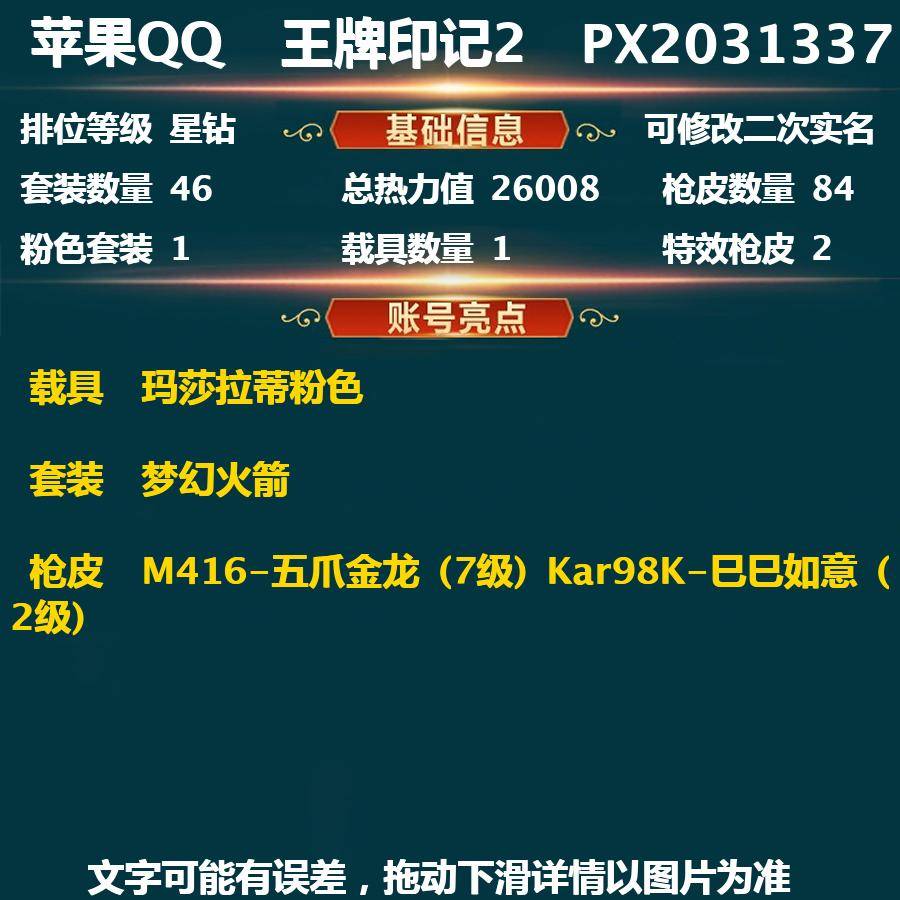 【云游堂】 【可二次实名】2031337-(可二次实名)(玛莎小号粉玛莎梦幻火箭满级五爪金龙)苹果q-26008热力值2王牌印记历史超级王牌2星46套装84呛皮【1载具】玛莎拉蒂粉色【1粉装】梦幻火箭【2特效呛】m416-五爪金龙(7级)kar98k-巳巳如意(2级)【3热门】团圆交子瑞龙福将m762-瑞龙福将【1背包】梦幻火箭背包营地id:774335767