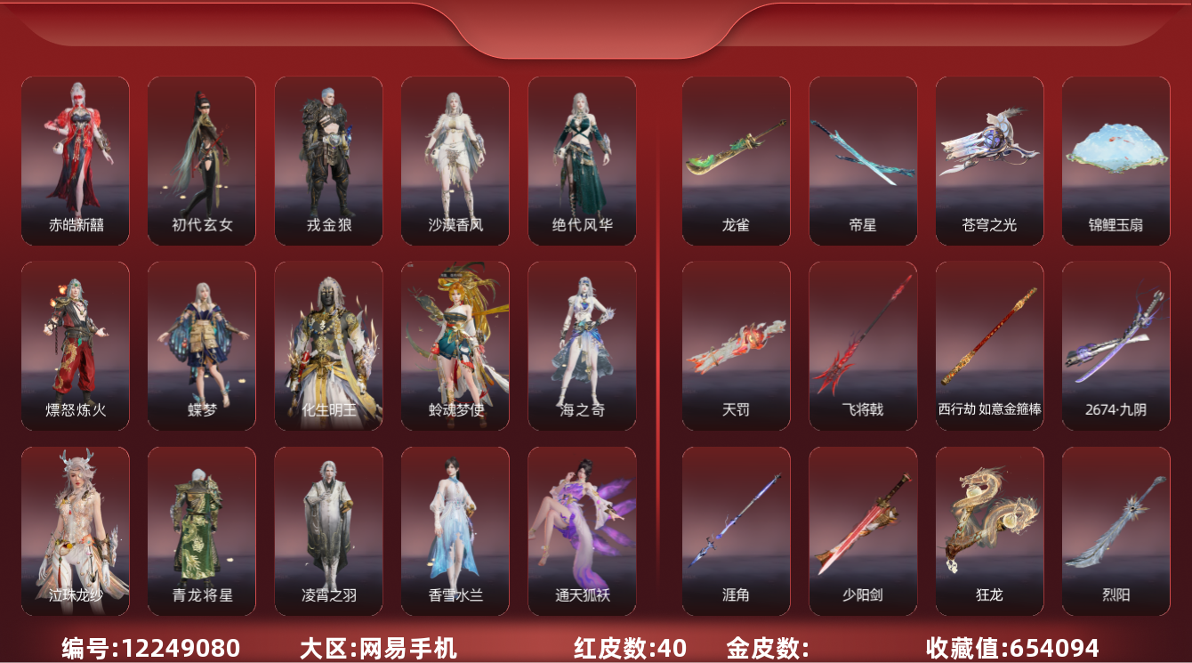 【云游堂】 R43839 网易【手机】【20红】【赤皓新囍+初代玄女+星辉魔纱+化生明王+戎金狼+熛怒炼火+泣珠龙纱+沙漠香风+监兵凶神+化道者】【少阳剑+帝星+狼主+悍虎斩+飞将戟+如意金箍棒+天琼+锦鲤玉扇+逆晦朔+天罚】【飞鼠】【初代机+珥冰+荆魂+神君印+蛤蟆头+夜蔷薇+噬骨+霜翎】【山川润+秋藏桂+观山海腓腓+长夏清澜+龙之影精武魂+星空投影+昭夏流金+蛤蟆头领+喜缘红线+妲己+日月明+雪铃绮歌】【毛乎乎+2674超越型+腾云歌+合金双劫+诡月+雨歇】详情请看图片【卖号买号首选亿梦】【11月20号可换绑】